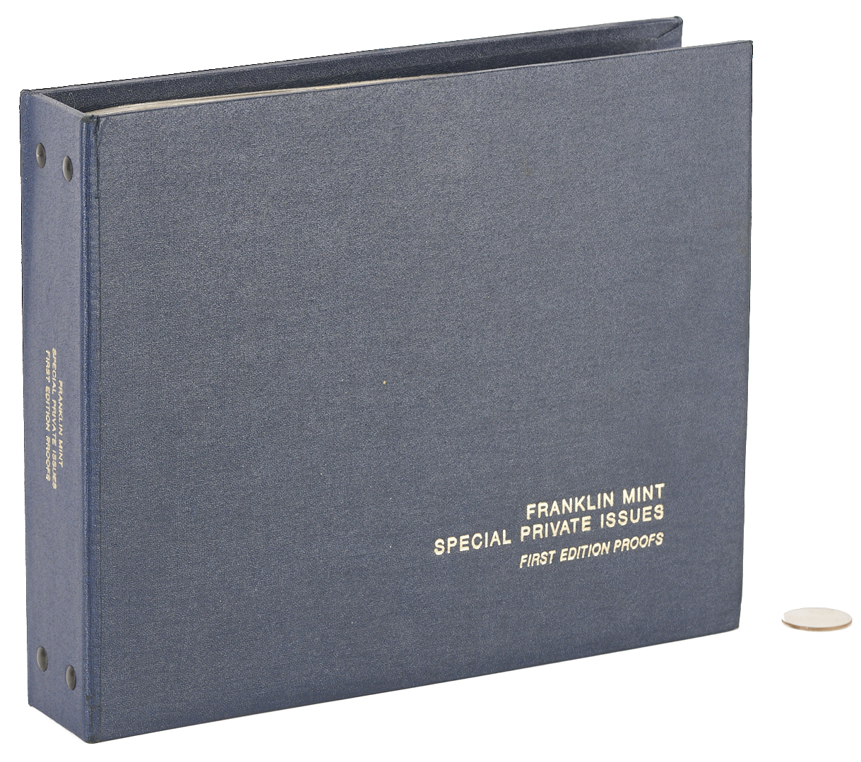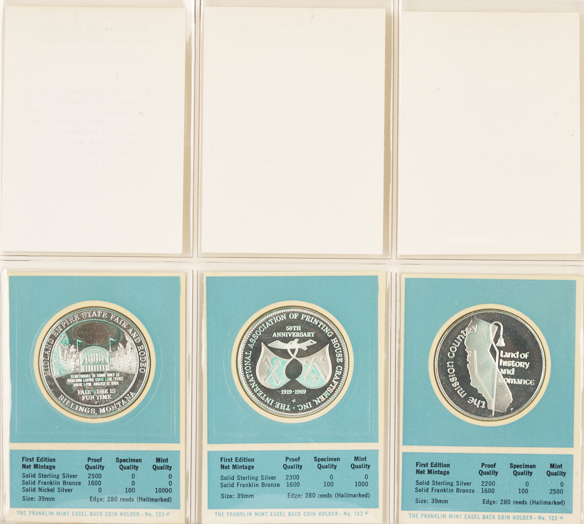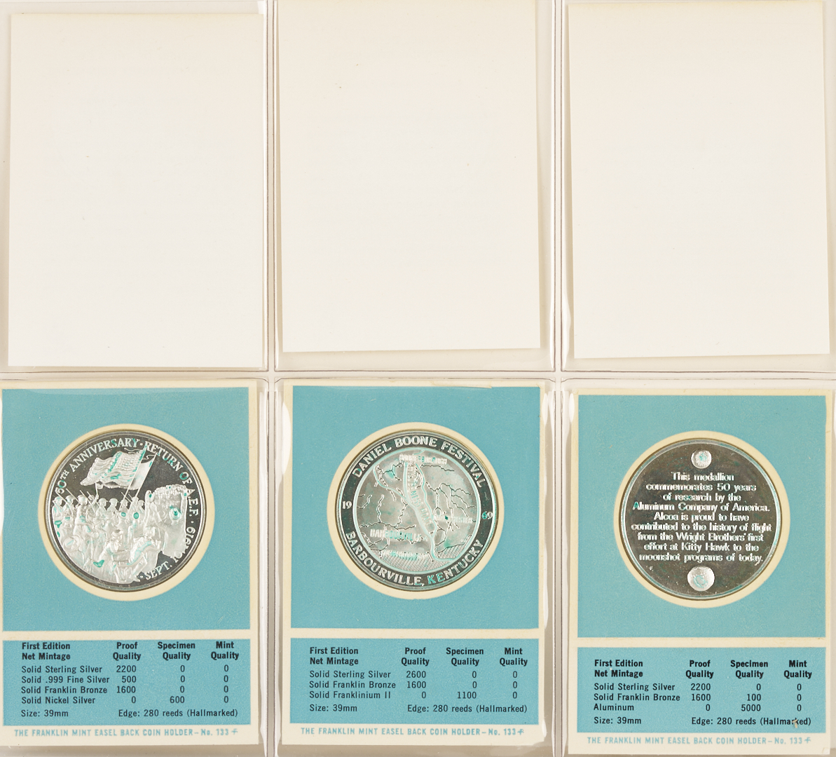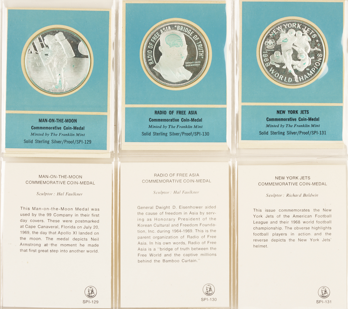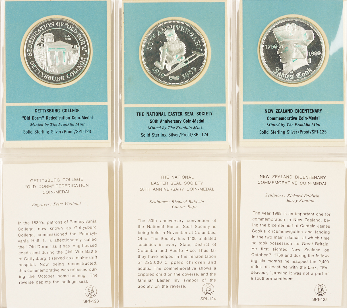 Fifty-one (51) Franklin Mint National Commemorative Society Special Private Issue First Edition Proof sterling silver rounds, housed in a navy blue album. Each round is accompanied by a brief write-up and depicts various artists, places, events, etc. in American history. Each round weighs approximately 0.6 troy ounces and measures approximately 1 in.– 1 1/2 in. (40 mm) in dia. Total weight: approx 30.6 troy ounces. Album measures: 10 in. L x 8 in. W x 2 in. D.