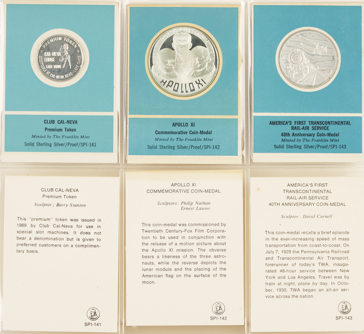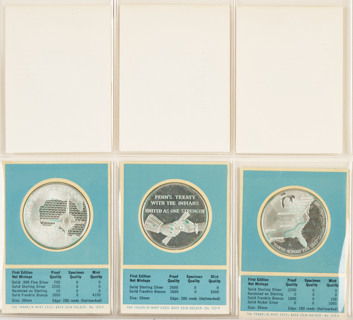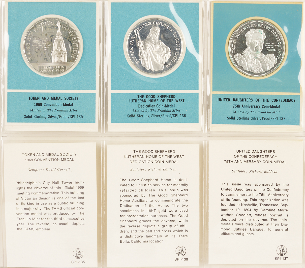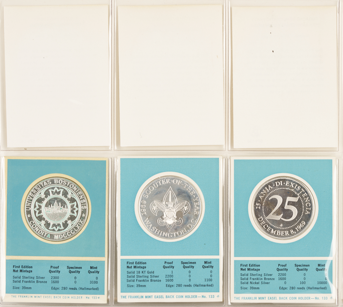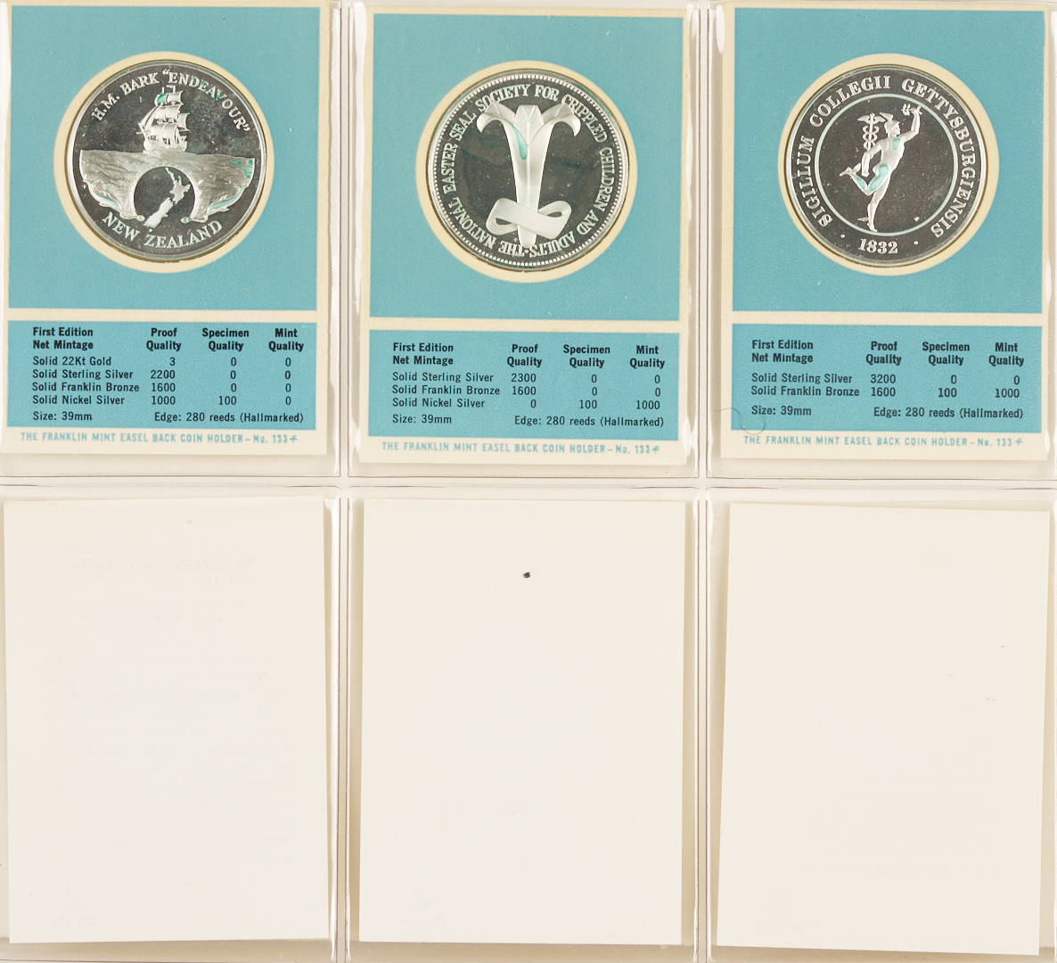 Fifty-one (51) Franklin Mint National Commemorative Society Special Private Issue First Edition Proof sterling silver rounds, housed in a navy blue album. Each round is accompanied by a brief write-up and depicts various artists, places, events, etc. in American history. Each round weighs approximately 0.6 troy ounces and measures approximately 1 in.– 1 1/2 in. (40 mm) in dia. Total weight: approx 30.6 troy ounces. Album measures: 10 in. L x 8 in. W x 2 in. D.