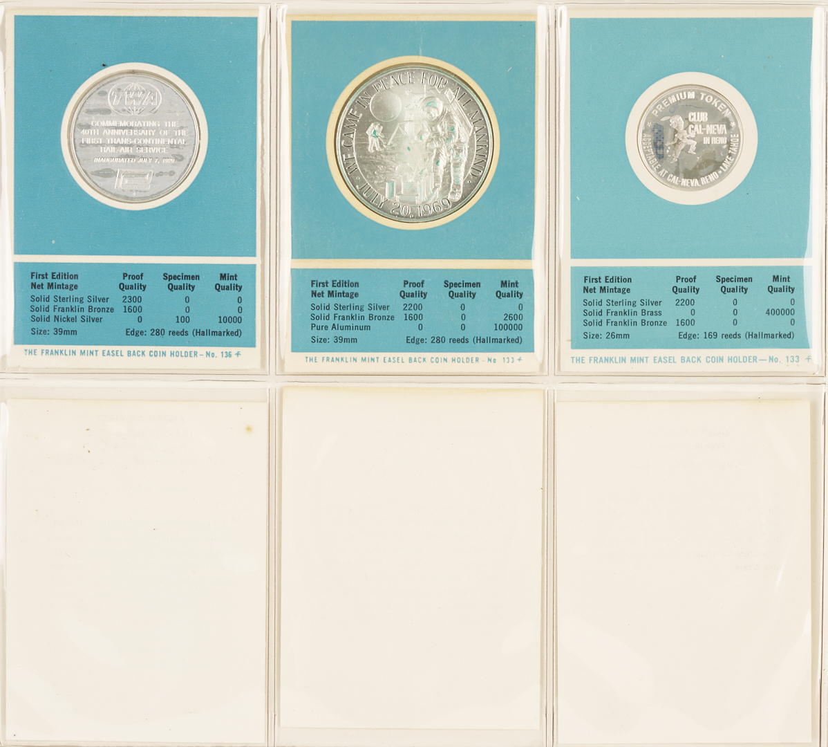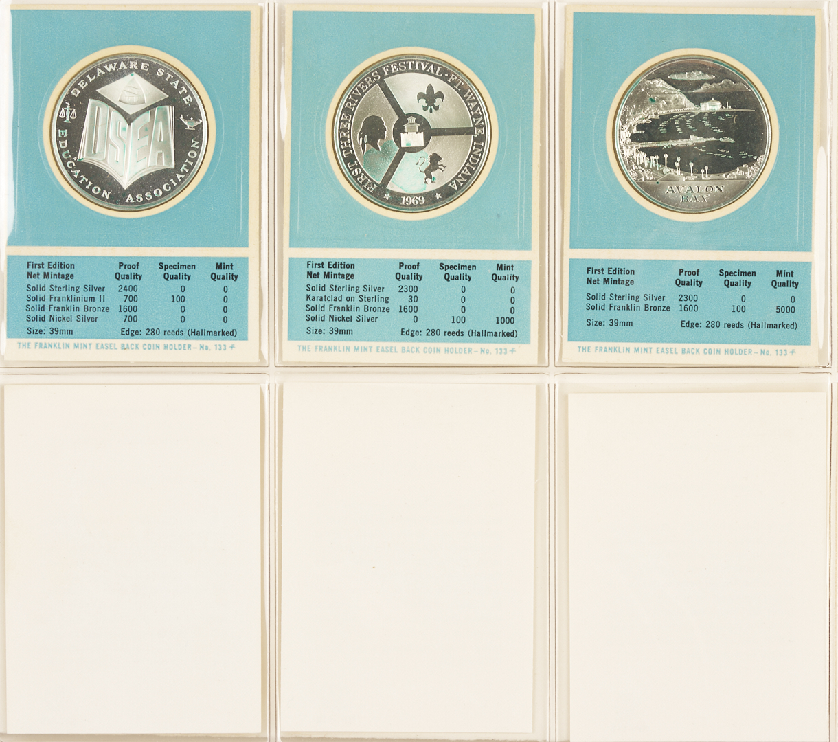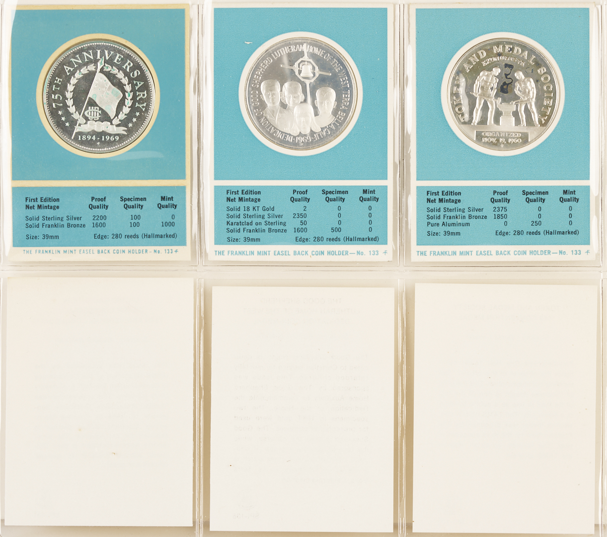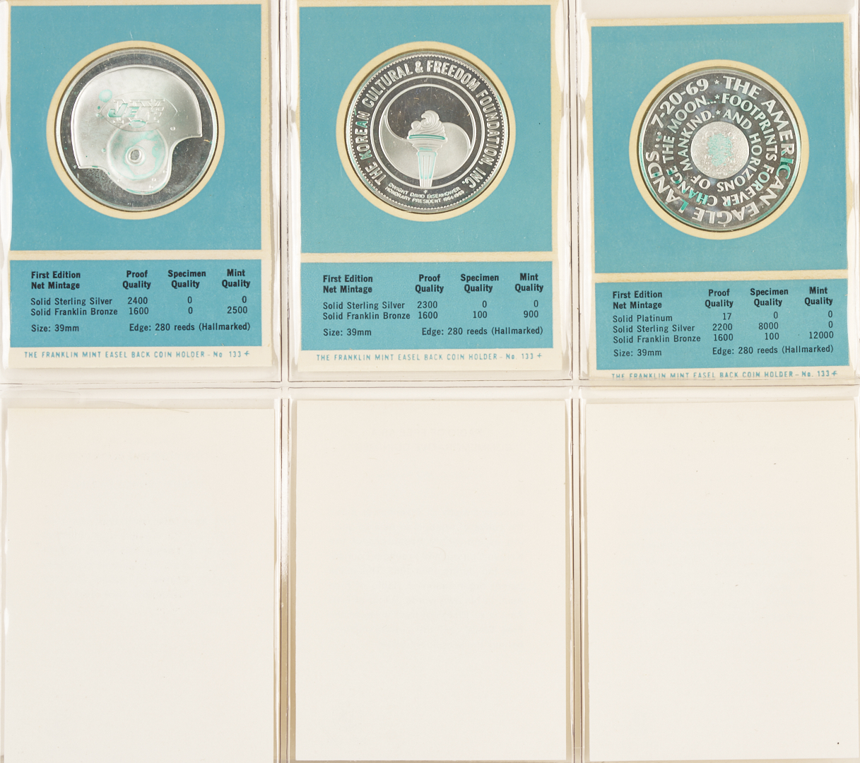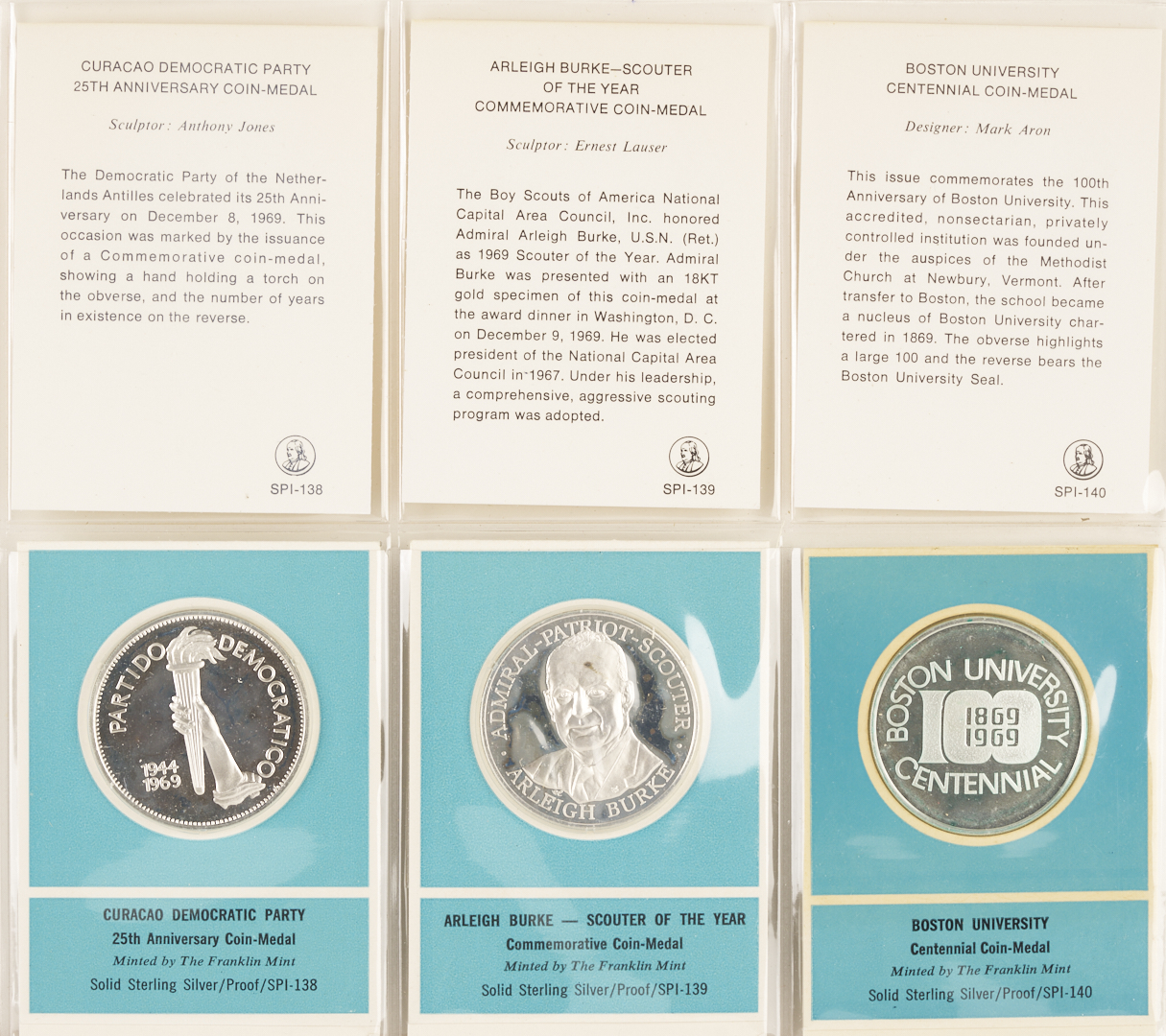 Fifty-one (51) Franklin Mint National Commemorative Society Special Private Issue First Edition Proof sterling silver rounds, housed in a navy blue album. Each round is accompanied by a brief write-up and depicts various artists, places, events, etc. in American history. Each round weighs approximately 0.6 troy ounces and measures approximately 1 in.– 1 1/2 in. (40 mm) in dia. Total weight: approx 30.6 troy ounces. Album measures: 10 in. L x 8 in. W x 2 in. D.