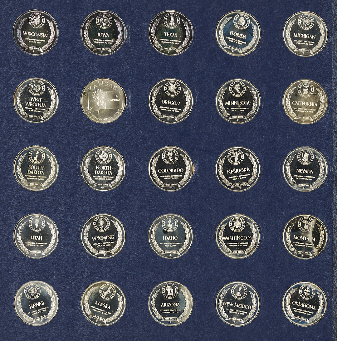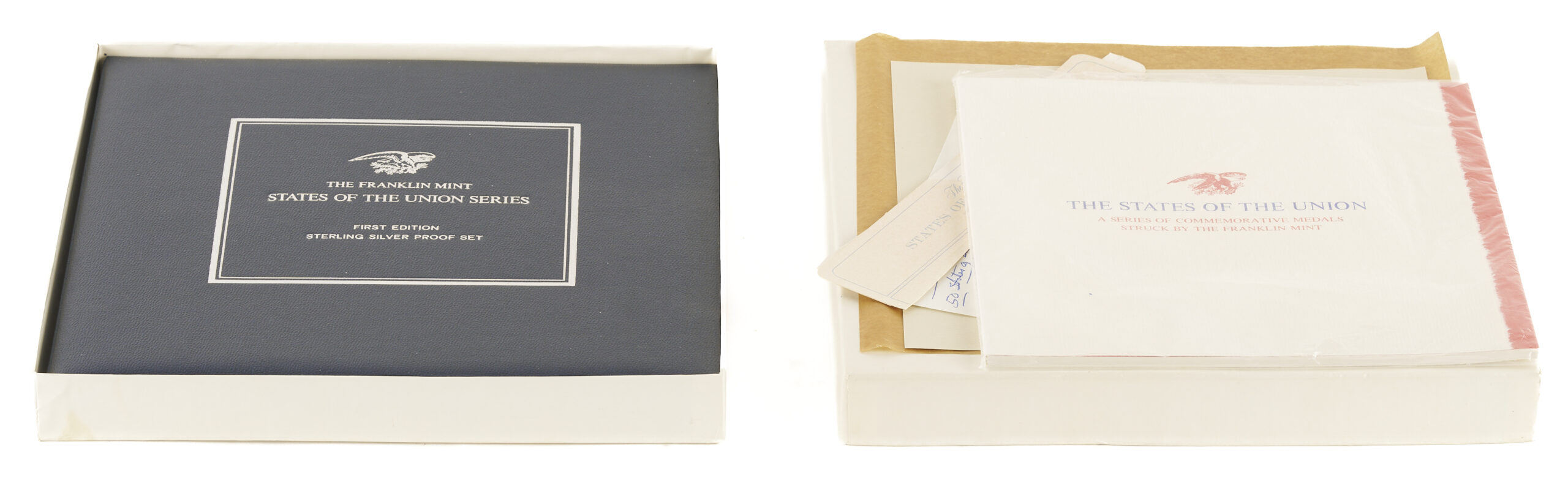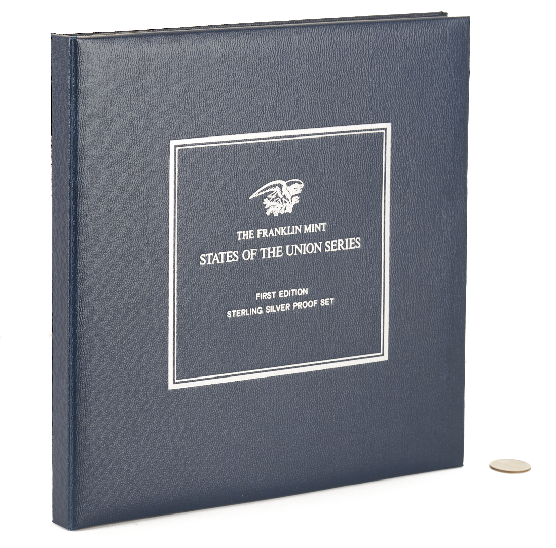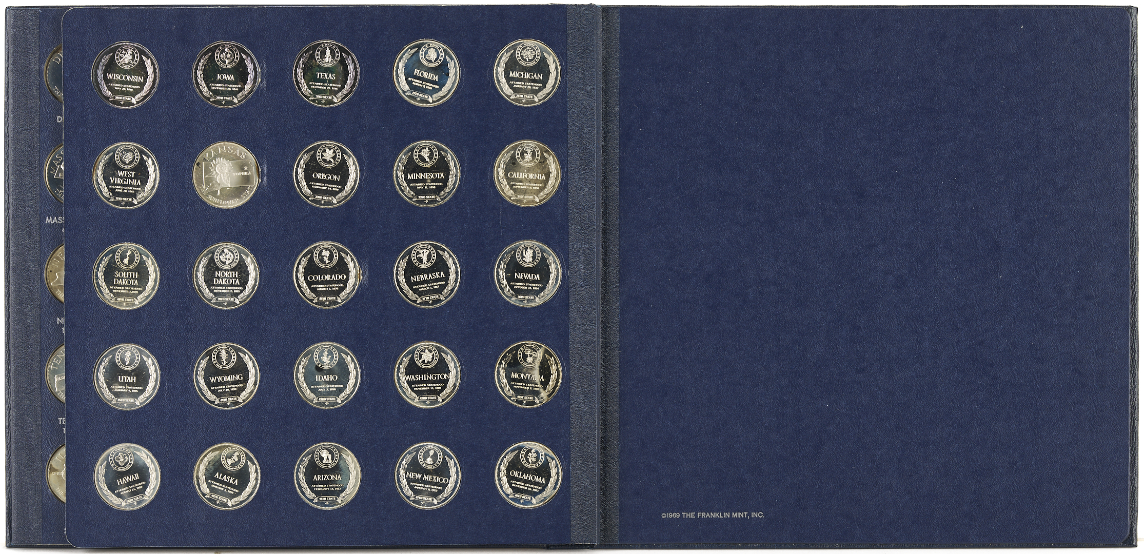 Fifty (50) Franklin Mint Sterling Silver States of the Union Series medallions, housed in a navy blue album, each representing a U.S. state and the date in which it became a state. Each medallion weighs approximately 0.46 troy ounces, for a total weight of about 23 troy ounces. Each medallion measuring approx 1 in. (33 mm) dia. Accompanied by a book with descriptions of each medallion. Album measures: 10 1/4 in. L x 10 3/8 in. W x 1 in. D.