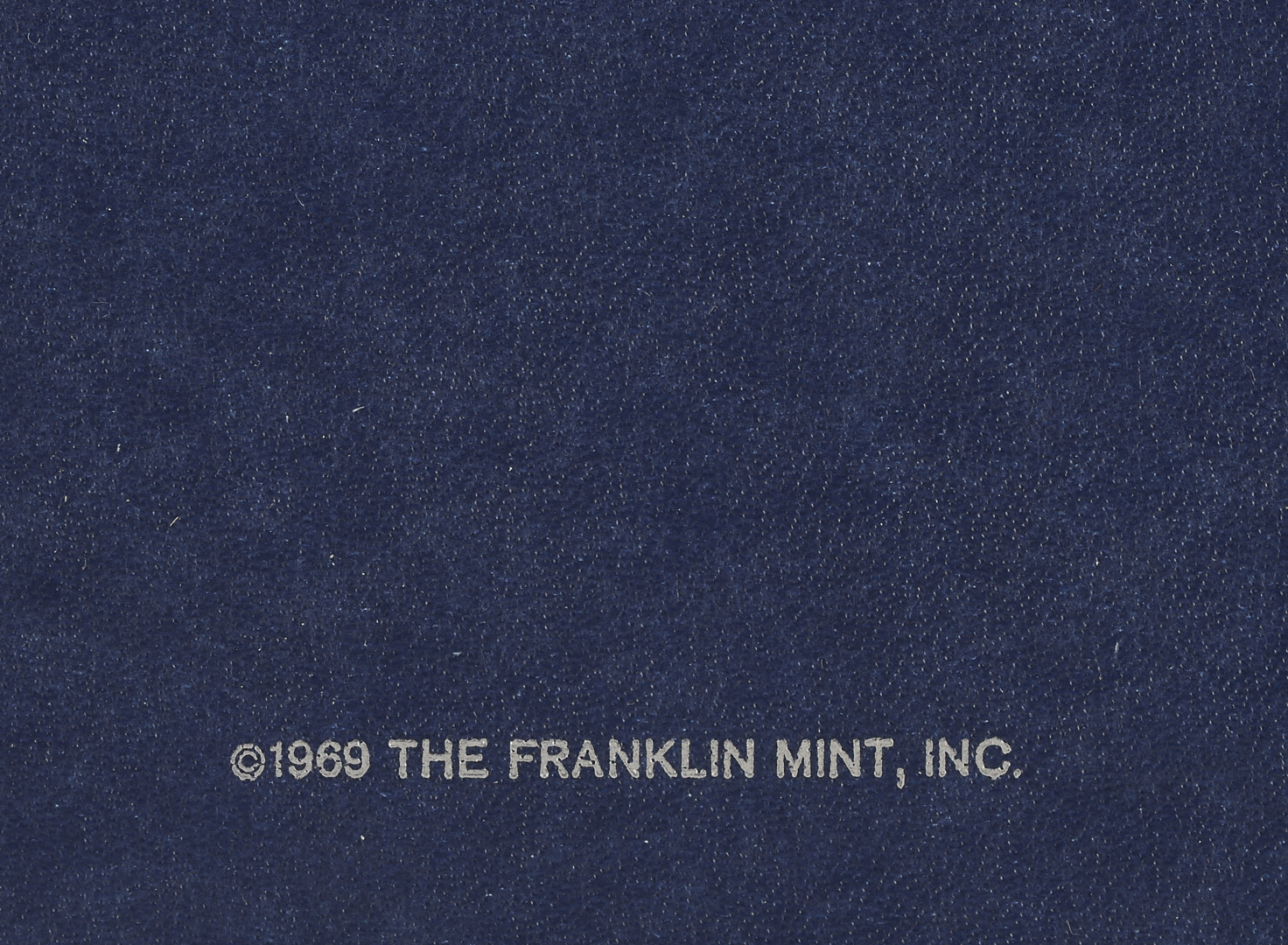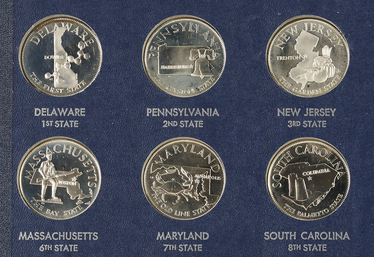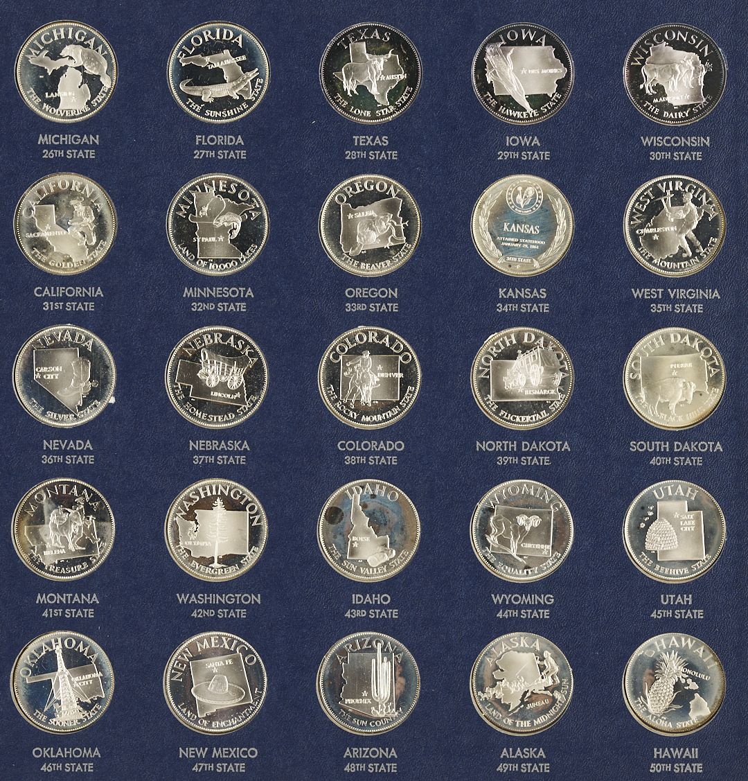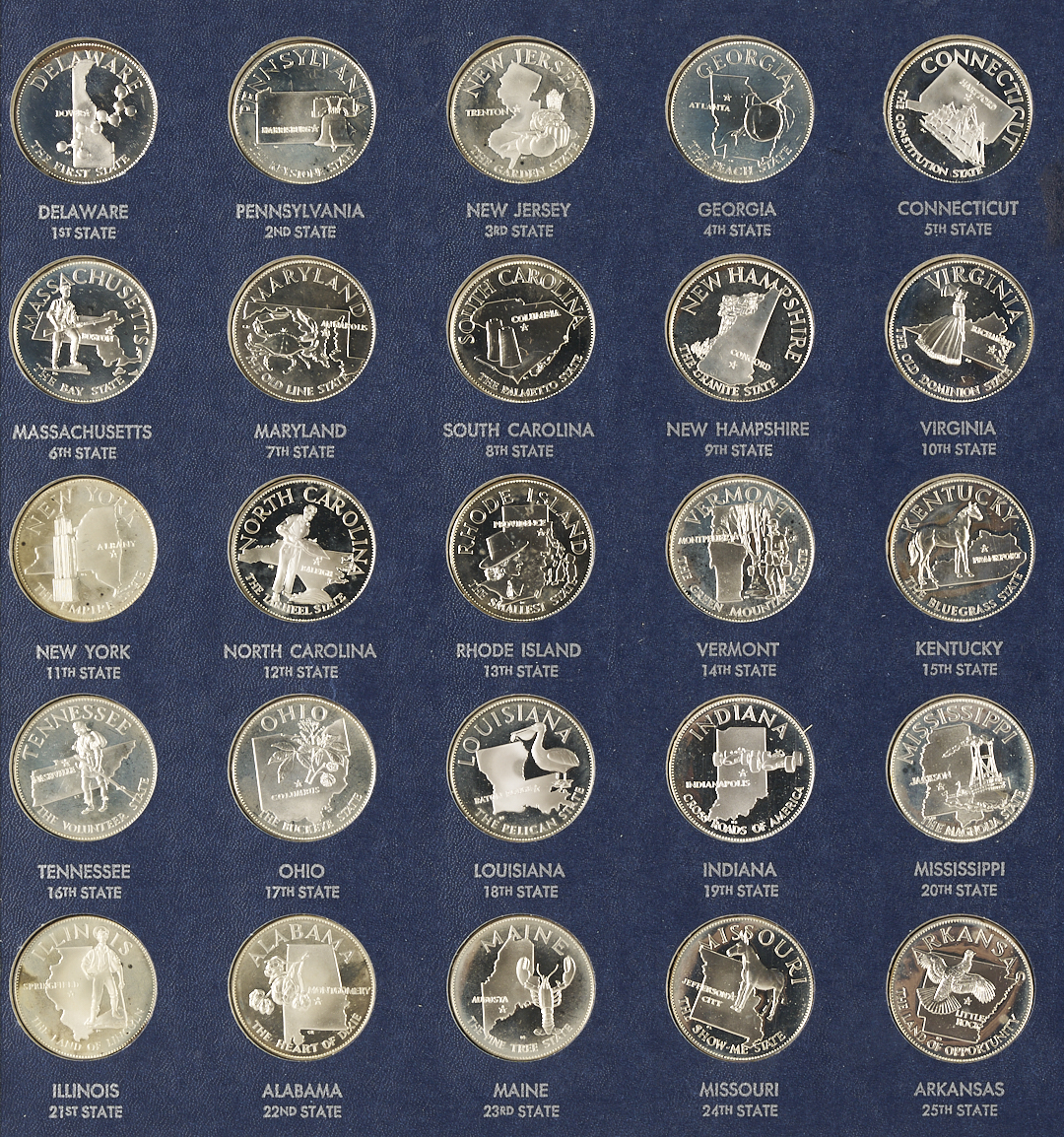 Fifty (50) Franklin Mint Sterling Silver States of the Union Series medallions, housed in a navy blue album, each representing a U.S. state and the date in which it became a state. Each medallion weighs approximately 0.46 troy ounces, for a total weight of about 23 troy ounces. Each medallion measuring approx 1 in. (33 mm) dia. Accompanied by a book with descriptions of each medallion. Album measures: 10 1/4 in. L x 10 3/8 in. W x 1 in. D.