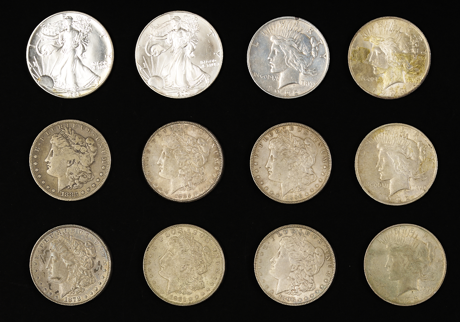 All coins are in circulated condition except one (1) peace dollar and both silver eagles.