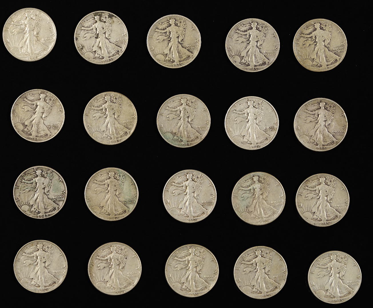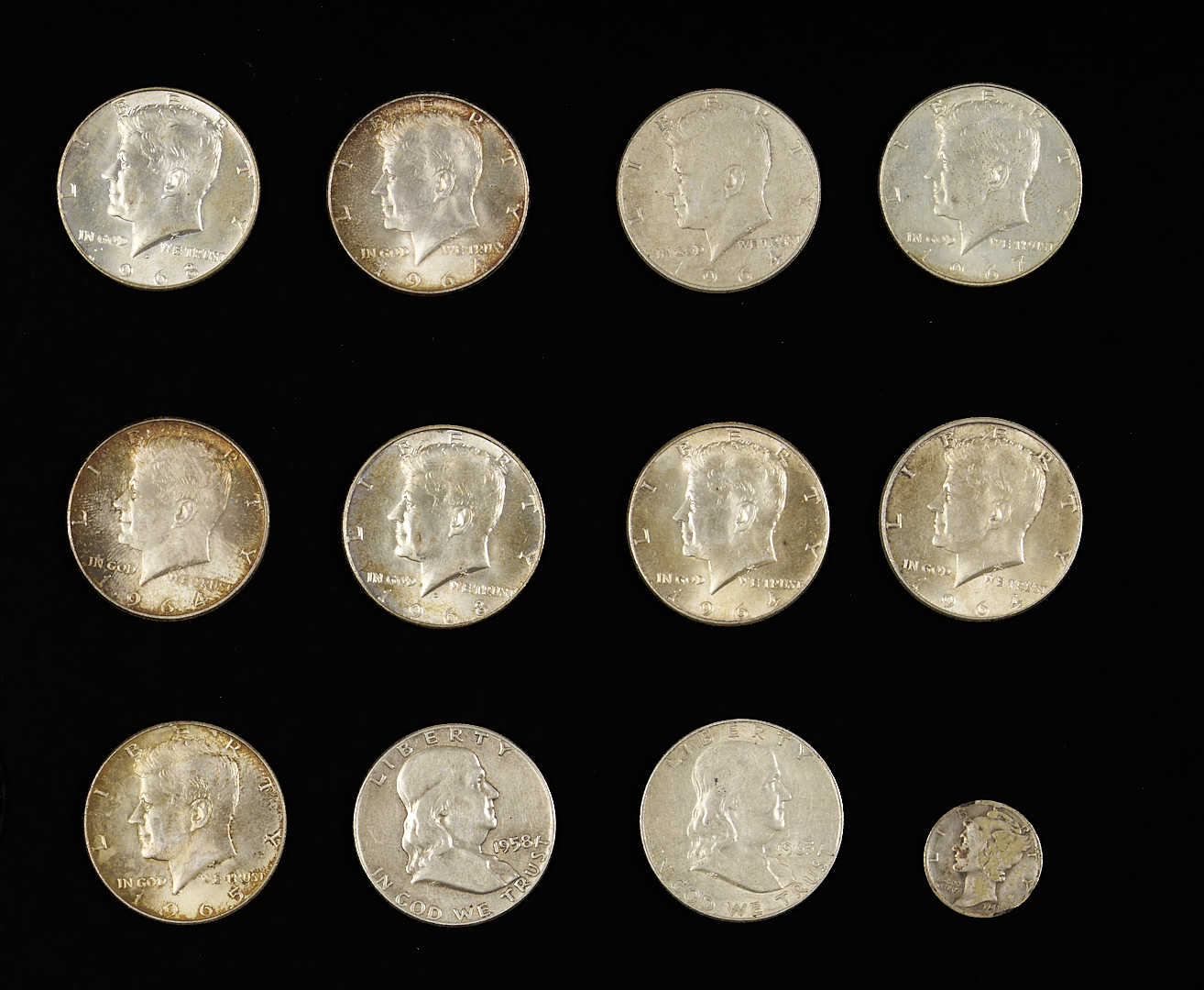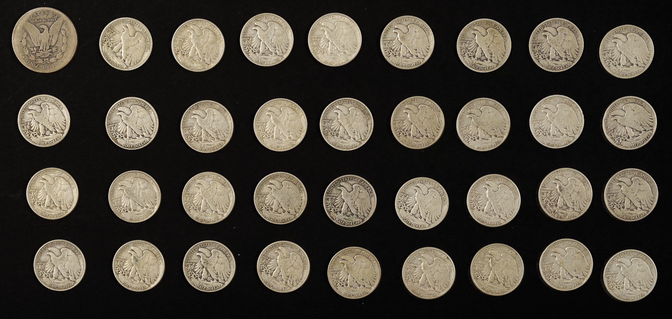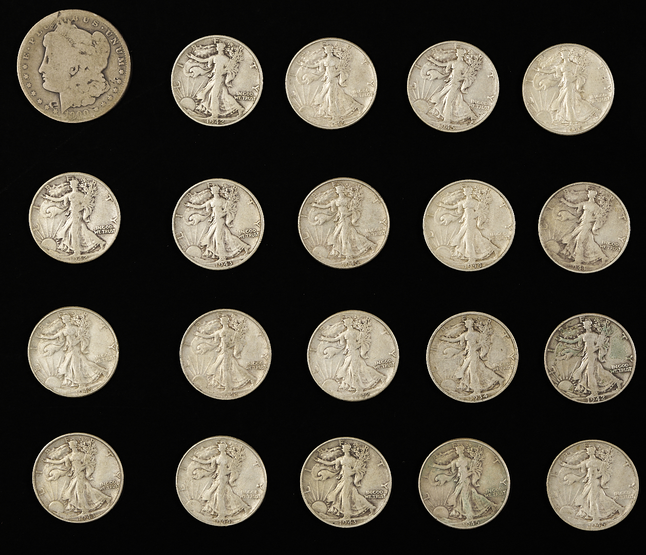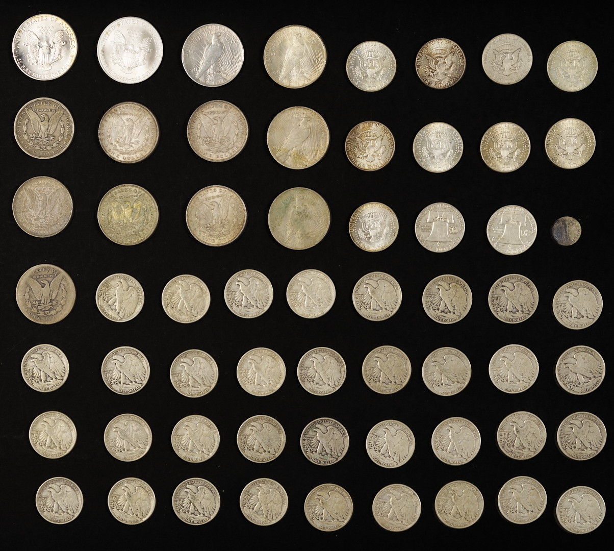 Silver coin lot including $21.10 face value in 90% silver coins, including mostly walking liberty half dollars with some Kennedy and Franklin halves and one mercury dime; $2.00 in 40% silver coins in Kennedy half dollars; Seven (7) Morgan silver dollars; Four (4) peace silver dollars; and two (2) American silver eagles.