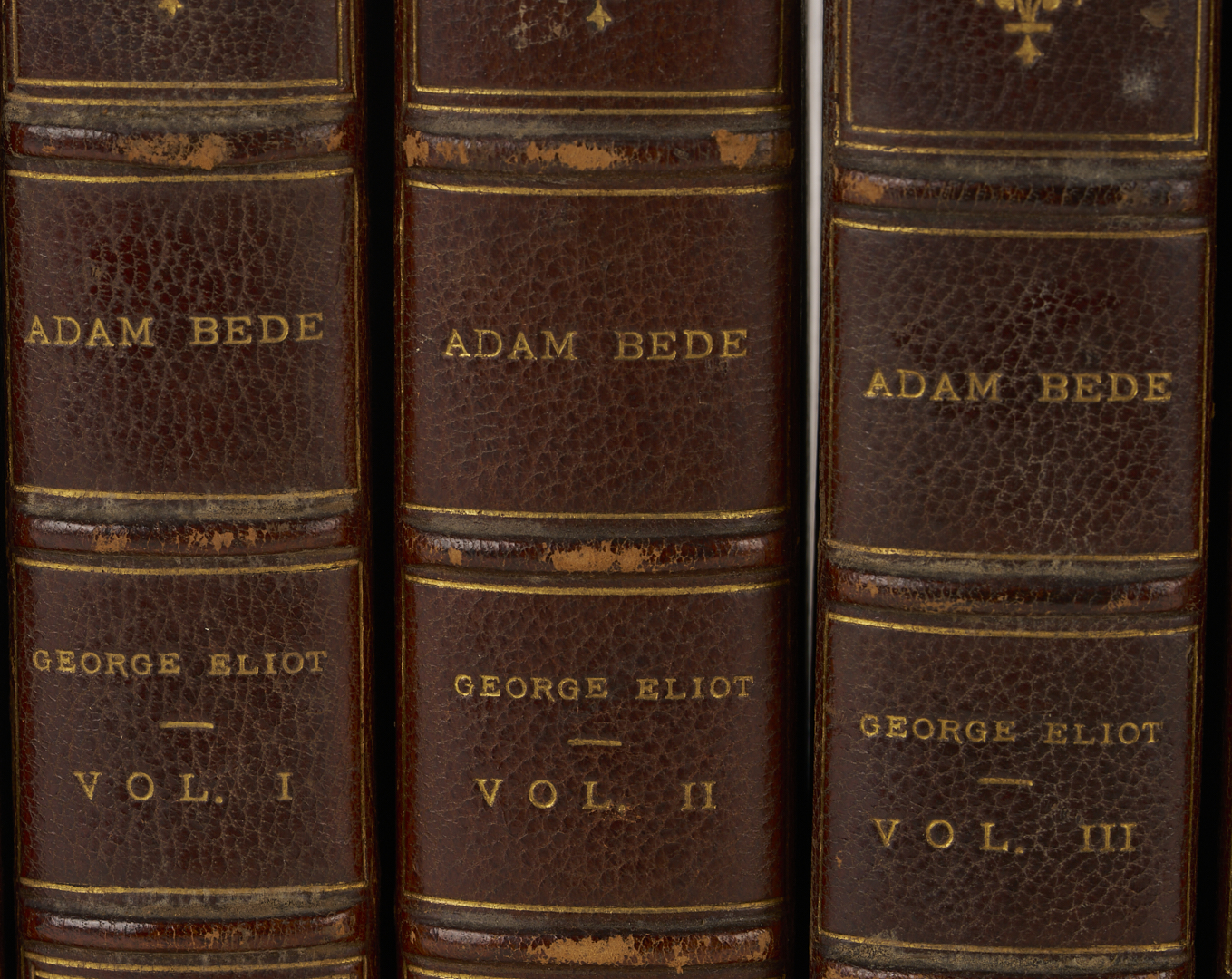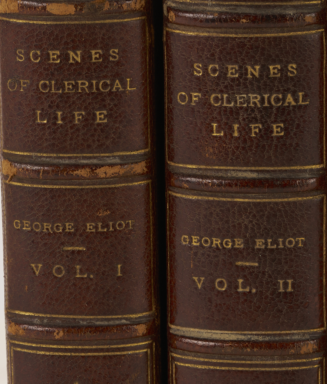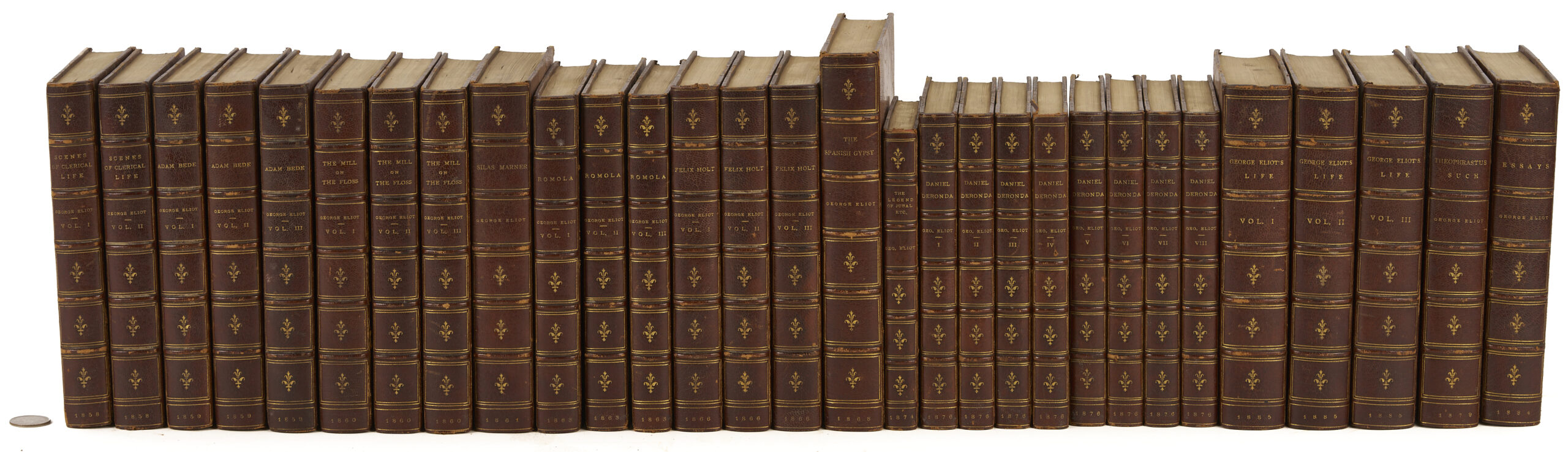 Twenty-seven (27) First Edition books by George Eliot, (pseudonym of Mary Ann Evans), plus three (3) biographical books by her husband, J.W. Cross. Published by Edinburgh and London: William Blackwood & Sons, 1858-84, except where noted. Hardcover 12mos. Uniform late 19th C. bindings by Stikeman & Co., 3/4 brown calf and marbled papers; with gilt stamped covers and spines, five raised hubs, with marbled paper pastedowns and endpapers, gilt top edges. Includes: