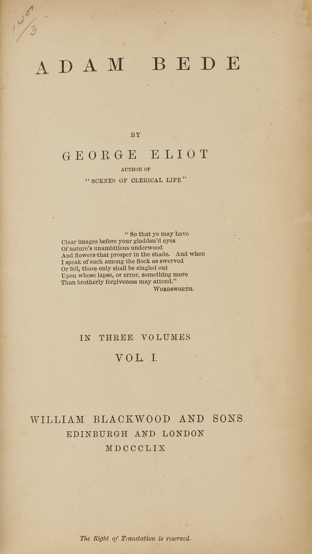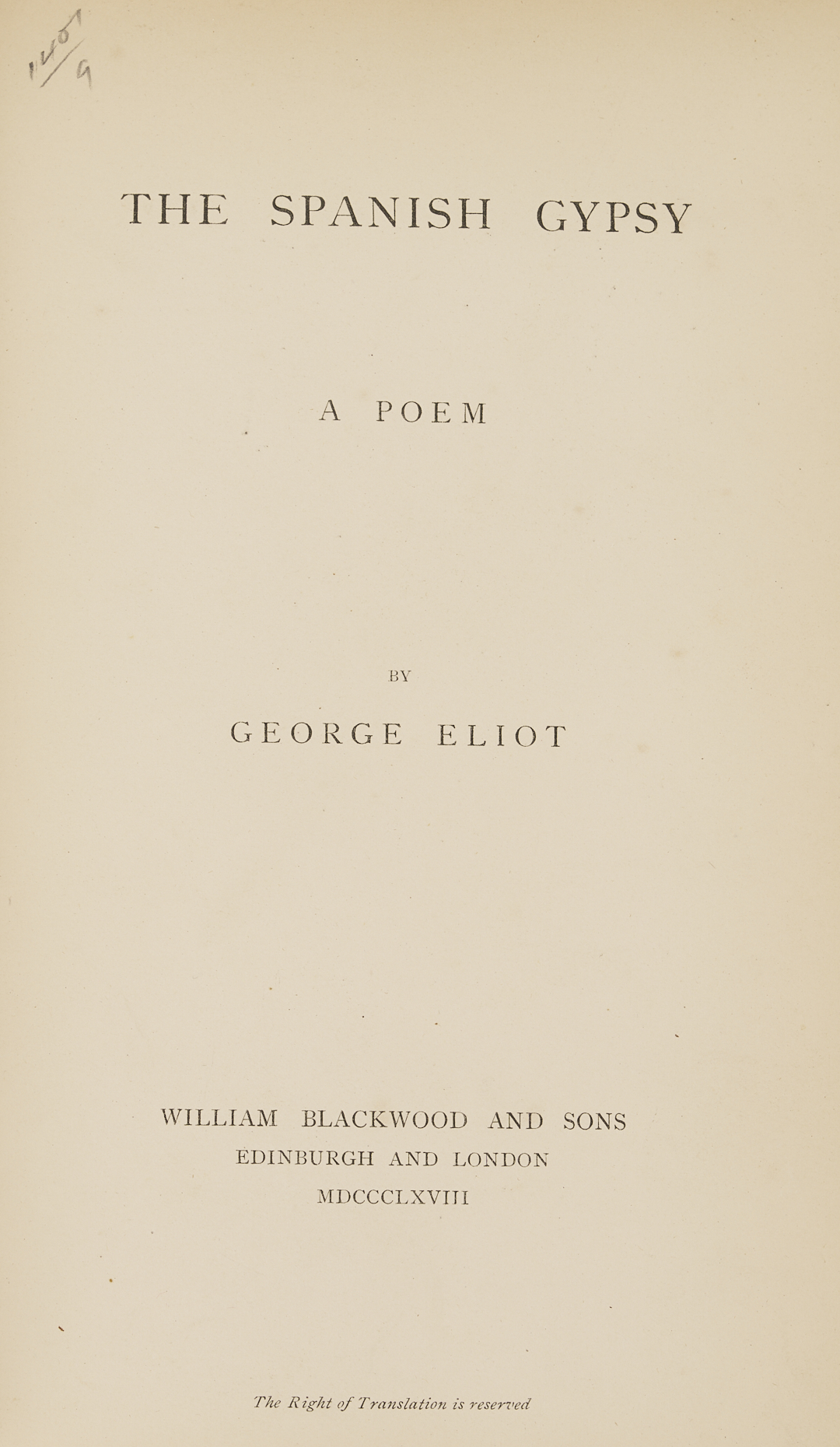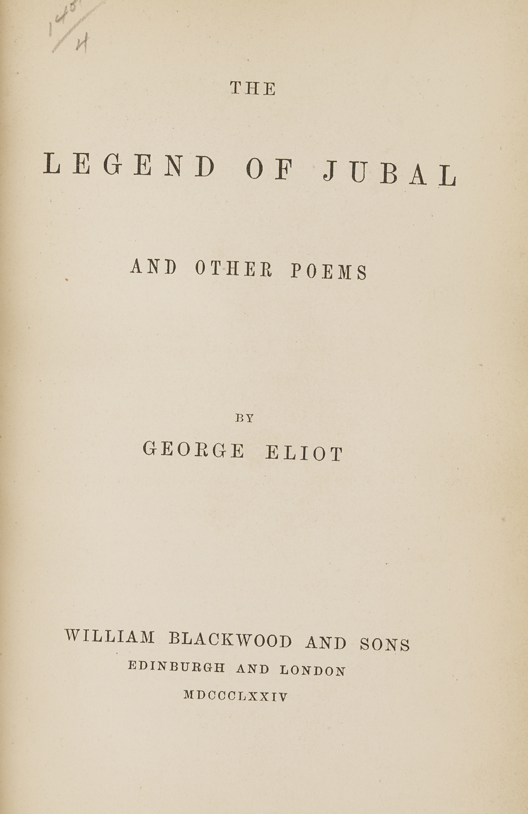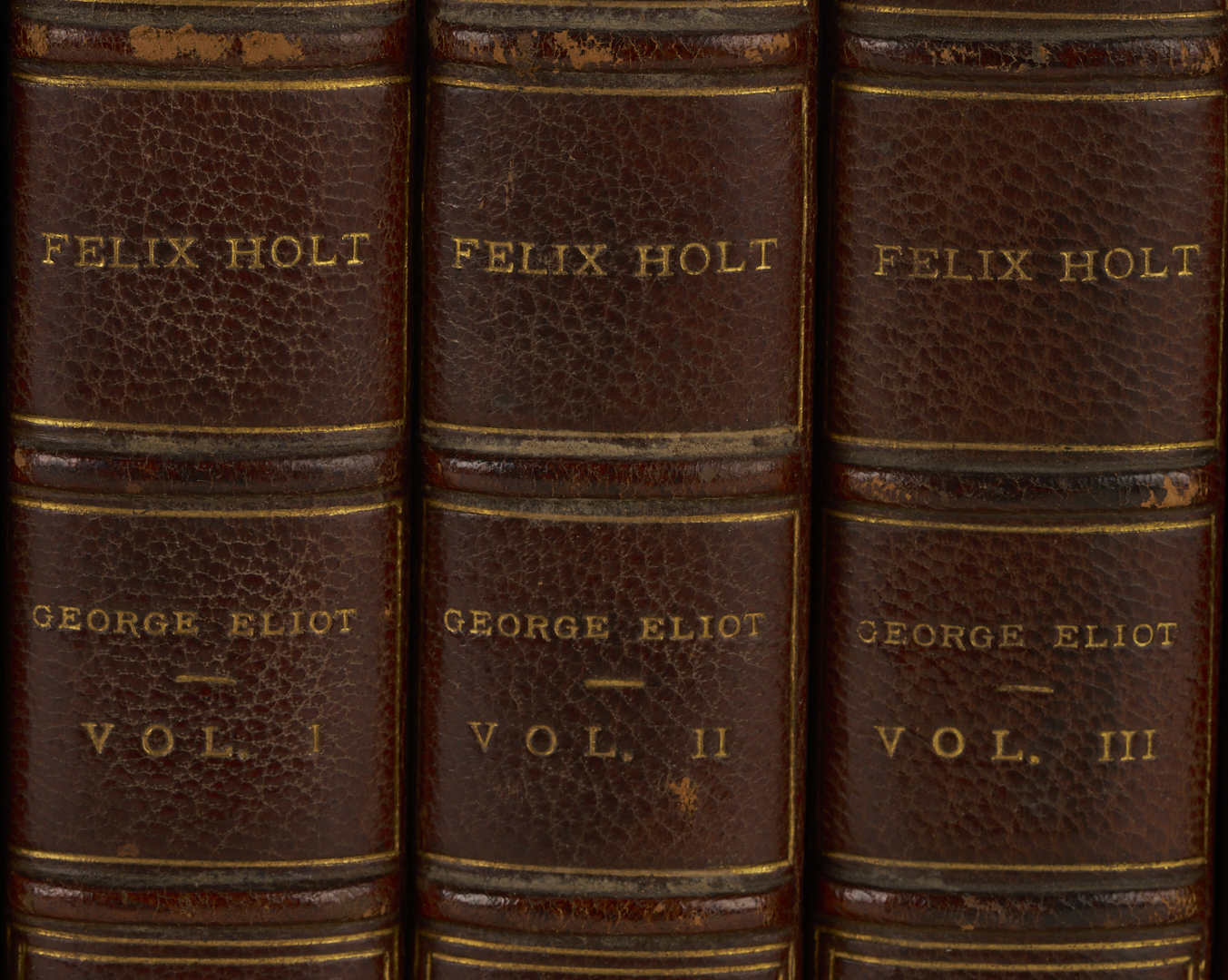 Twenty-seven (27) First Edition books by George Eliot, (pseudonym of Mary Ann Evans), plus three (3) biographical books by her husband, J.W. Cross. Published by Edinburgh and London: William Blackwood & Sons, 1858-84, except where noted. Hardcover 12mos. Uniform late 19th C. bindings by Stikeman & Co., 3/4 brown calf and marbled papers; with gilt stamped covers and spines, five raised hubs, with marbled paper pastedowns and endpapers, gilt top edges. Includes: