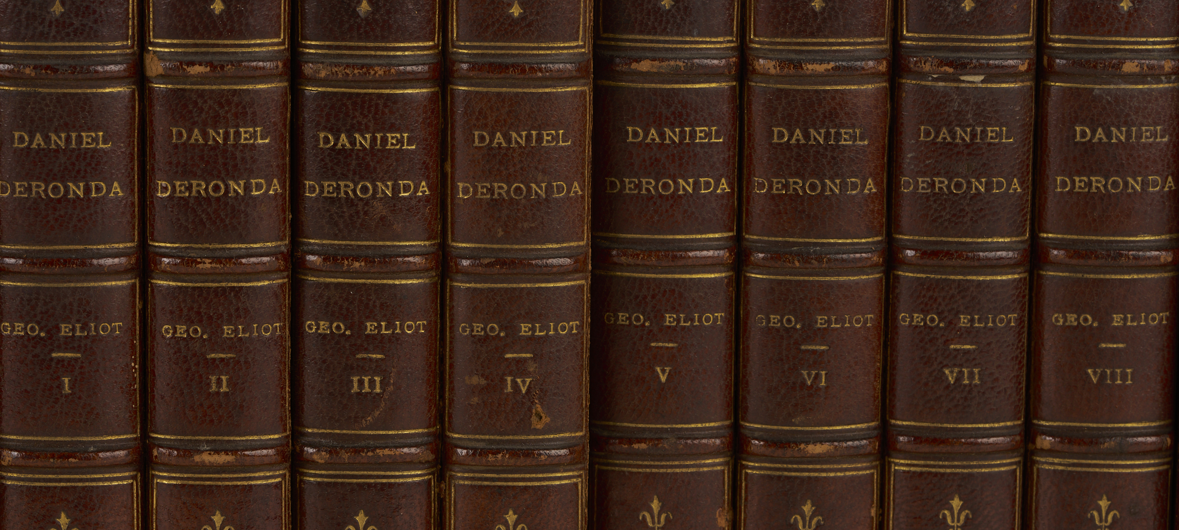 Covers in overall good condition with wear to hinges, scattered rubbing/losses to leather, corners bumped. Bookplates to each. Pencil notations to front papers. Period dated owner’s signatures to two volumes. Pages in overall Fine condition with toning, scattered foxing. Book 7 of Daniel Deronda with 3/4″ chip to front marbled endpaper; book 6 tear to rear endpaper.