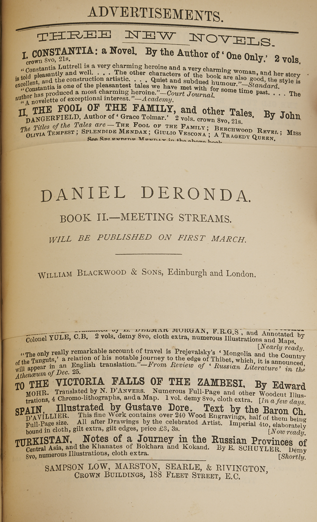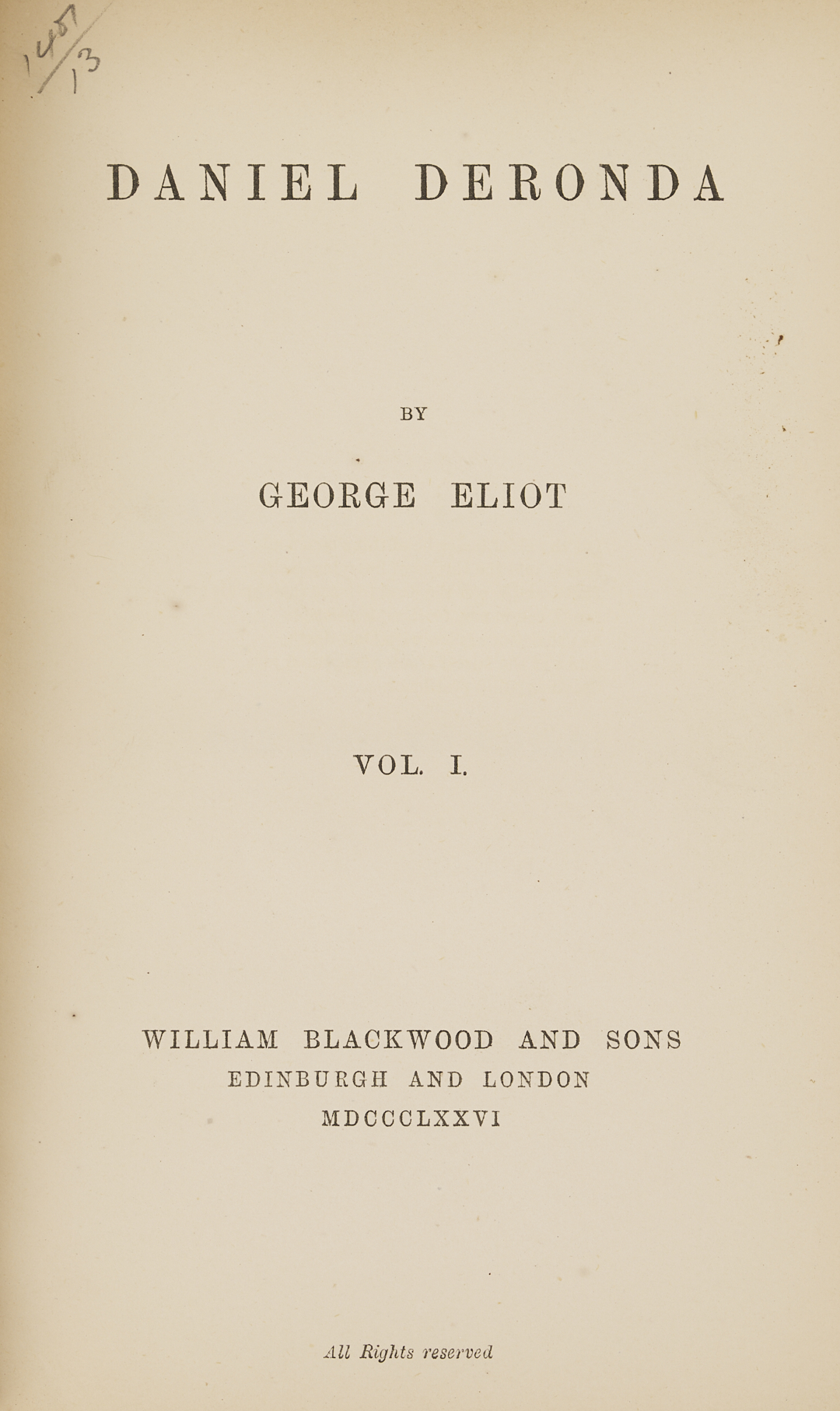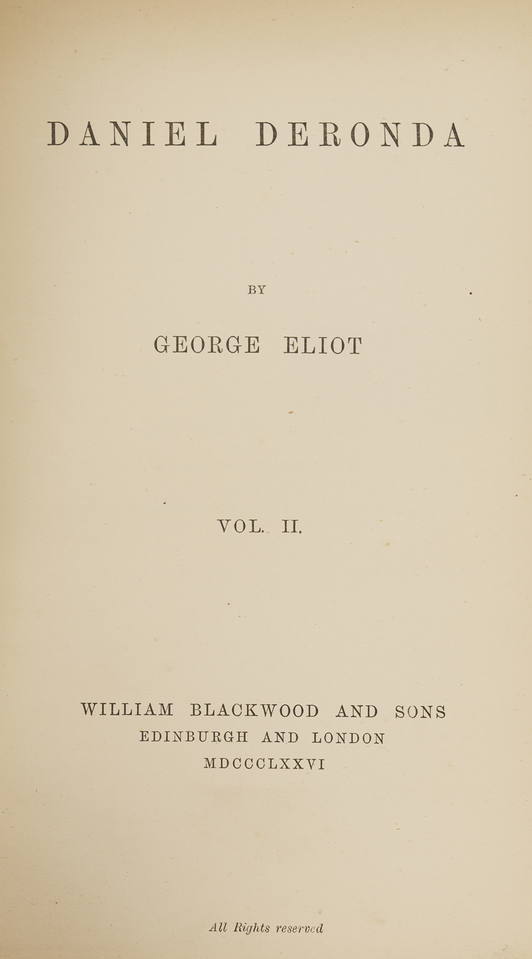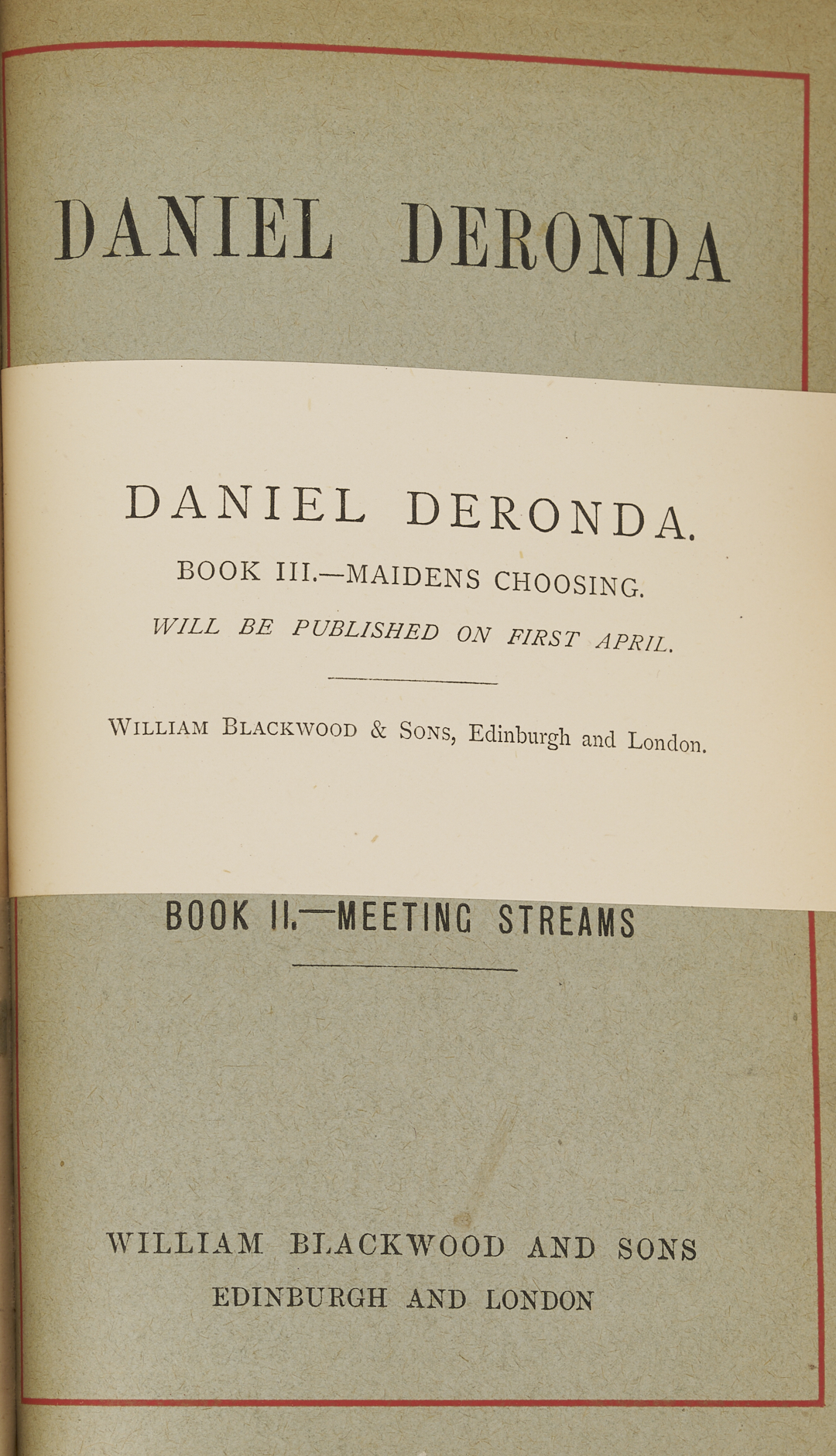 DANIEL DERONDA, Vols. I-IV (in 8 books), 1876; Original Gray-green wrappers bound in rear of each; Erratum slip bound in Book 3 (absent from book 6), all announcements of following volumes present; advertisements in books 1 and 7;