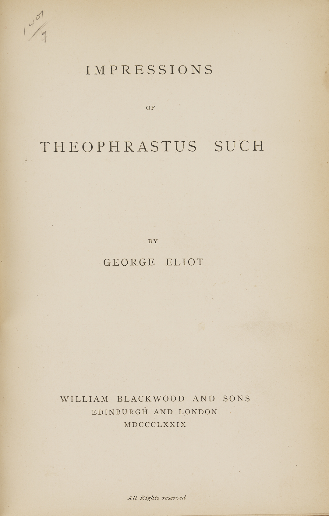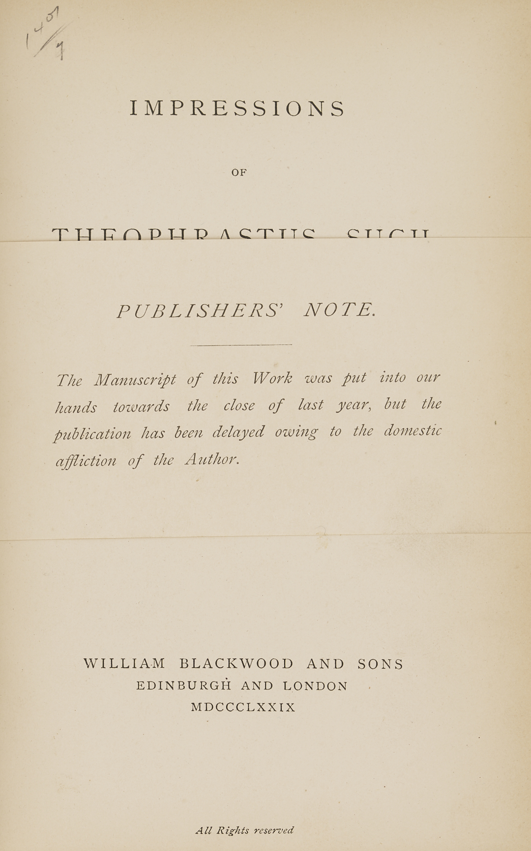 IMPRESSIONS OF THEOPHRASTUS SUCH, 1879, with original Publisher’s Note bound in;