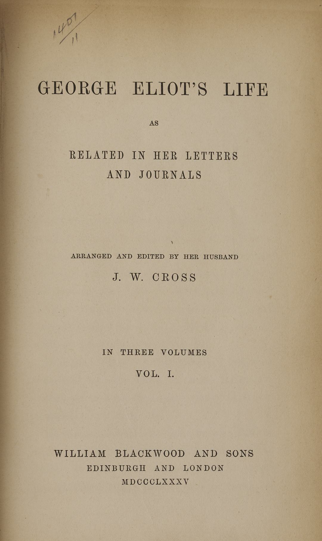 Also includes GEORGE ELIOT’S LIFE AS RELATED IN HER LETTERS AND JOURNALS, Vol. I-III, First Edition, by J.W. Cross, 1885;