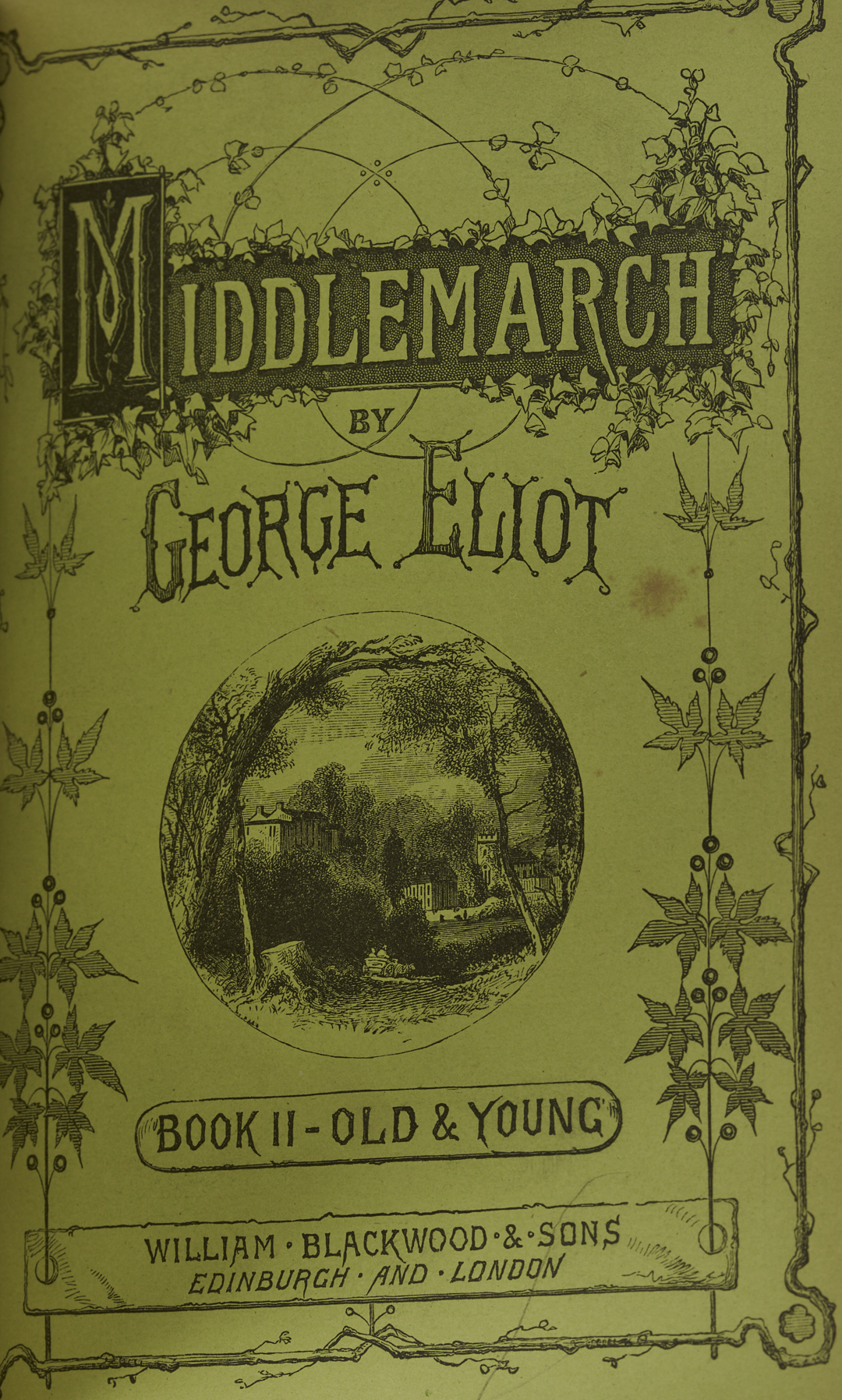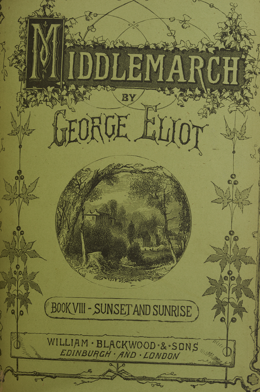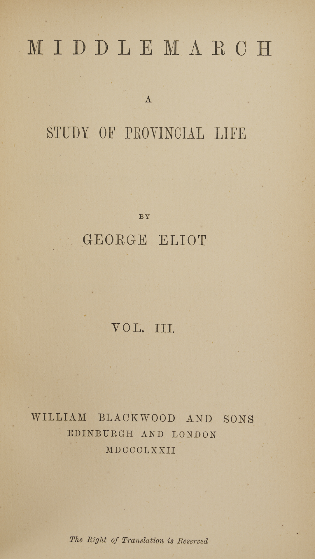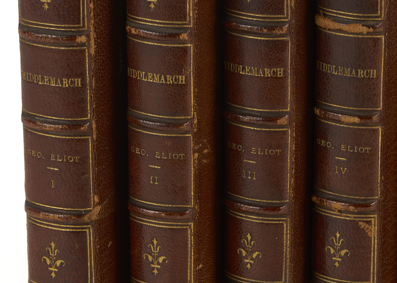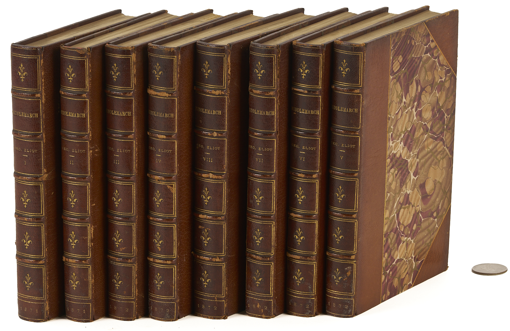 MIDDLEMARCH: A STUDY OF PROVINCIAL LIFE, Vol. I-IV First Edition, by George Eliot (pseudonym of Mary Ann Evans), Edinburgh and London: William Blackwood & Sons, 1871-72. Hardcover 12mo. Bound by Stikeman & Co. in 3/4 brown calf and marbled papers; with gilt stamped covers and spines, five raised hubs, with marbled paper pastedowns and endpapers, gilt top edges. Originally issued in serial form every two months in eight half-volume sections, the complete Middlemarch was then released in four volumes with two “books” per volume; this set has been rebound as eight separate books. Original green decorated wrappers bound in the rear of each, with advertisements; Book IV with scarce errata slip bound in rear. Ex libris plates of Henry William Poor and Lillian Stokes Gillespie. Each approximately 7 1/4 in. H x 5 in. W x 7/8 in. D. Note: Lillian May (Stokes) Gillespie (1869-1915) was an independently wealthy socialite from the Stokes family of New York, a line of enormously successful financiers and merchants. Henry William Poor (1844-1915) was an American banker, stockbroker, author, and book collector.