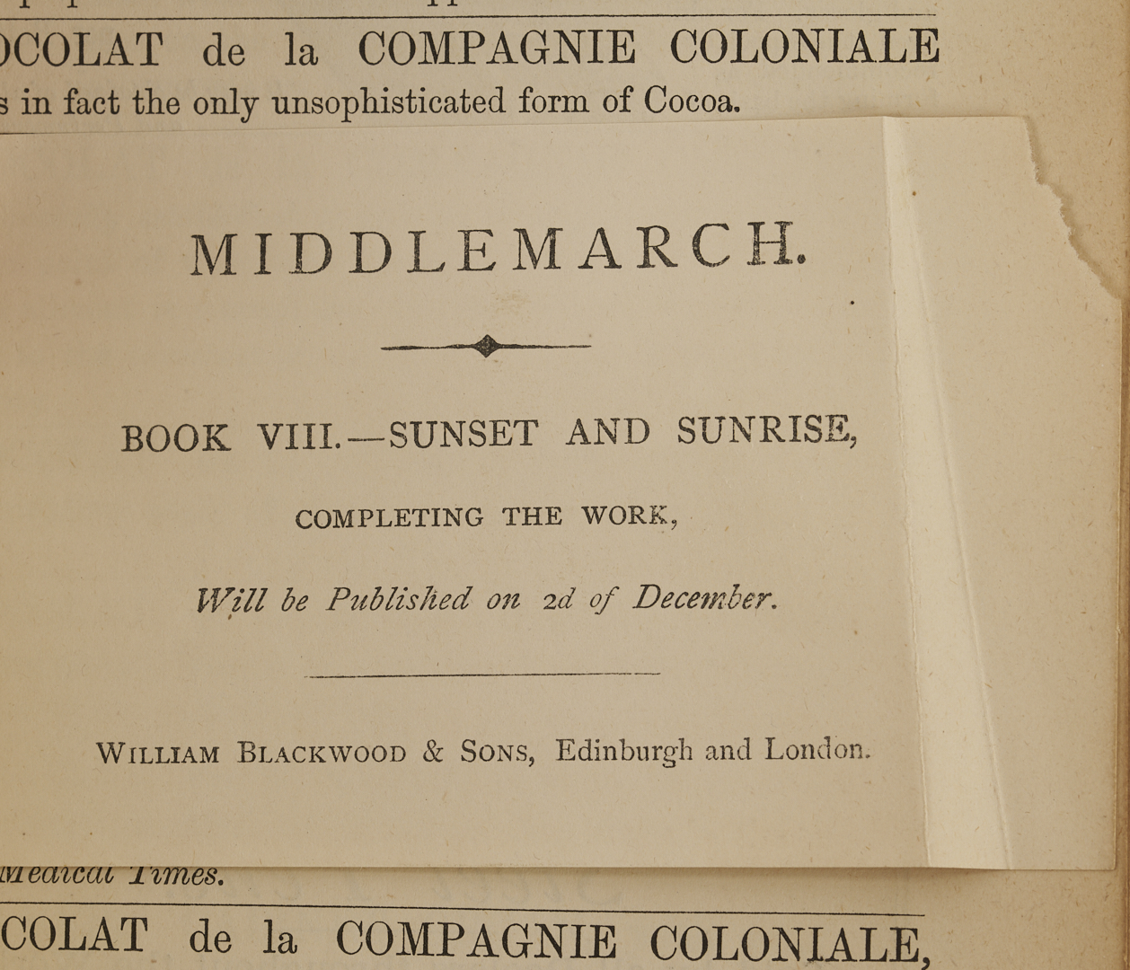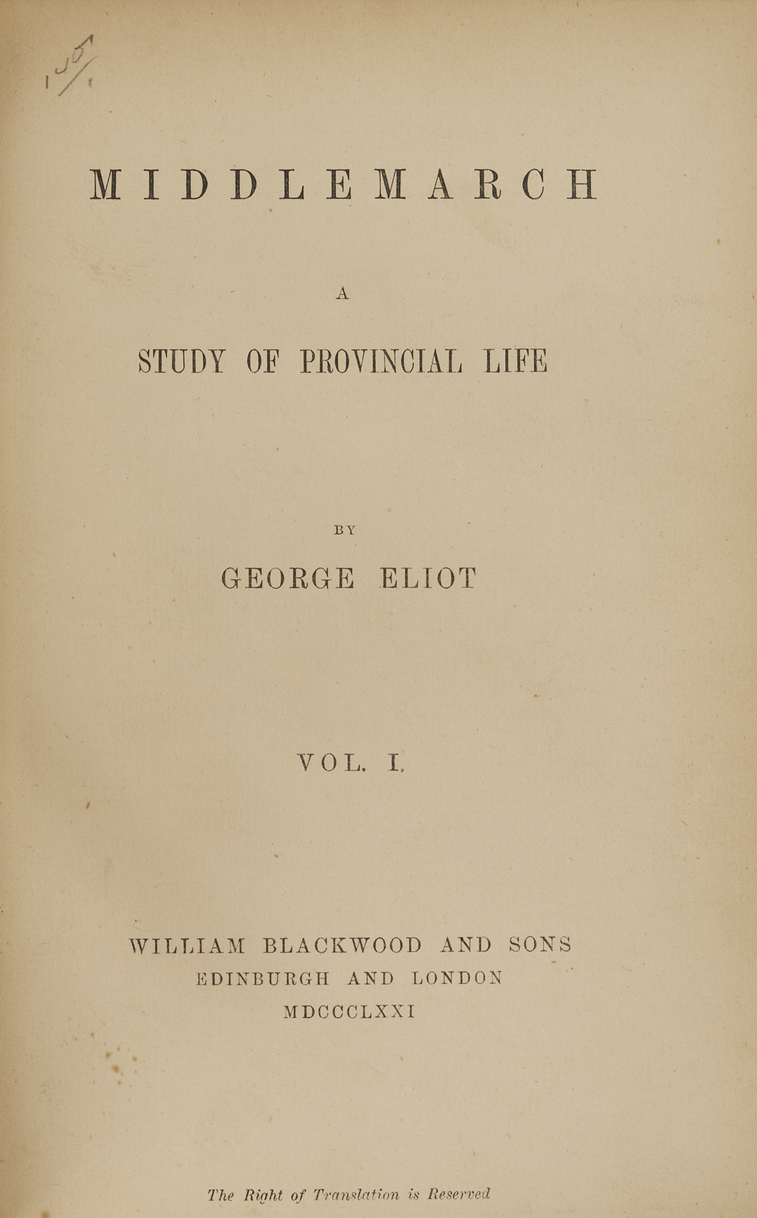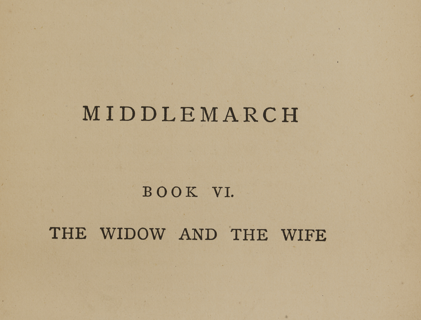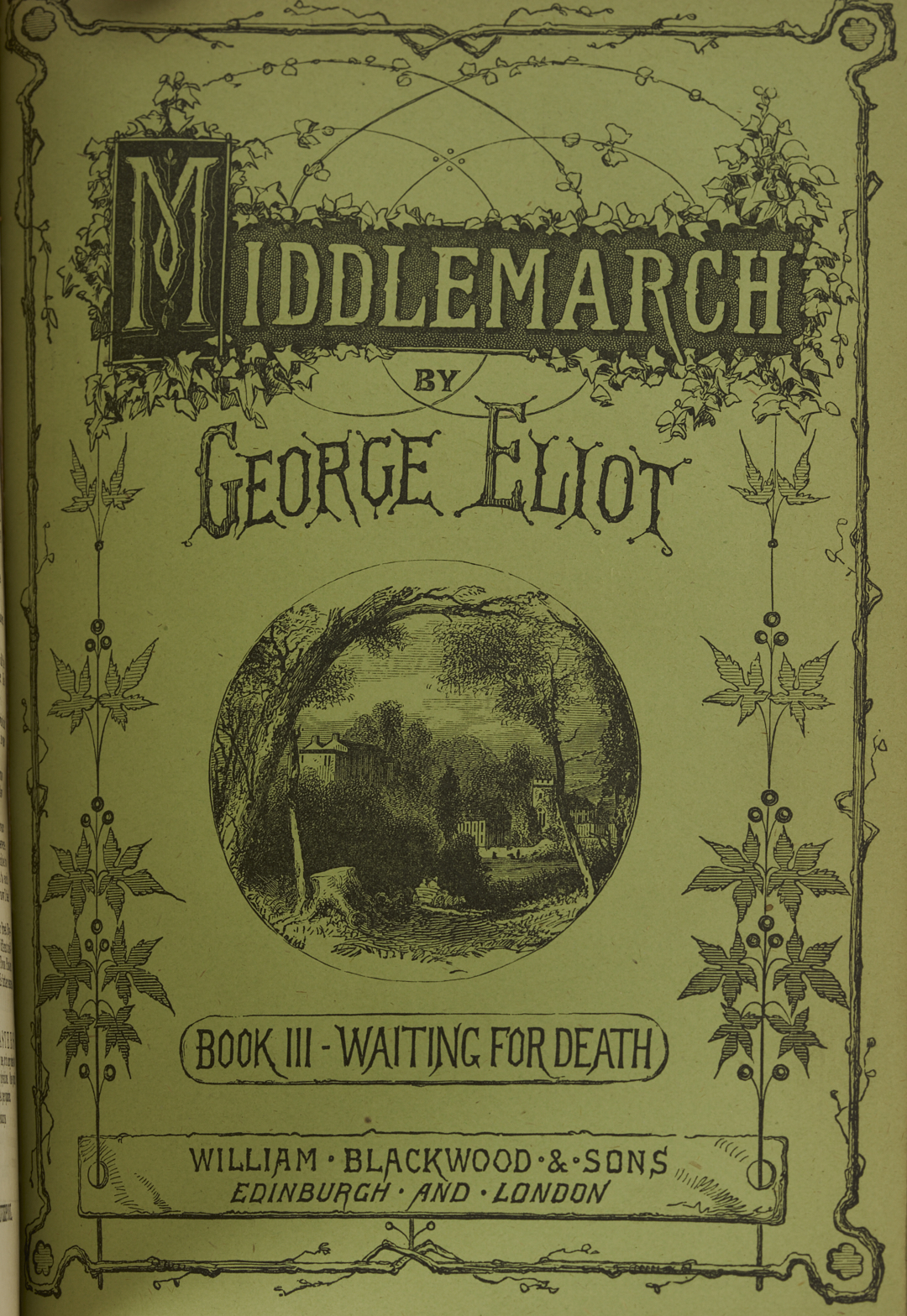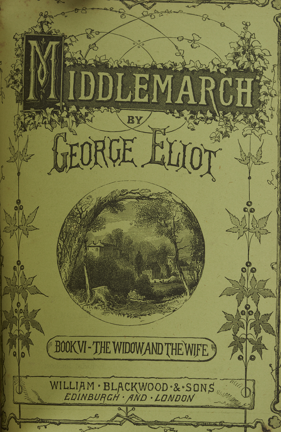 MIDDLEMARCH: A STUDY OF PROVINCIAL LIFE, Vol. I-IV First Edition, by George Eliot (pseudonym of Mary Ann Evans), Edinburgh and London: William Blackwood & Sons, 1871-72. Hardcover 12mo. Bound by Stikeman & Co. in 3/4 brown calf and marbled papers; with gilt stamped covers and spines, five raised hubs, with marbled paper pastedowns and endpapers, gilt top edges. Originally issued in serial form every two months in eight half-volume sections, the complete Middlemarch was then released in four volumes with two “books” per volume; this set has been rebound as eight separate books. Original green decorated wrappers bound in the rear of each, with advertisements; Book IV with scarce errata slip bound in rear. Ex libris plates of Henry William Poor and Lillian Stokes Gillespie. Each approximately 7 1/4 in. H x 5 in. W x 7/8 in. D. Note: Lillian May (Stokes) Gillespie (1869-1915) was an independently wealthy socialite from the Stokes family of New York, a line of enormously successful financiers and merchants. Henry William Poor (1844-1915) was an American banker, stockbroker, author, and book collector.