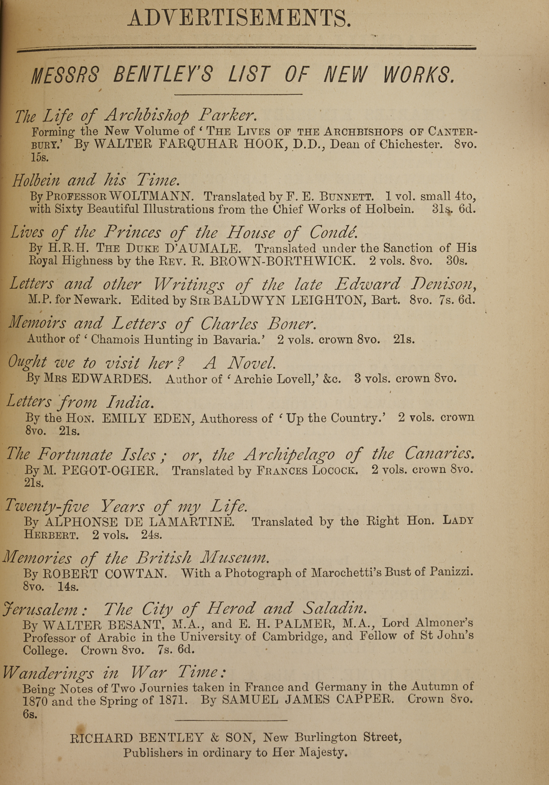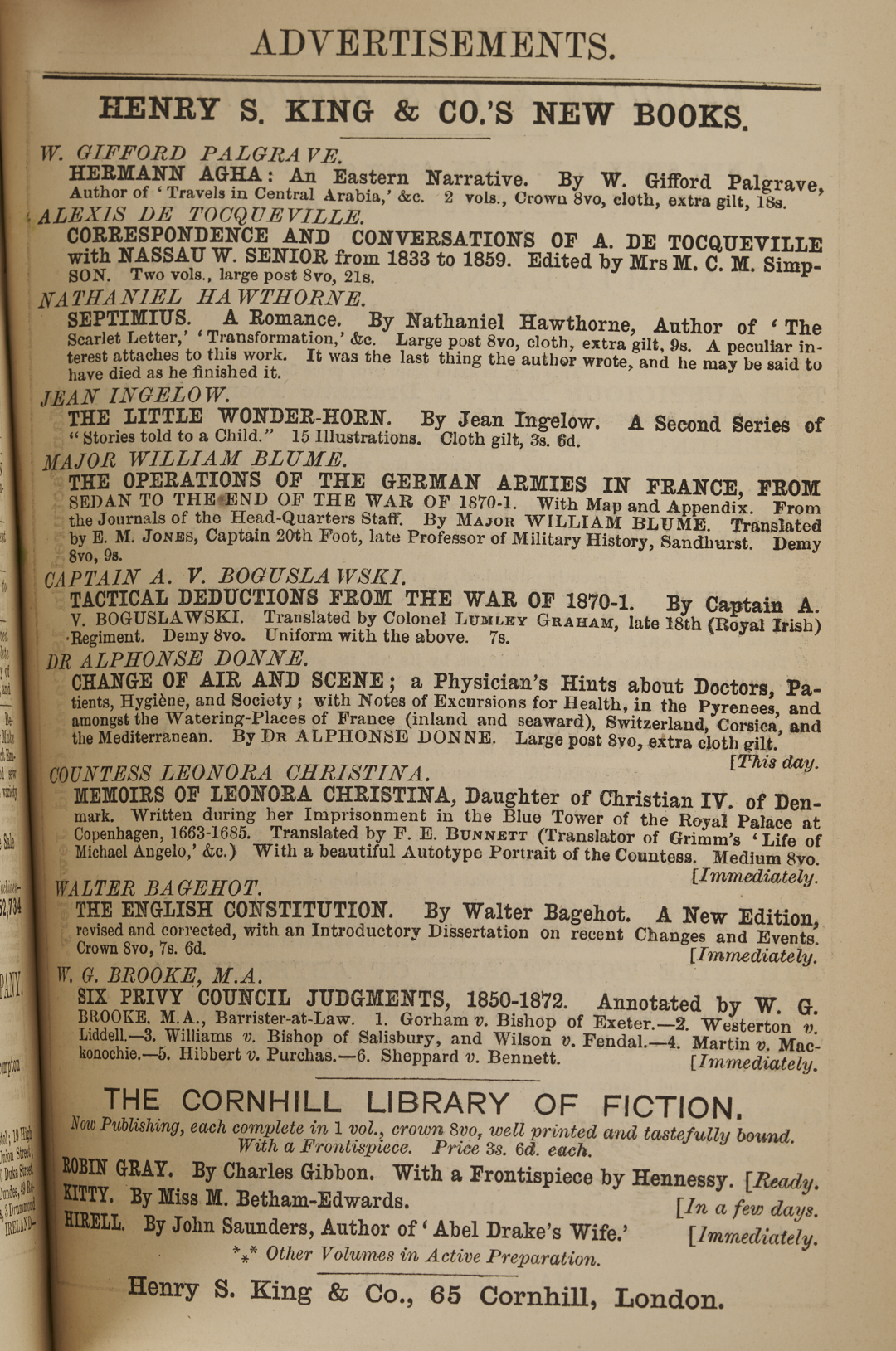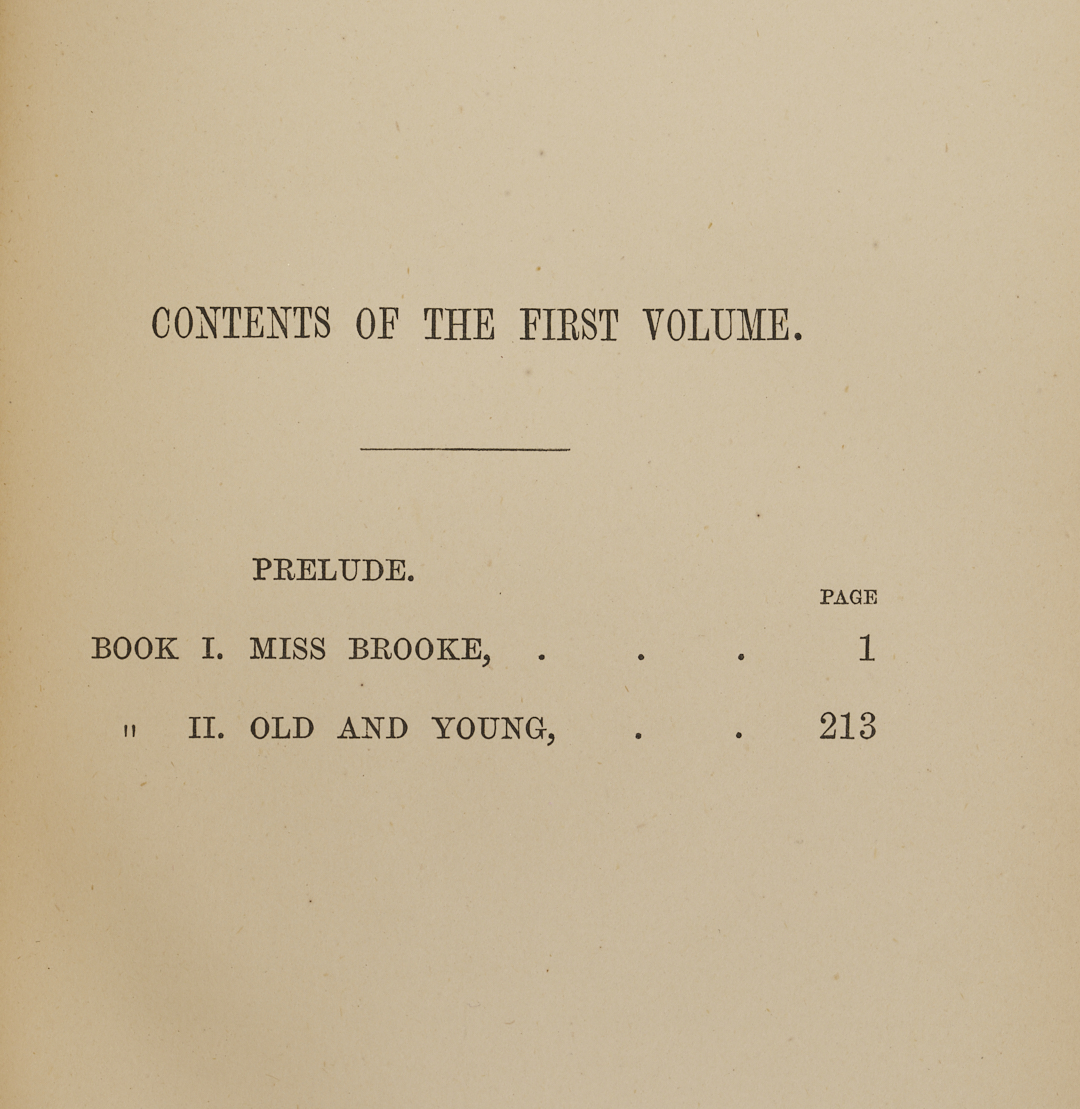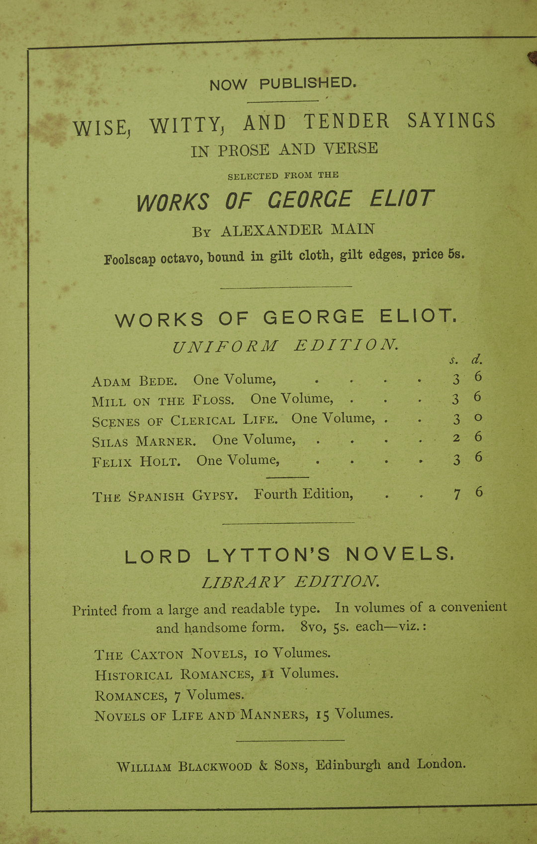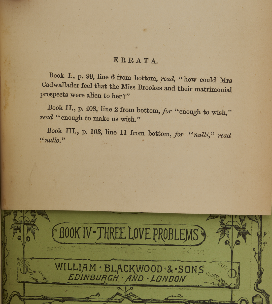 MIDDLEMARCH: A STUDY OF PROVINCIAL LIFE, Vol. I-IV First Edition, by George Eliot (pseudonym of Mary Ann Evans), Edinburgh and London: William Blackwood & Sons, 1871-72. Hardcover 12mo. Bound by Stikeman & Co. in 3/4 brown calf and marbled papers; with gilt stamped covers and spines, five raised hubs, with marbled paper pastedowns and endpapers, gilt top edges. Originally issued in serial form every two months in eight half-volume sections, the complete Middlemarch was then released in four volumes with two “books” per volume; this set has been rebound as eight separate books. Original green decorated wrappers bound in the rear of each, with advertisements; Book IV with scarce errata slip bound in rear. Ex libris plates of Henry William Poor and Lillian Stokes Gillespie. Each approximately 7 1/4 in. H x 5 in. W x 7/8 in. D. Note: Lillian May (Stokes) Gillespie (1869-1915) was an independently wealthy socialite from the Stokes family of New York, a line of enormously successful financiers and merchants. Henry William Poor (1844-1915) was an American banker, stockbroker, author, and book collector.