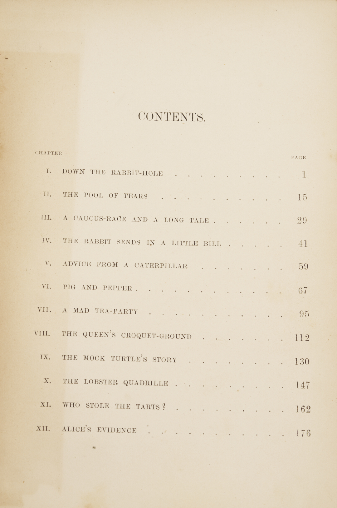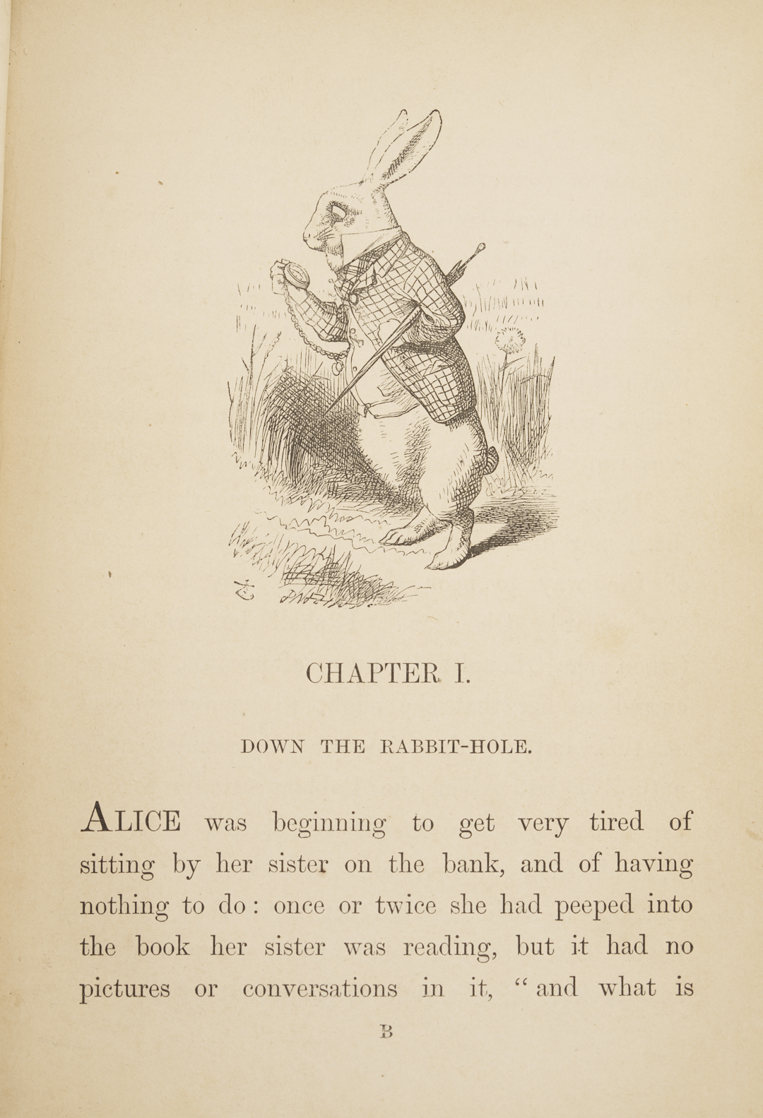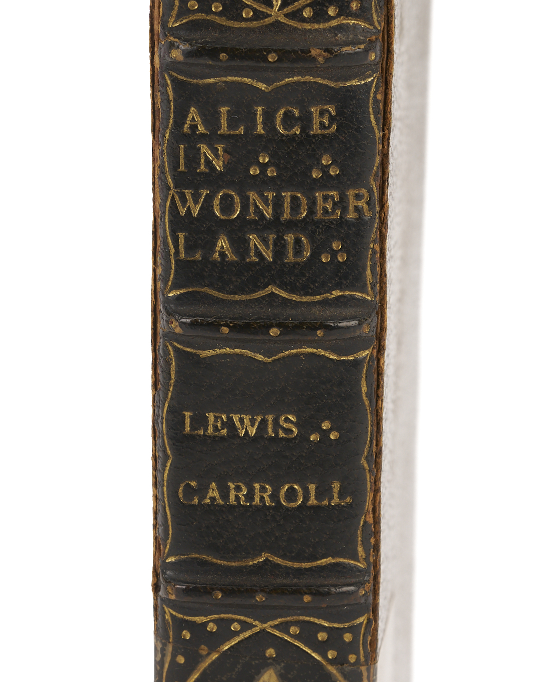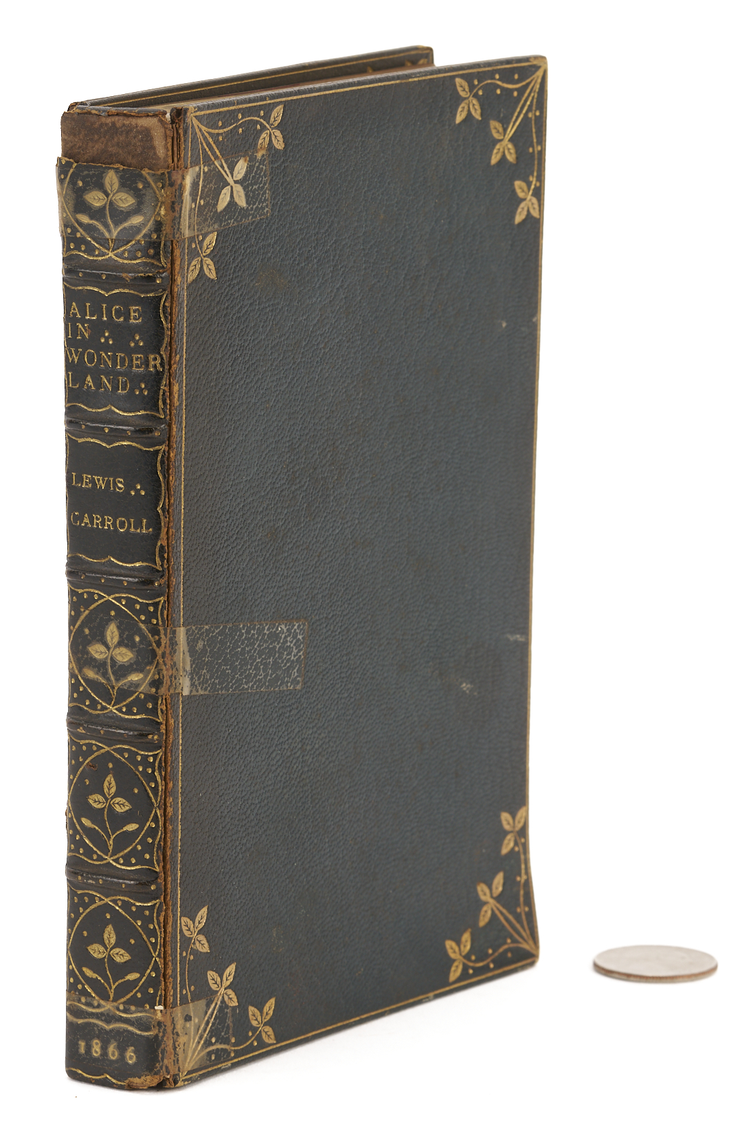 ALICE’S ADVENTURES IN WONDERLAND, Charles Lutwidge Dodgson (Lewis Carroll). London: MacMillan and Co., 1866. With forty-two illustrations by John Tenniel (illustrator). Octavo. 192pp. Second (First Published) Edition; first Issue with page 30 correctly numbered and the inverted “S” on the last line of the contents page. Bound in London by Wood (likely Henry T. Wood & Sons) in full blue morocco with gilt decorated corners, the spines with 5 raised bands and title “Alice In Wonderland”, author’s name, and date of 1866 in gilt. Original red covers and spine bound in at rear of book. Gilt decorated inner boards, marbled endpapers with bookplate of Lillian Stokes Gillespie to front. Binder’s mark stamped in gilt to the lower inner front board. All edges gilt. Note: Alice’s Adventures in Wonderland was first published in 1865 by Macmillan and Co, but after only a few of the planned two thousand copies were fully published, the edition was suppressed when John Tenniel complained about the poor paper quality and their effect on the printings of his illustrations. Most of the copies that were printed went to Carroll to distribute to friends; they were subsequently donated to hospitals. Note: Lillian May (Stokes) Gillespie (1869-1915) was an independently wealthy socialite from the Stokes family of New York, a line of enormously successful financiers and merchants.