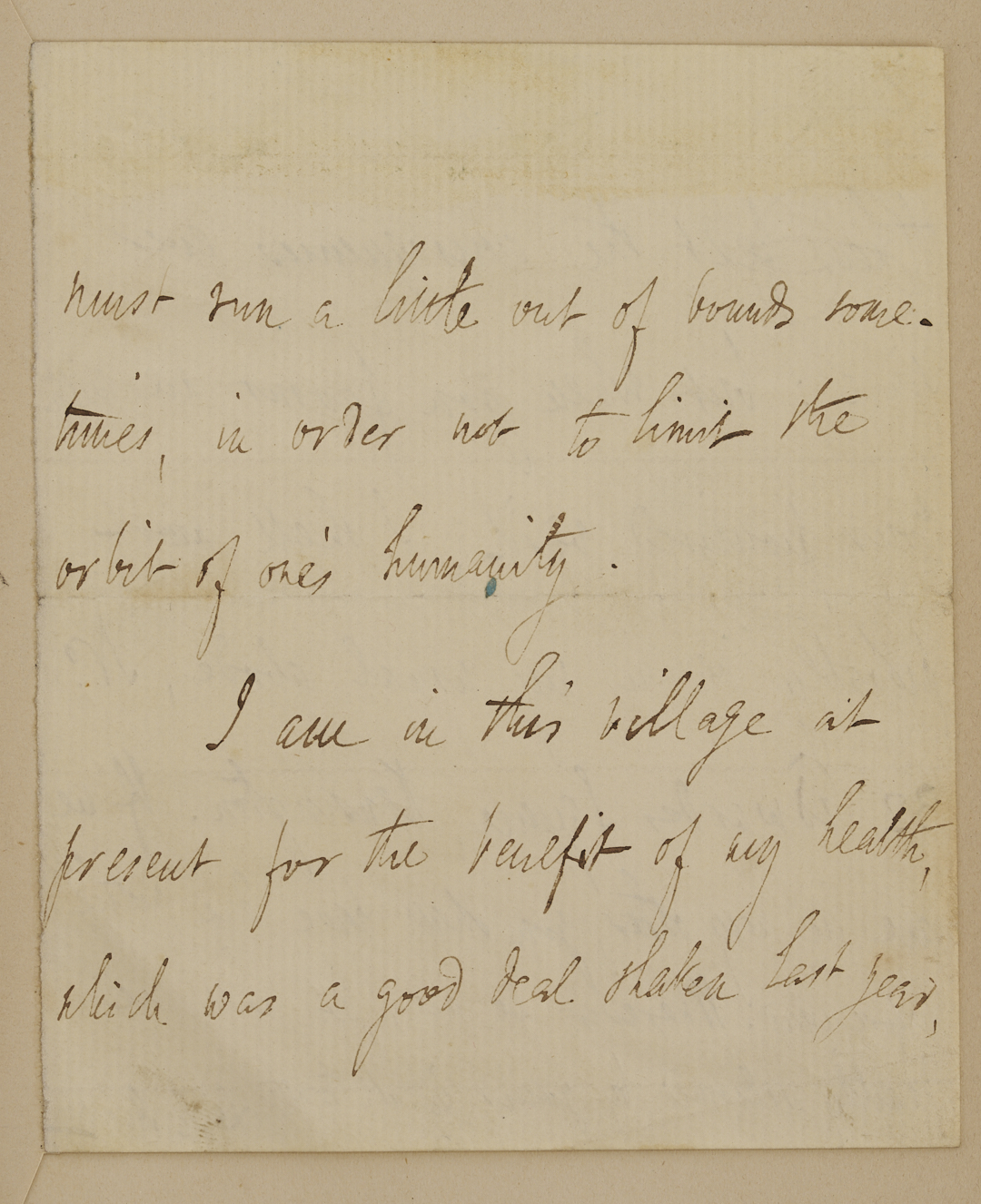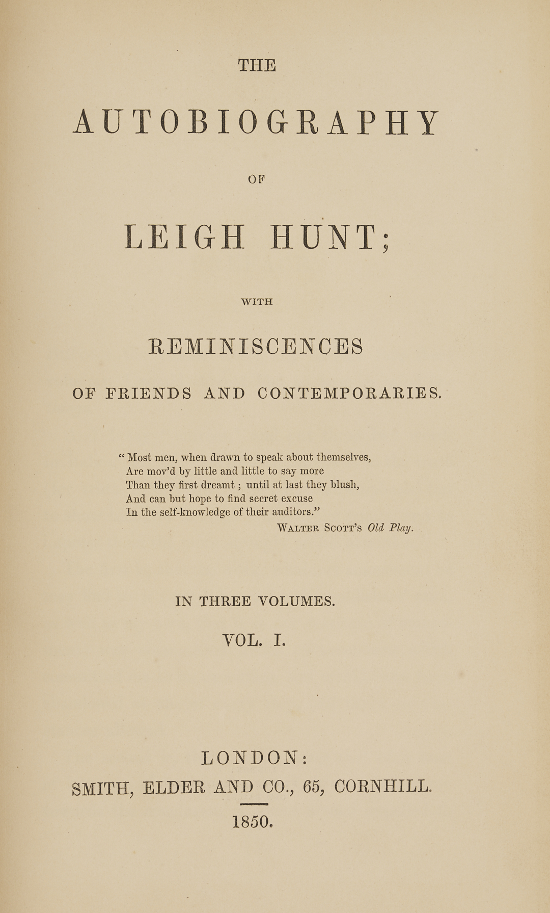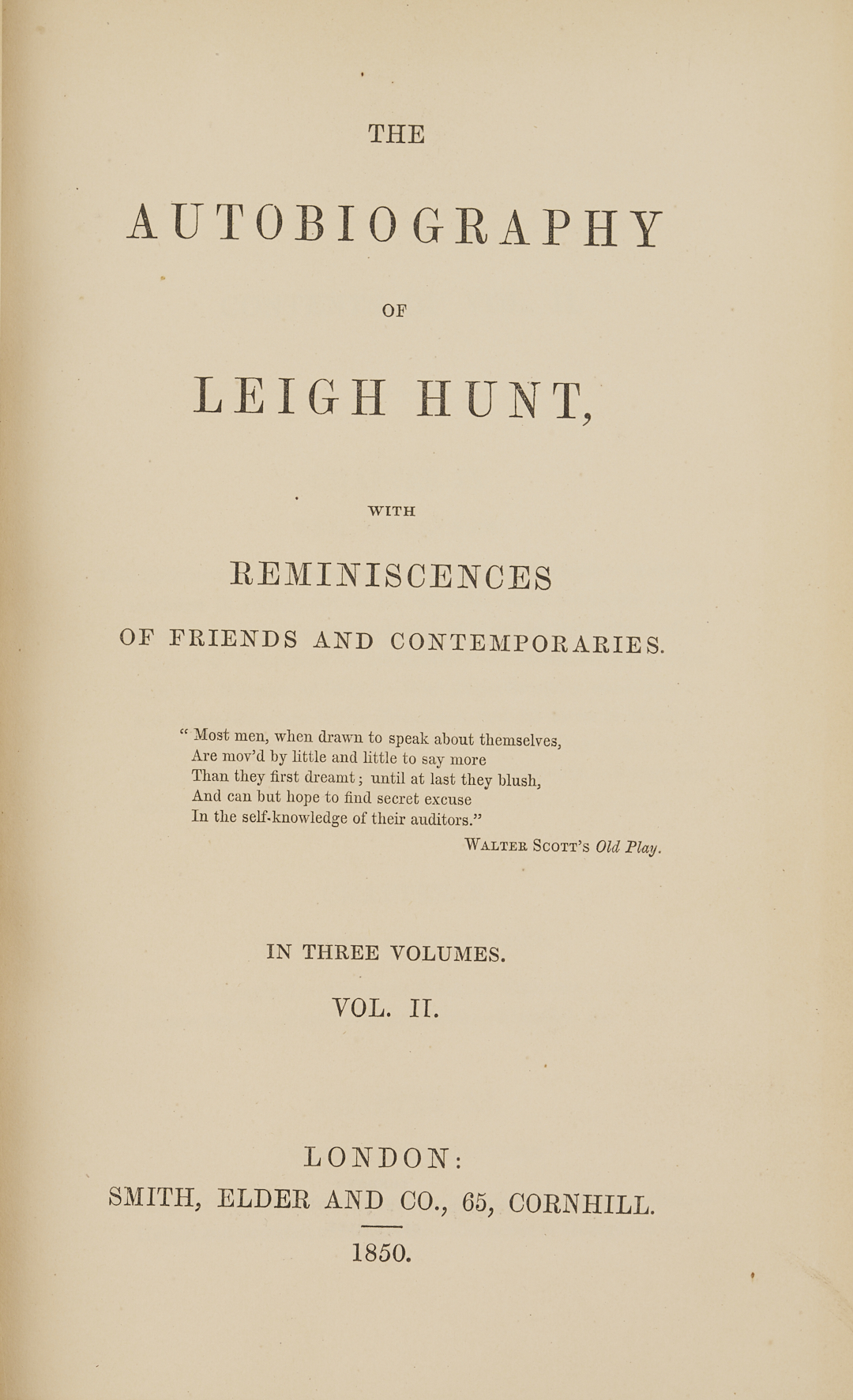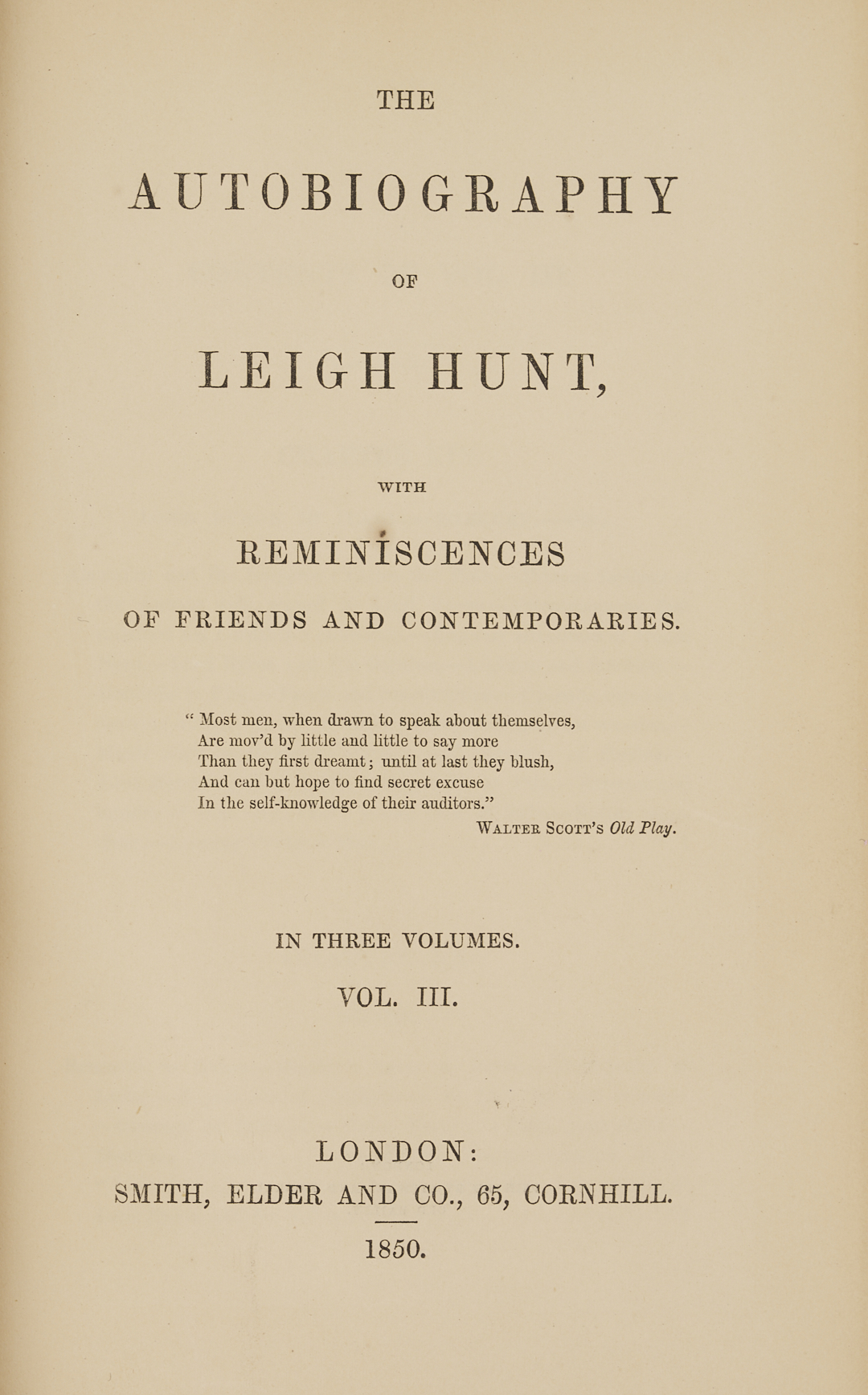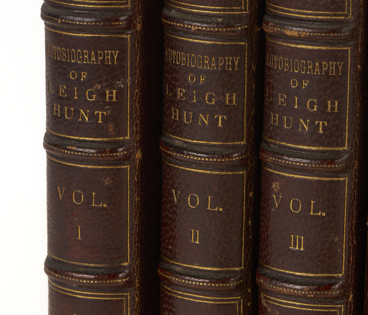 4th – 6th Items: THE AUTOBIOGRAPHY OF LEIGH HUNT; with Reminiscences of Friends and Contemporaries. In Three Volumes. London: Smith, Elder and Co., 1850. First Edition 8vo. in 19th C. fine binding, with a small letter signed by Hunt in 1st Volume bound in before half title. The short, two-page letter references Hunt’s recovery from a recent illness and returning to his home in Kensington. Bound in 3/4 brown calf with marbled boards and endpapers, gilt-decorated spines, five raised bands, top edges gilt. “Bartlett & Co., Boston” and “Bound by Zaehnsdorf” on front endpaper. 8 x 5 3/8 in.