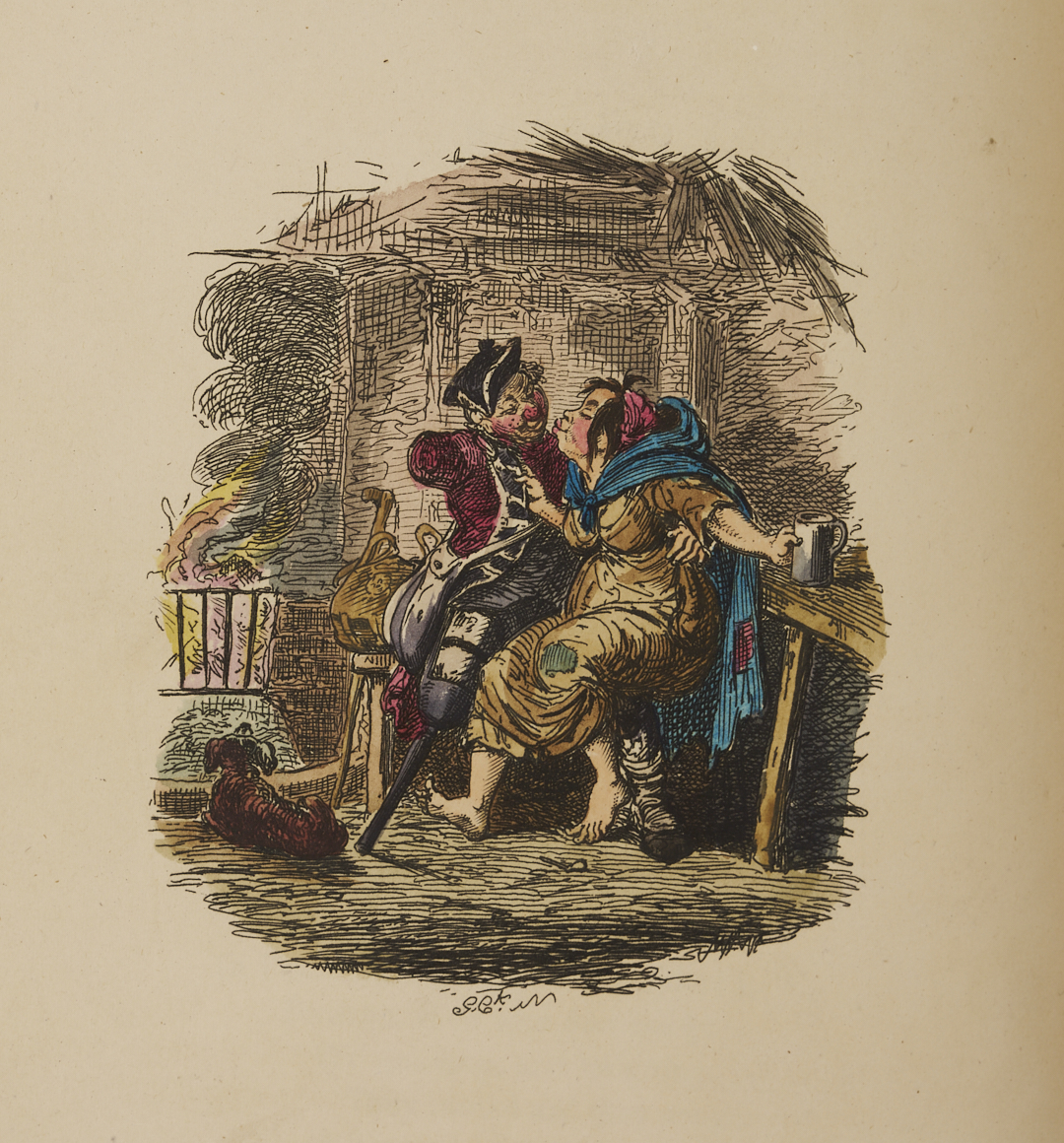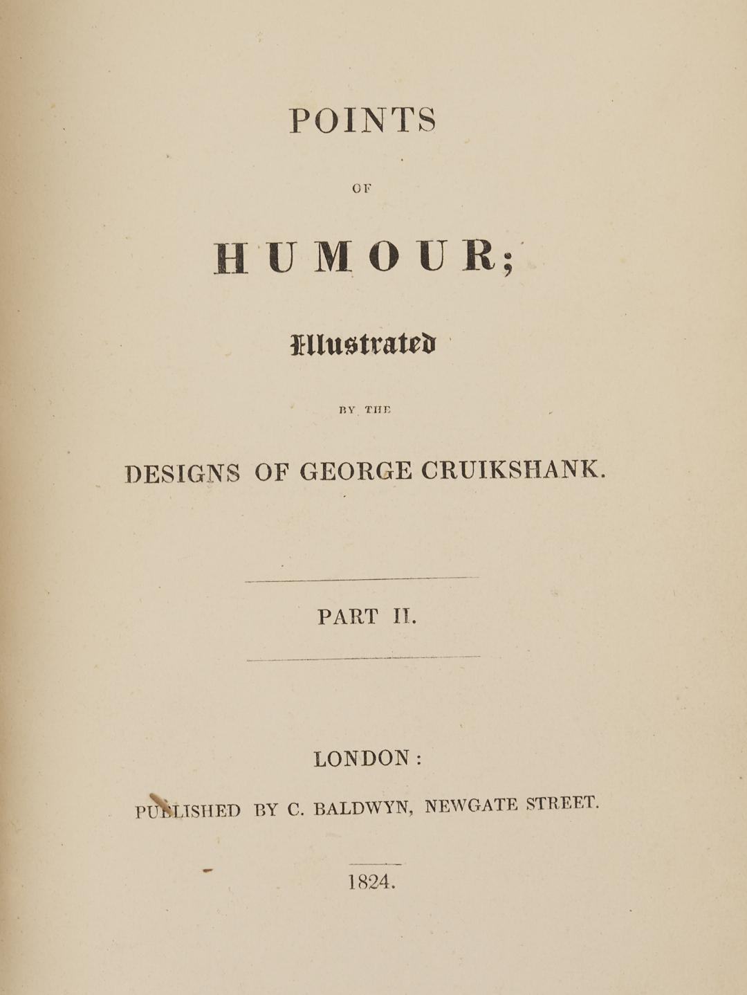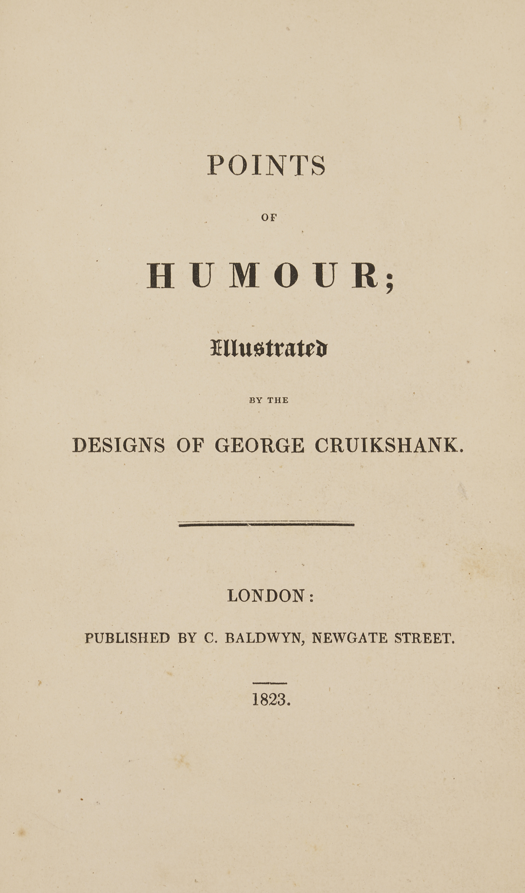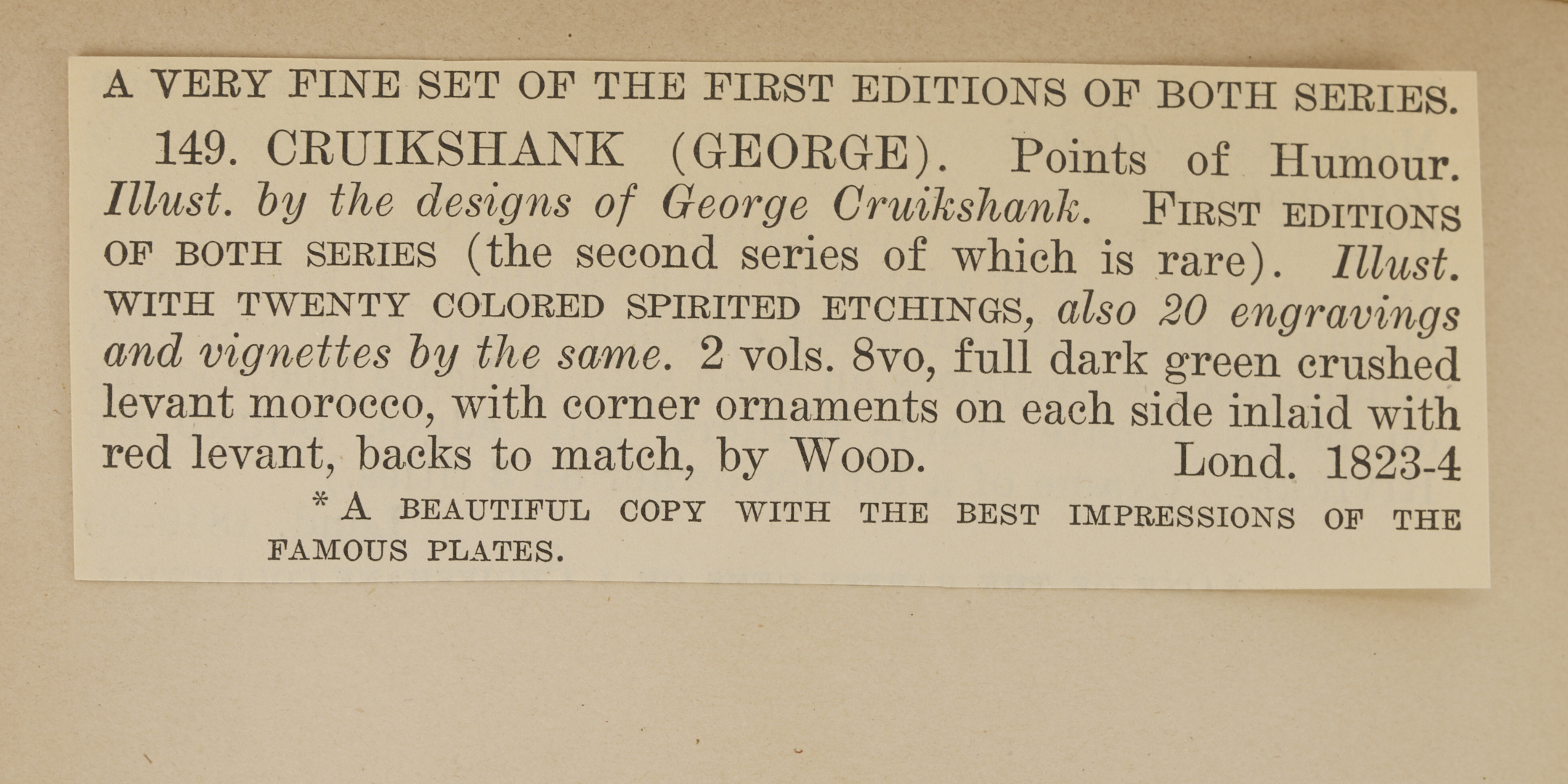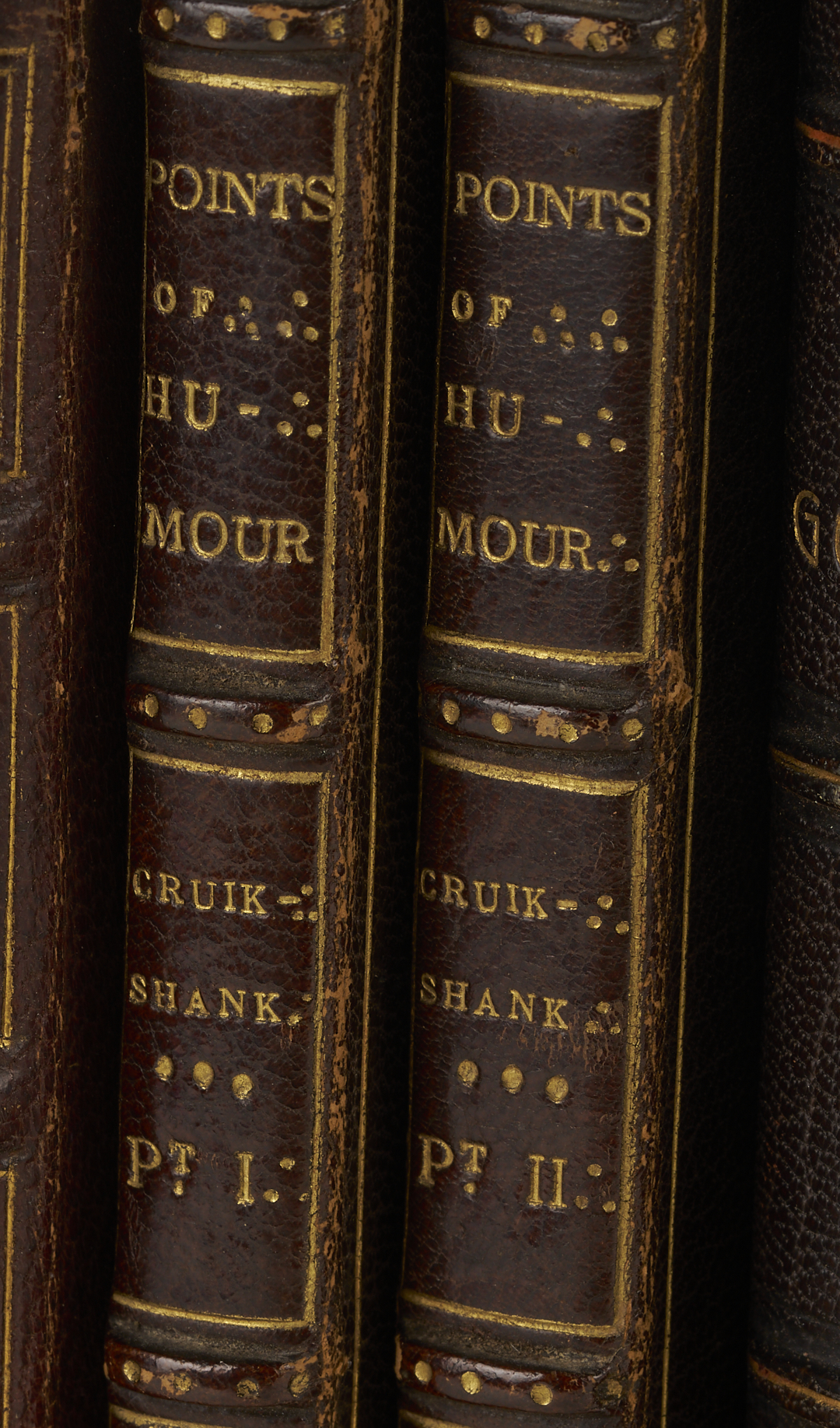 2nd – 3rd Items: POINTS OF HUMOUR, George Cruikshank (1792-1878). London: C. Baldwyn, 1823. First Edition. 2 volumes, 8vo. with 20 hand-colored plates. Gilt-stamped “Bound by Wood” to lower front turn in; 19th century dark green leather with gilt designs to covers and spines, with 5 raised bands, top edges gilt. Each 9 1/4 x 5 3/4 in.