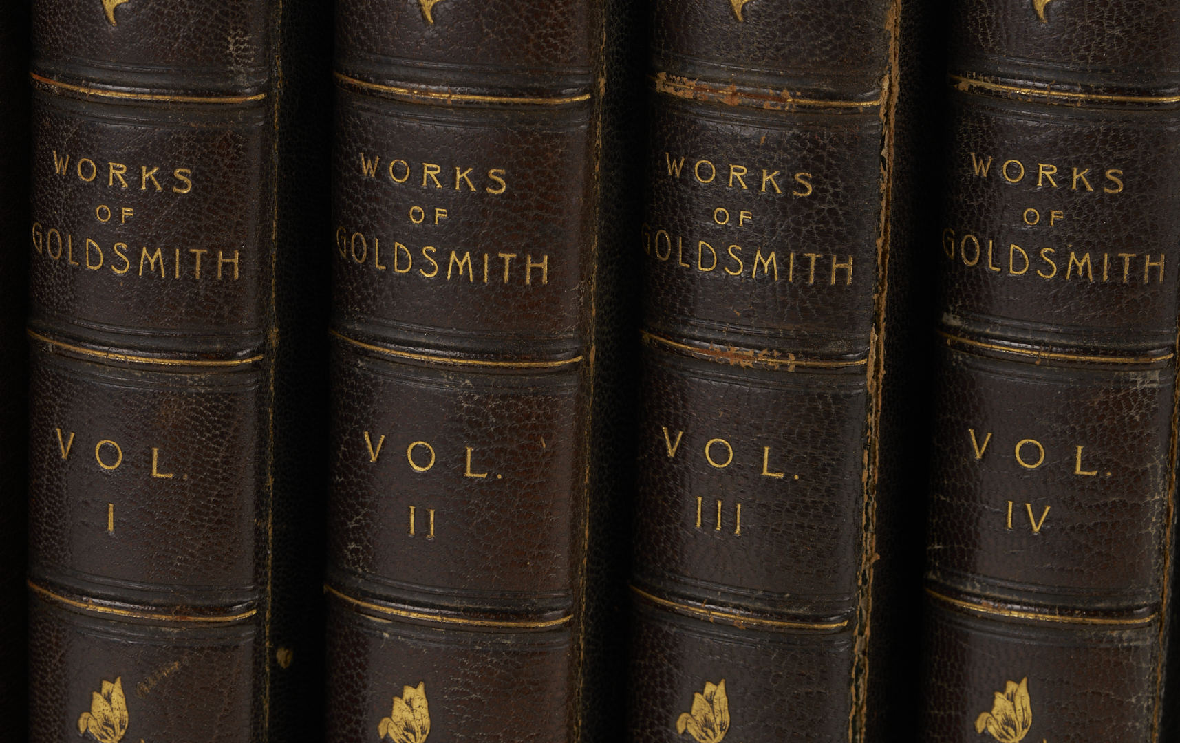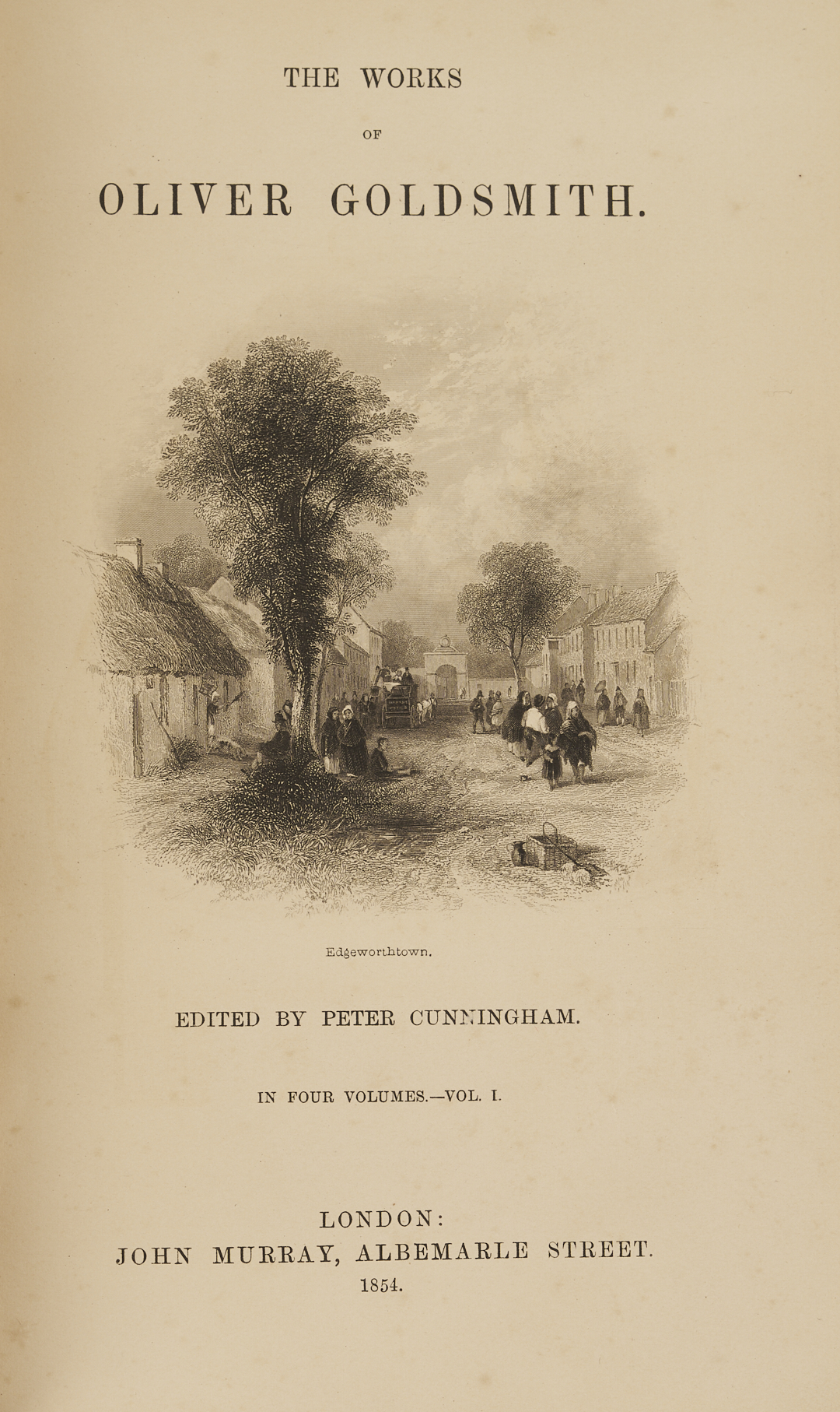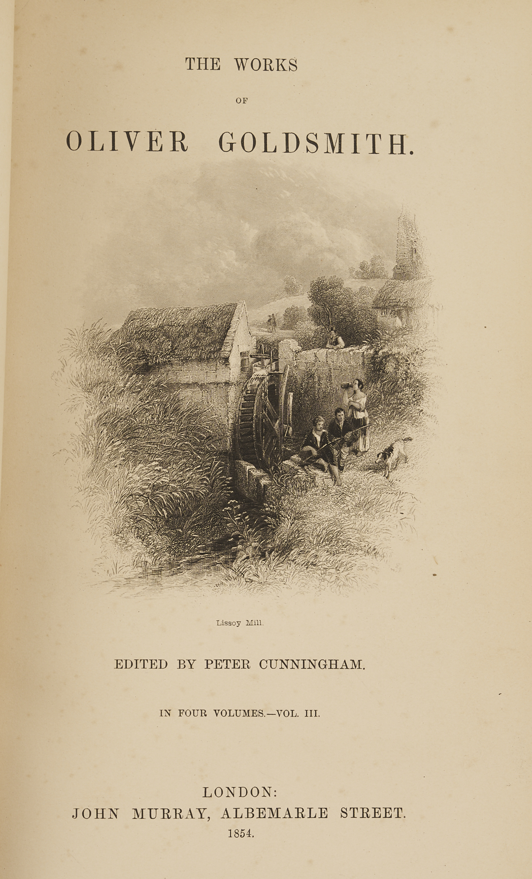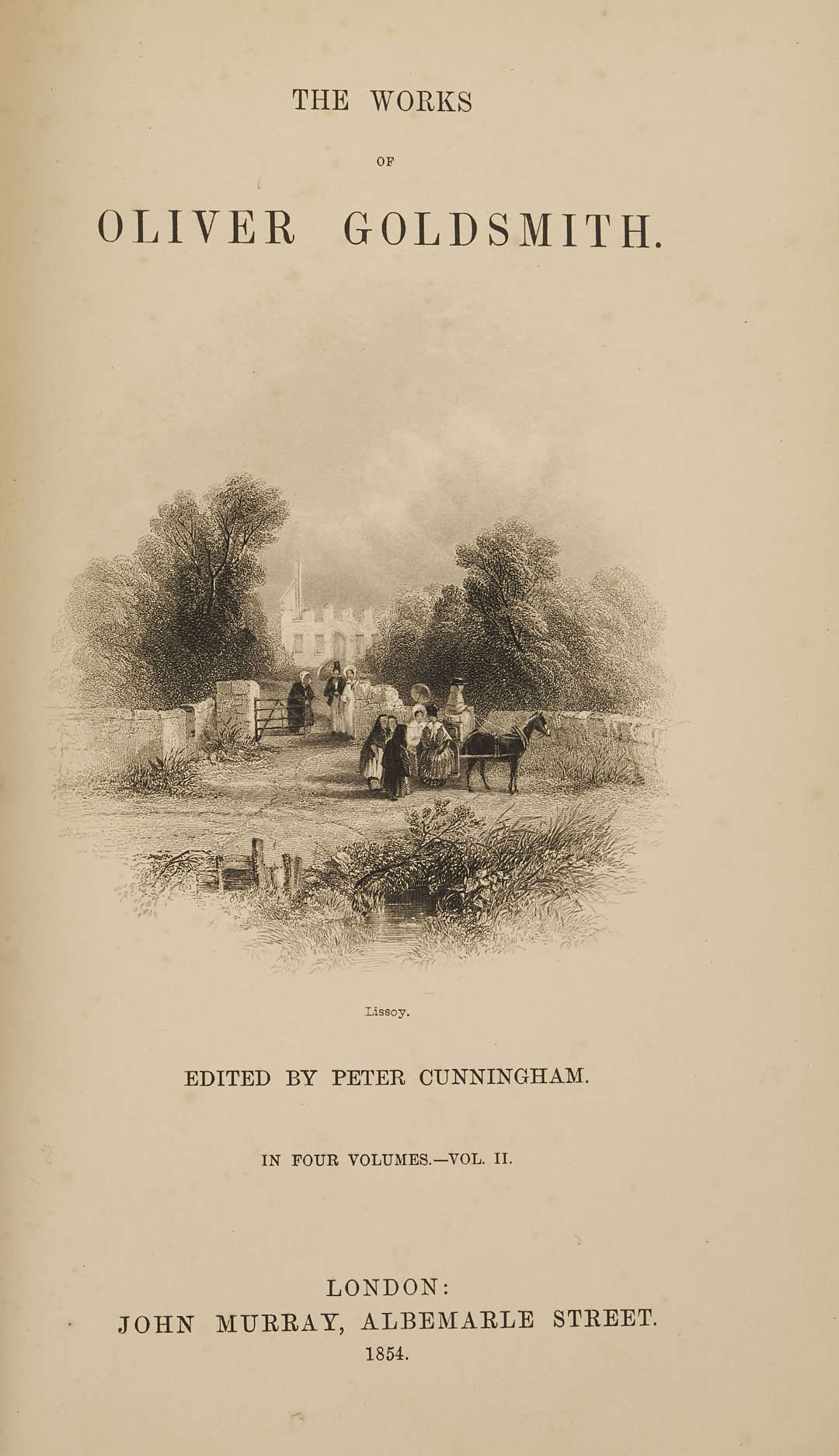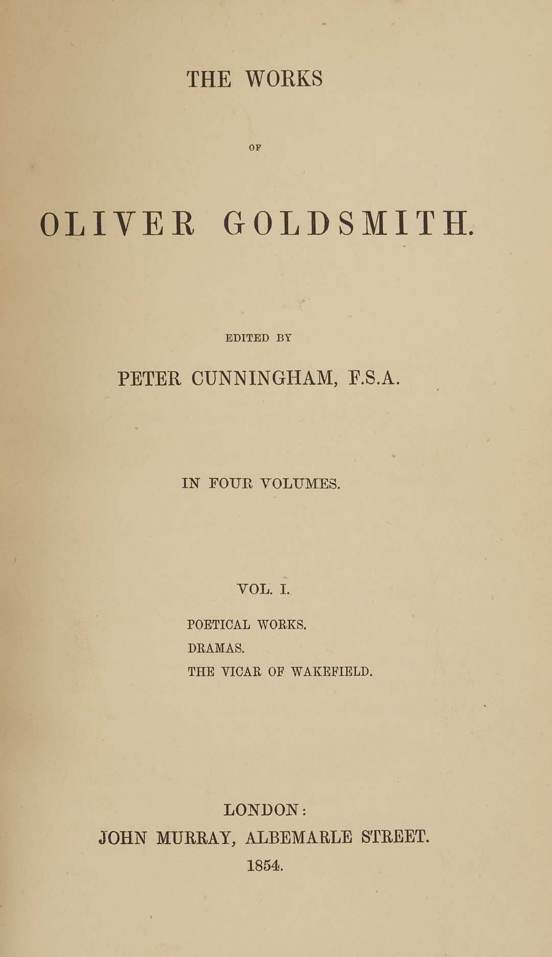 7th – 10th Items: THE WORKS OF OLIVER GOLDSMITH, Edited by Peter Cunningham. London: John Murray, 1854. 4 volumes, First Edition. Each with additional Illustrated title pages; Vol I with frontispiece. 8vo, Finely bound by Zaehnsdorf in 3/4 brown calf with marbled boards and endpapers, gilt-decorated spines, five raised bands, top edges gilt, other edges untrimmed. 8 1/2 x 5 1/2 in.