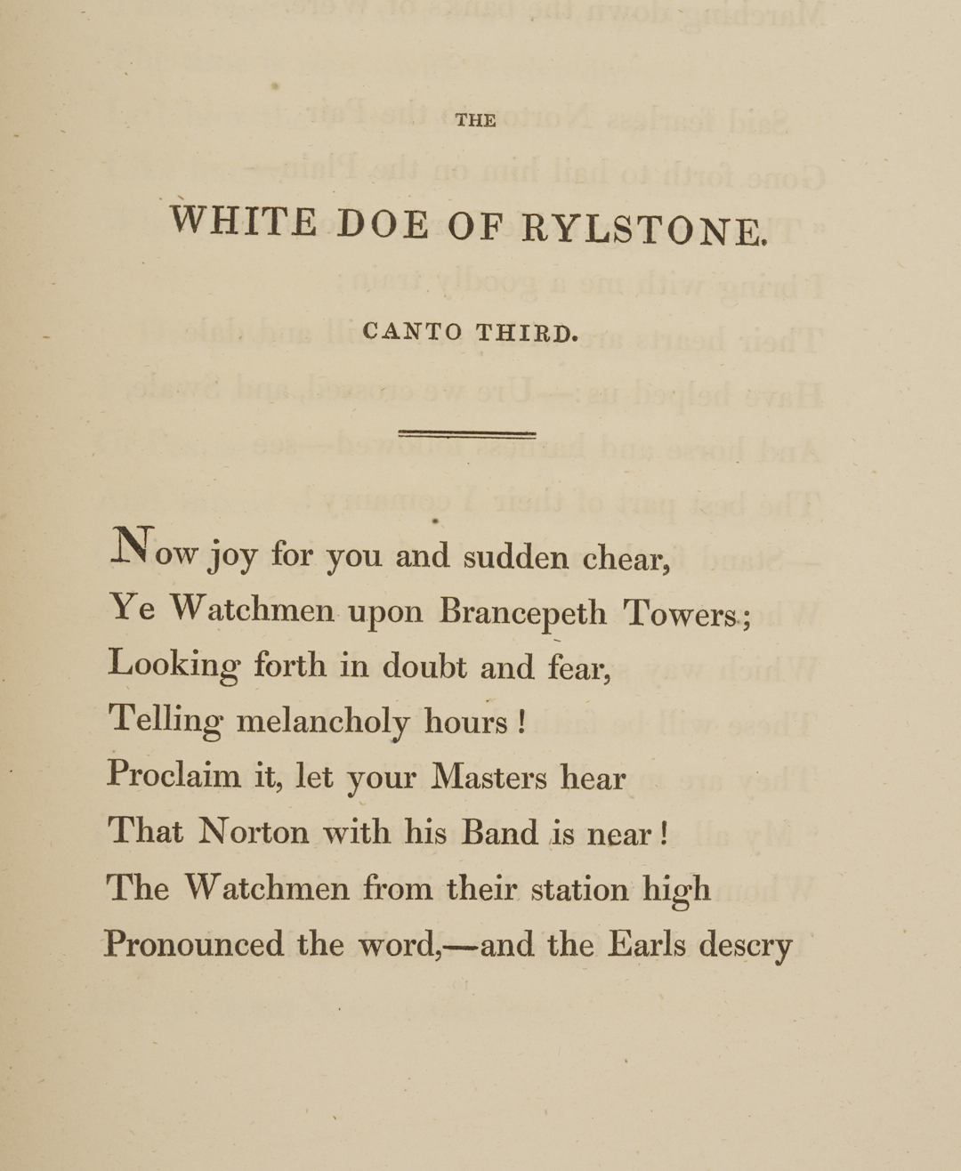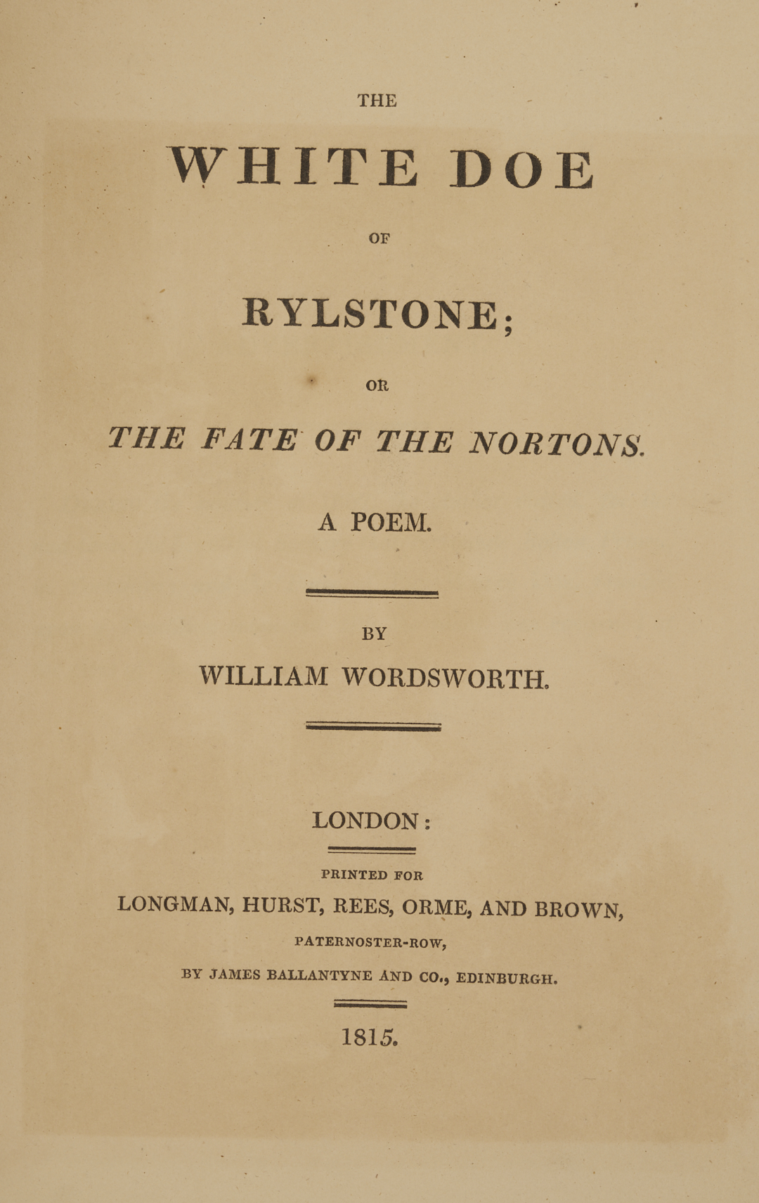 A grouping of ten (10) 19th Century First Edition books, by William Wordsworth, George Cruikshank, Leigh Hunt, and Oliver Goldsmith. 1st Item: THE WHITE DOE OF RYLSTONE; Or the Fate of the Nortons. A poem, by William Wordsworth. First edition, half-title, engraved frontispiece by J.C. Bromley after Sir George Beaumont. Printed for Longman, Hurst, Rees, Orme, and Brown, by James Ballantyne and Co., 1815. 11 3/8 x 9 in.