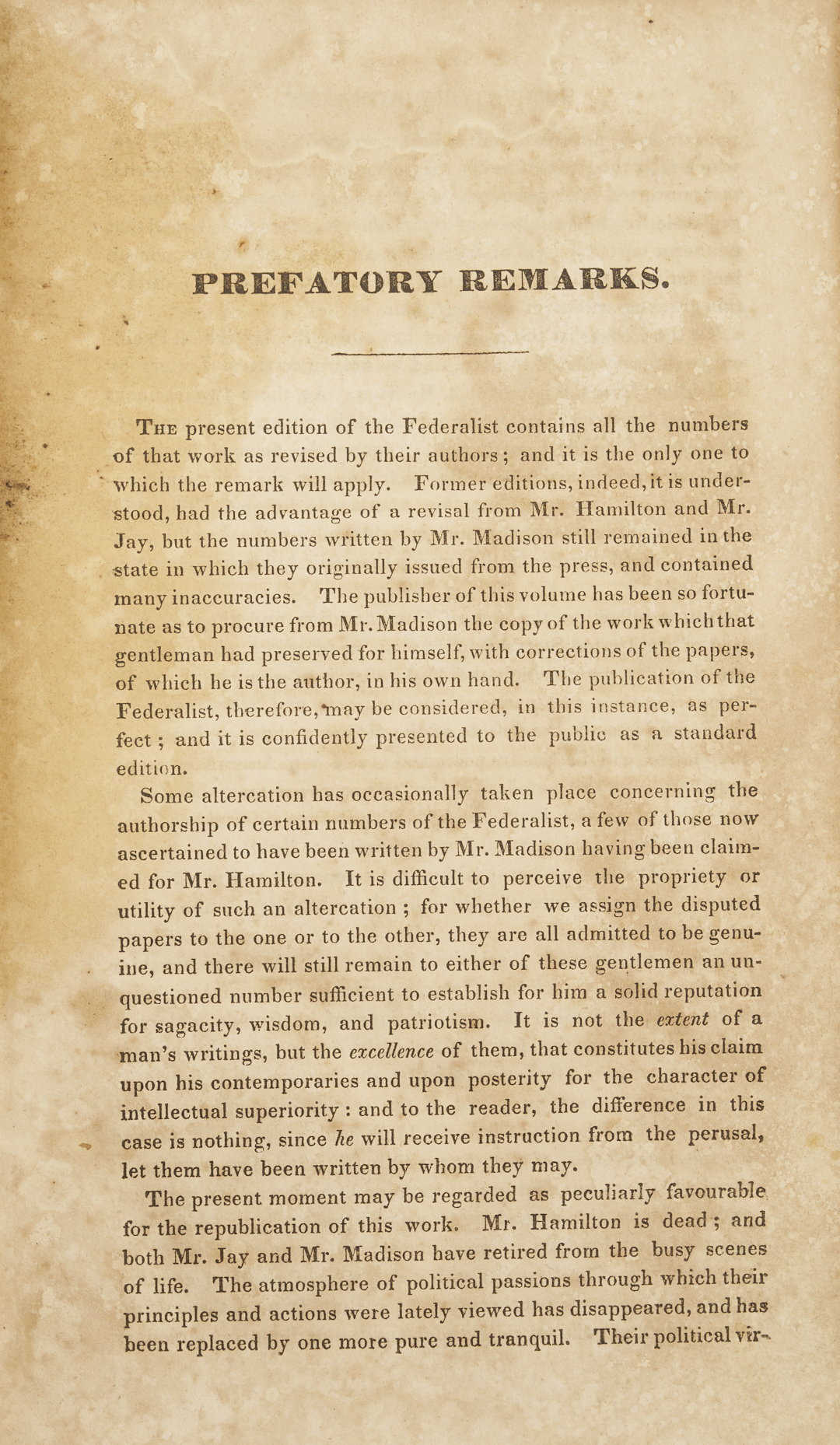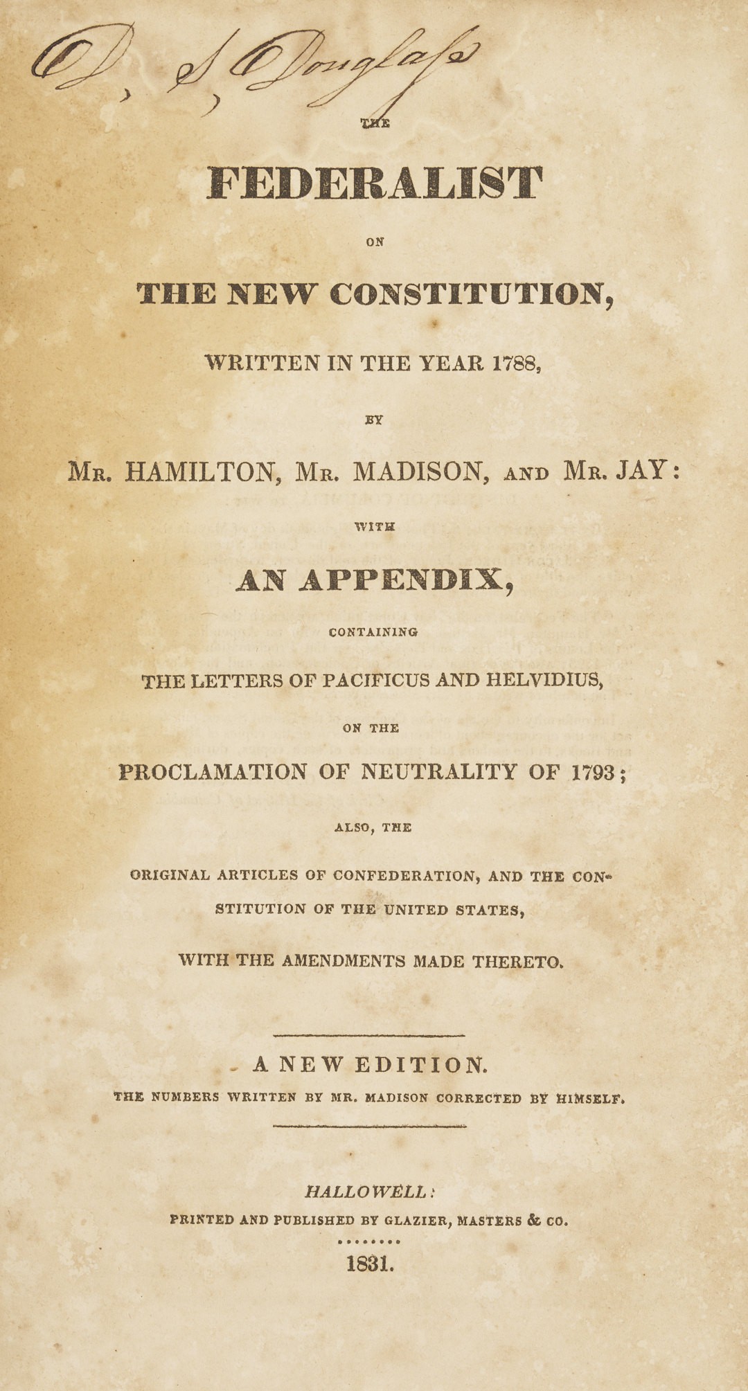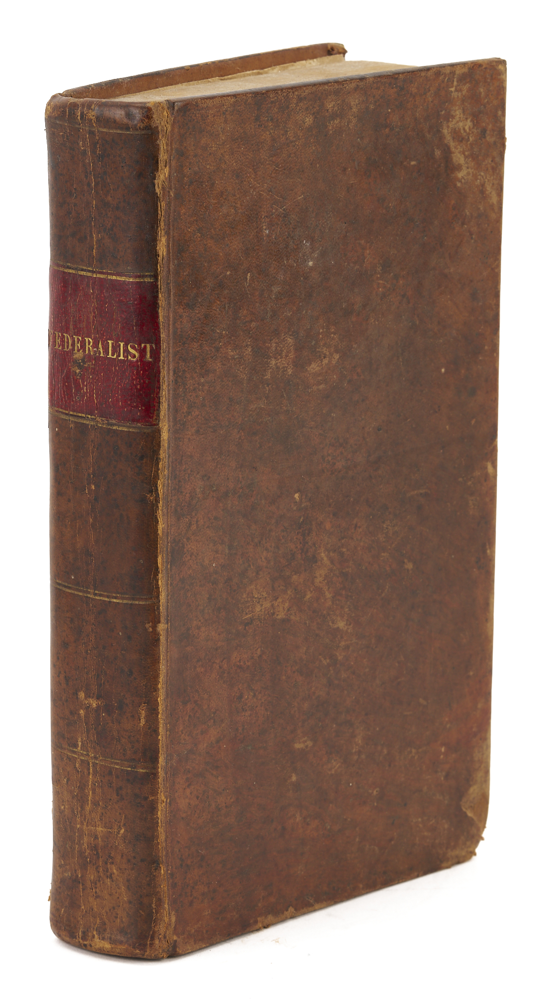 4th Item: THE FEDERALIST ON THE NEW CONSTITUTION by Alexander Hamilton, James Madison, John Jay. Hallowell [ME]: Glazier, Masters & Co., 1831. 8vo, hardcover in period leather bindings with red leather title block and gilt highlights to spine. 542 pp including previously unpublished index. This later edition contains Madison’s corrections, as well as the earlier corrections by Hamilton and Jay. 8 ¾ in. x 5 in.