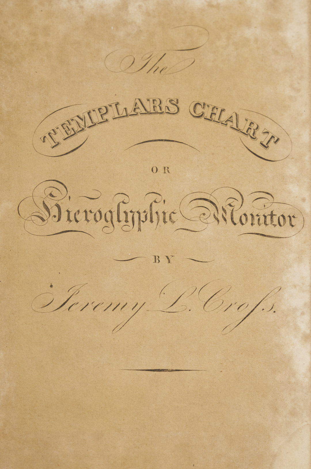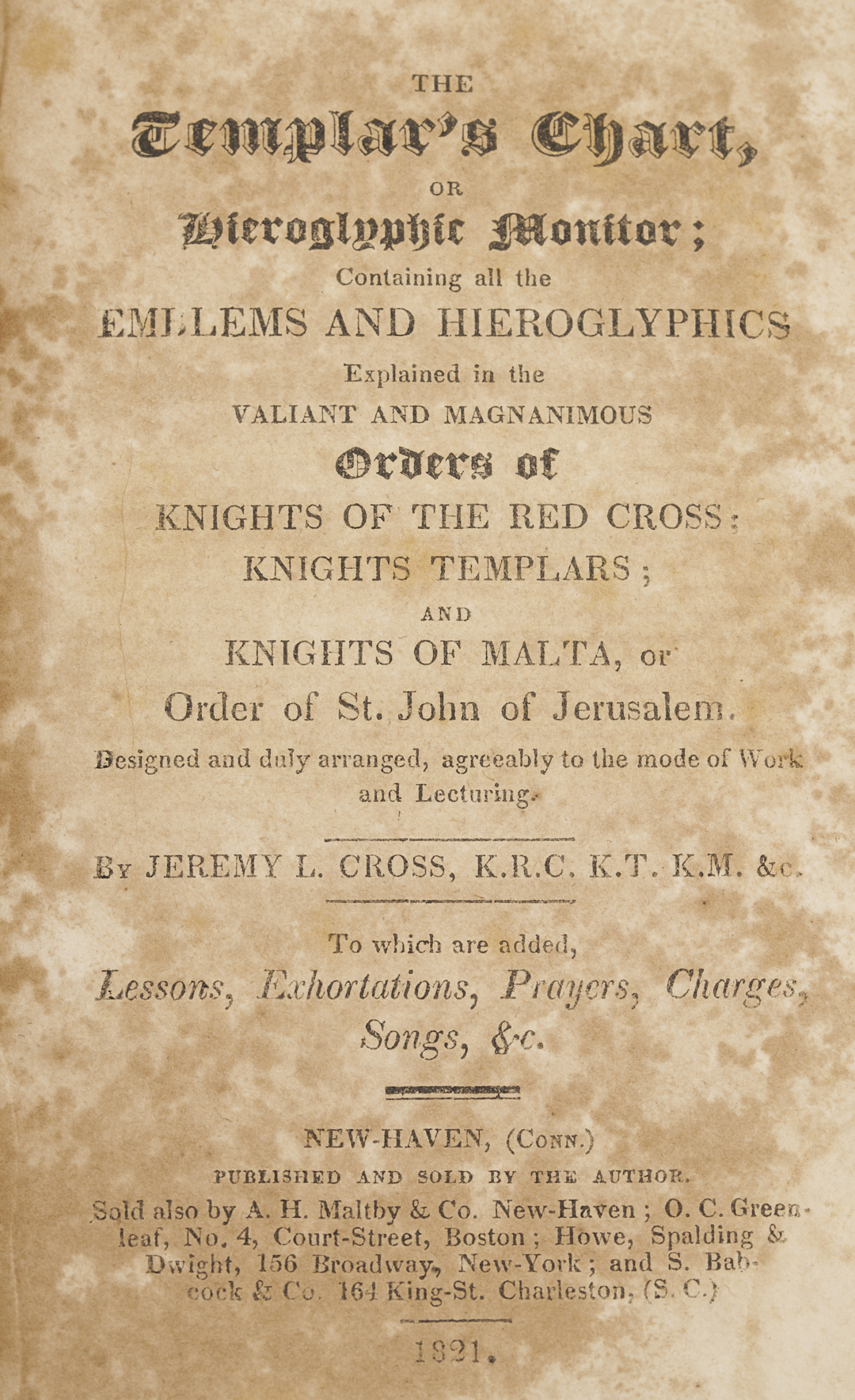 3rd Item: THE TEMPLAR’S CHART, OR HIEROGLYPHIC MONITOR… by Jeremy Cross, New Haven: Published and sold by the author; A. H. Maltby & Co., Printers, 1821. First Edition. 12mo, Full brown leather with red leather label, gilt lettering and highlights to spine. 10-157 pp. including engraved half title, engraved frontispiece, and musical notation in pp. 111-156, plus 21 leaves of plates (1-20 numbered), complete. Jeremy Ladd Cross (1783-1860) followed his earlier book of Masonic emblems, THE TRUE MASONIC CHART, with this publication specifically for the Christian orders of Freemasons in the United States. Along with lessons, manuals, and songs, THE TEMPLAR’S CHART contains plates of Masonic symbols, schematics, and Biblical scenes. Scarce. 4 in. x 6 ½ in.