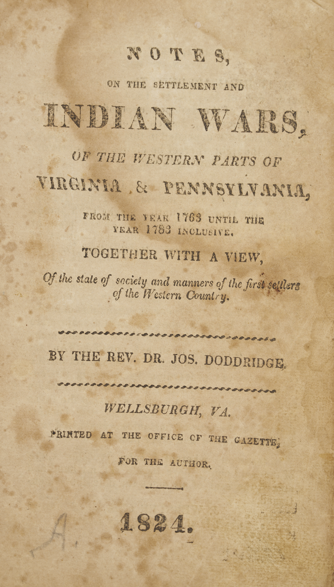 2nd Item: NOTES ON THE SETTLEMENT AND INDIAN WARS OF THE WESTERN PARTS OF VIRGINIA AND PENNSYLVANIA, FROM THE YEAR 1763 UNTIL THE YEAR 1783 INCLUSIVE by Joseph Doddridge, Wellsburgh, VA: Printed at the Office of the Gazette for the Author, 1824. Full contemporary leather, 16-316 pp. First Edition of Rev. Dr. Joseph Doddridge’s (1769-1826) firsthand account of life on the Western Frontier along the Allegheny Mountains, including numerous conflicts with Native Americans. 6 7/8 in. x 4 1/4 in.