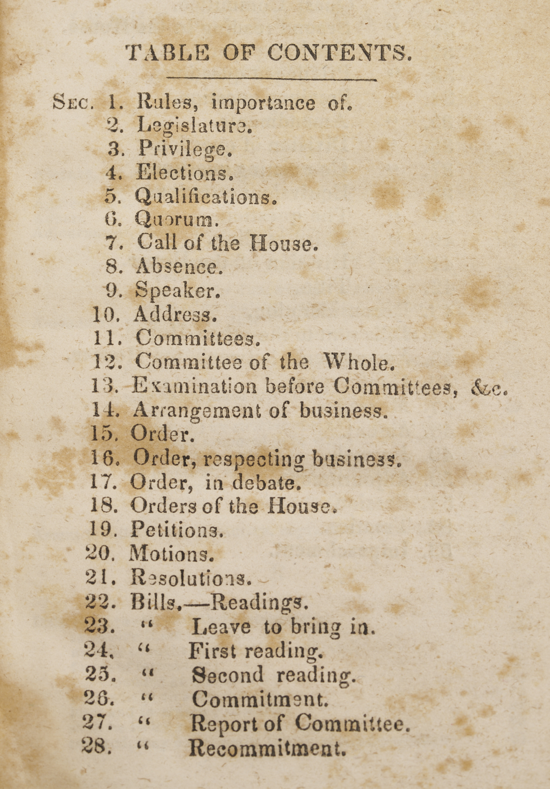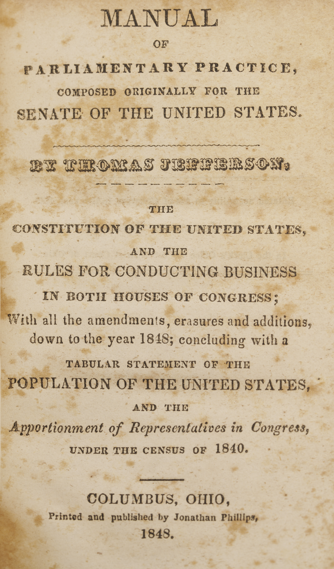 1st Item: MANUAL OF PARLIAMENTARY PRACTICE COMPOSED ORIGINALLY FOR THE USE OF THE SENATE OF THE UNITED STATES by Thomas Jefferson. Columbus, Ohio: Jonathan Phillips, 1848. 12mo. 245pp, plus population table.