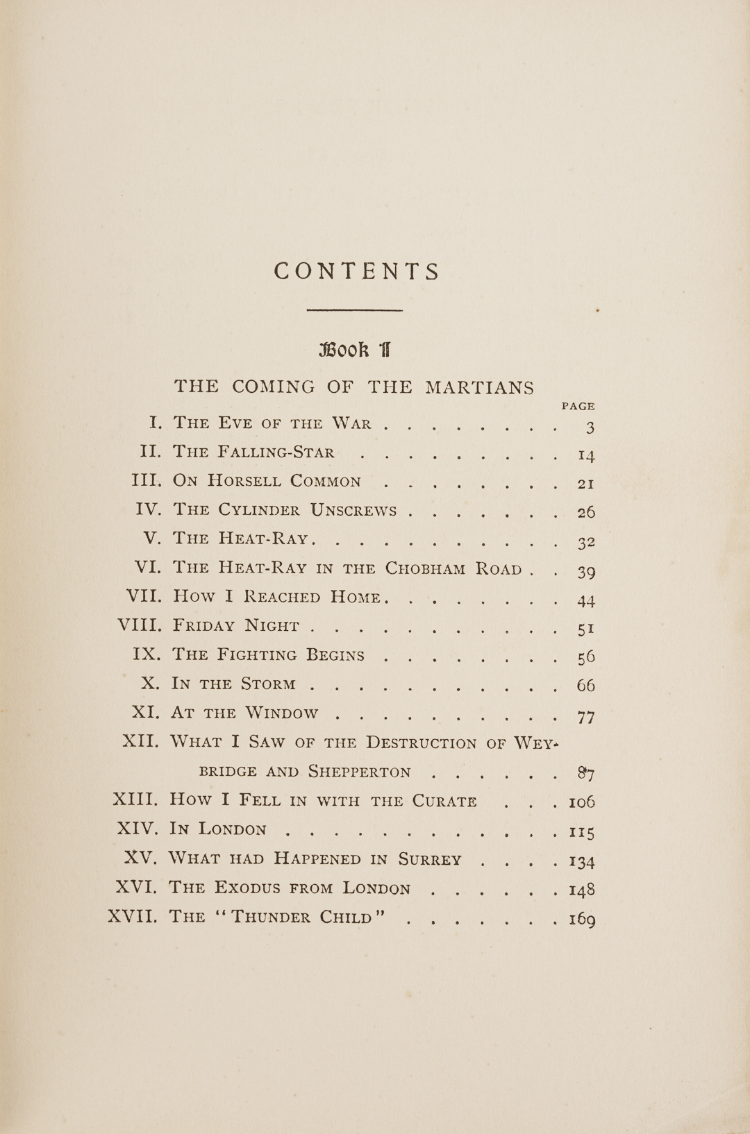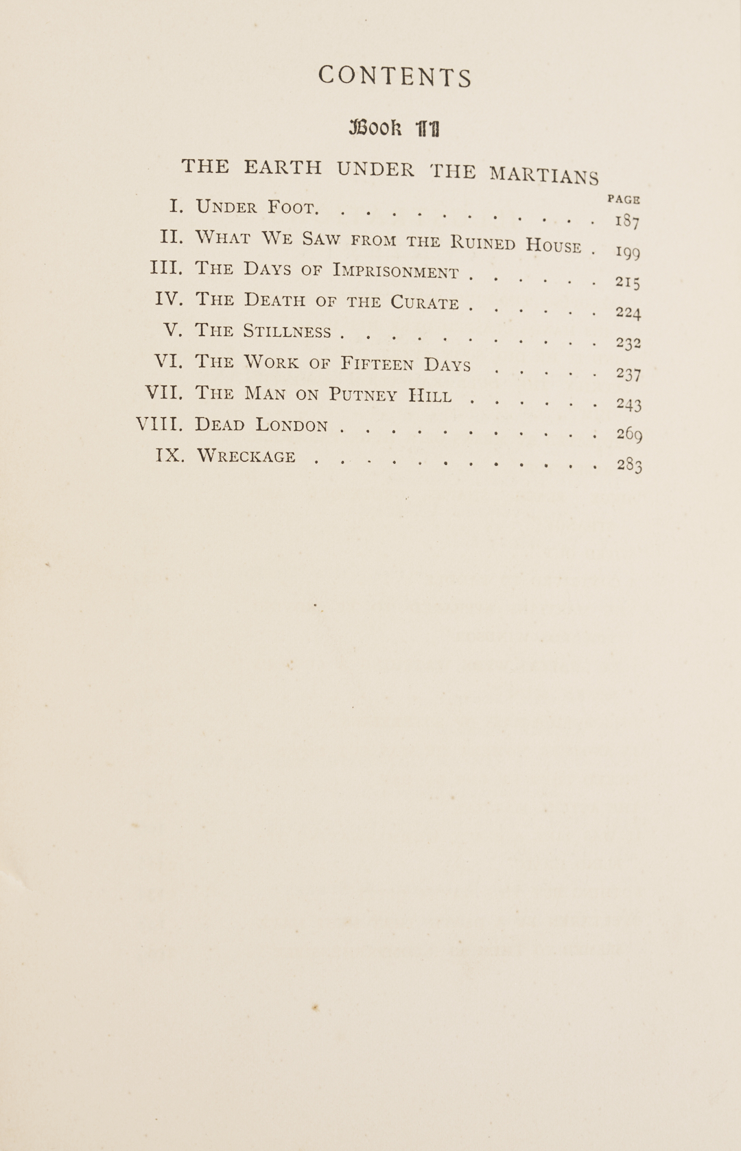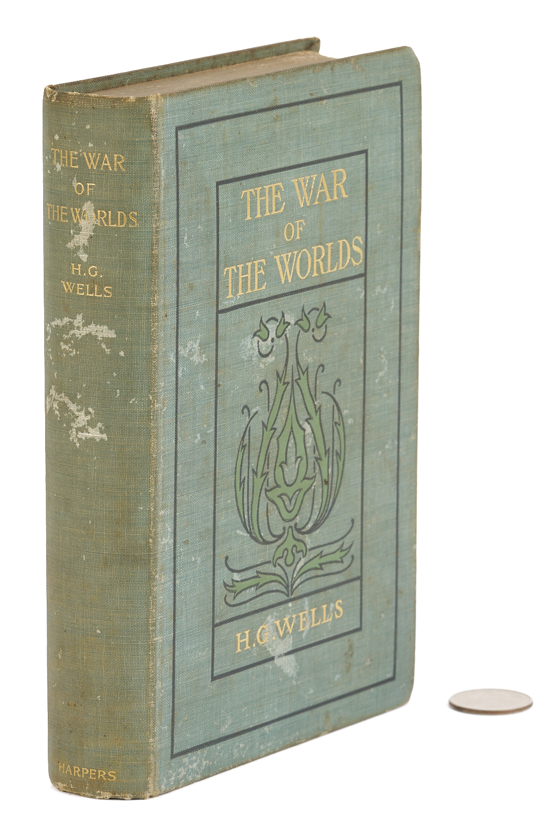 THE WAR OF THE WORLDS, by H.G. Wells. New York and London: Harper Brothers, 1898. First American Edition, Octavo, 291pp, hardbound in teal cloth decorated with a green floral design, gilt stamped title and author on cover and spine. 7 1/2 in H x 5 1/2 in W.