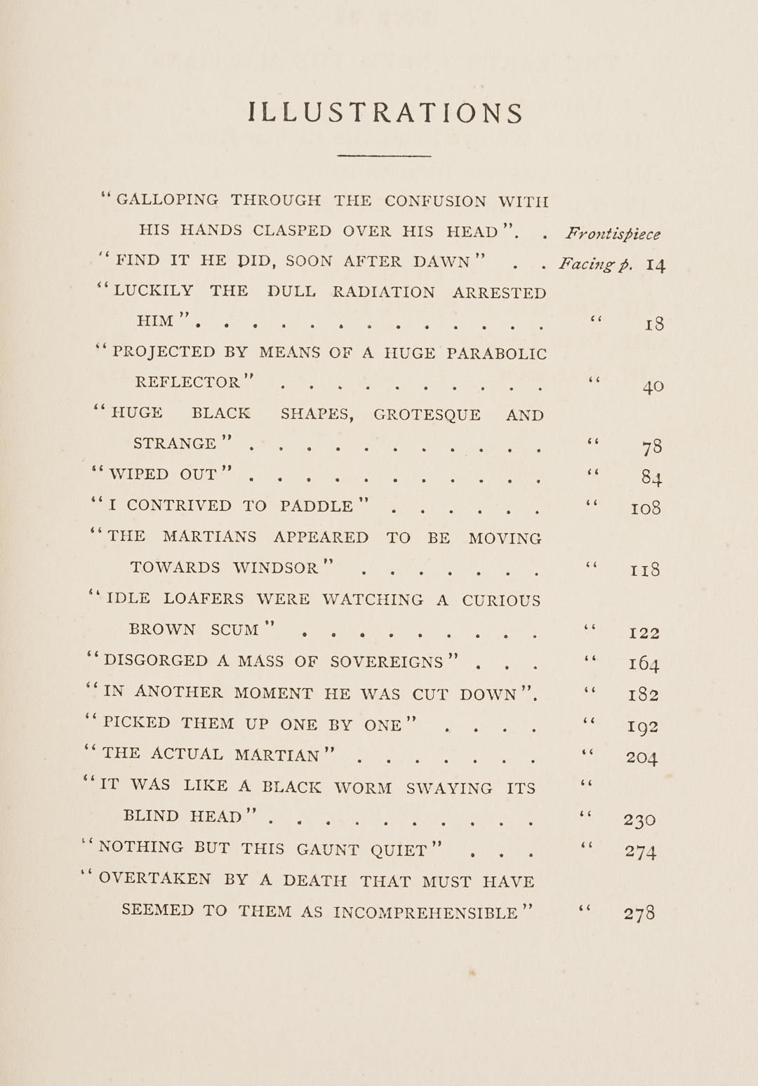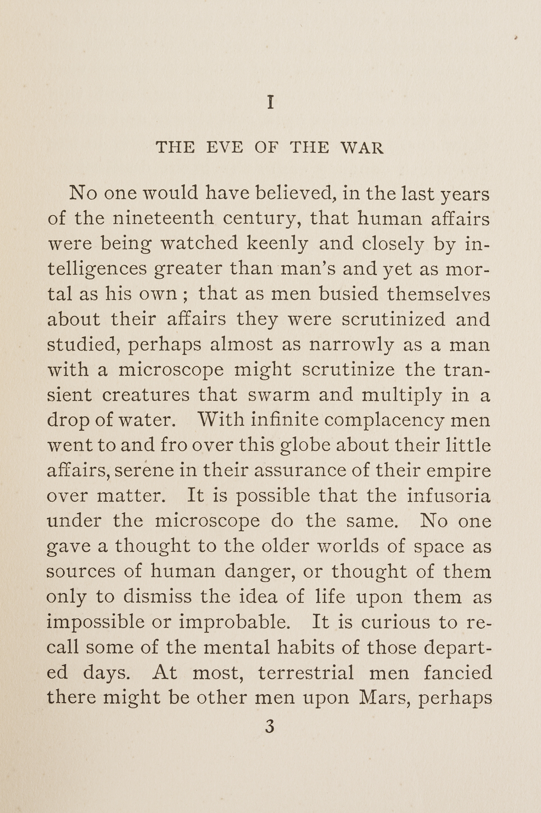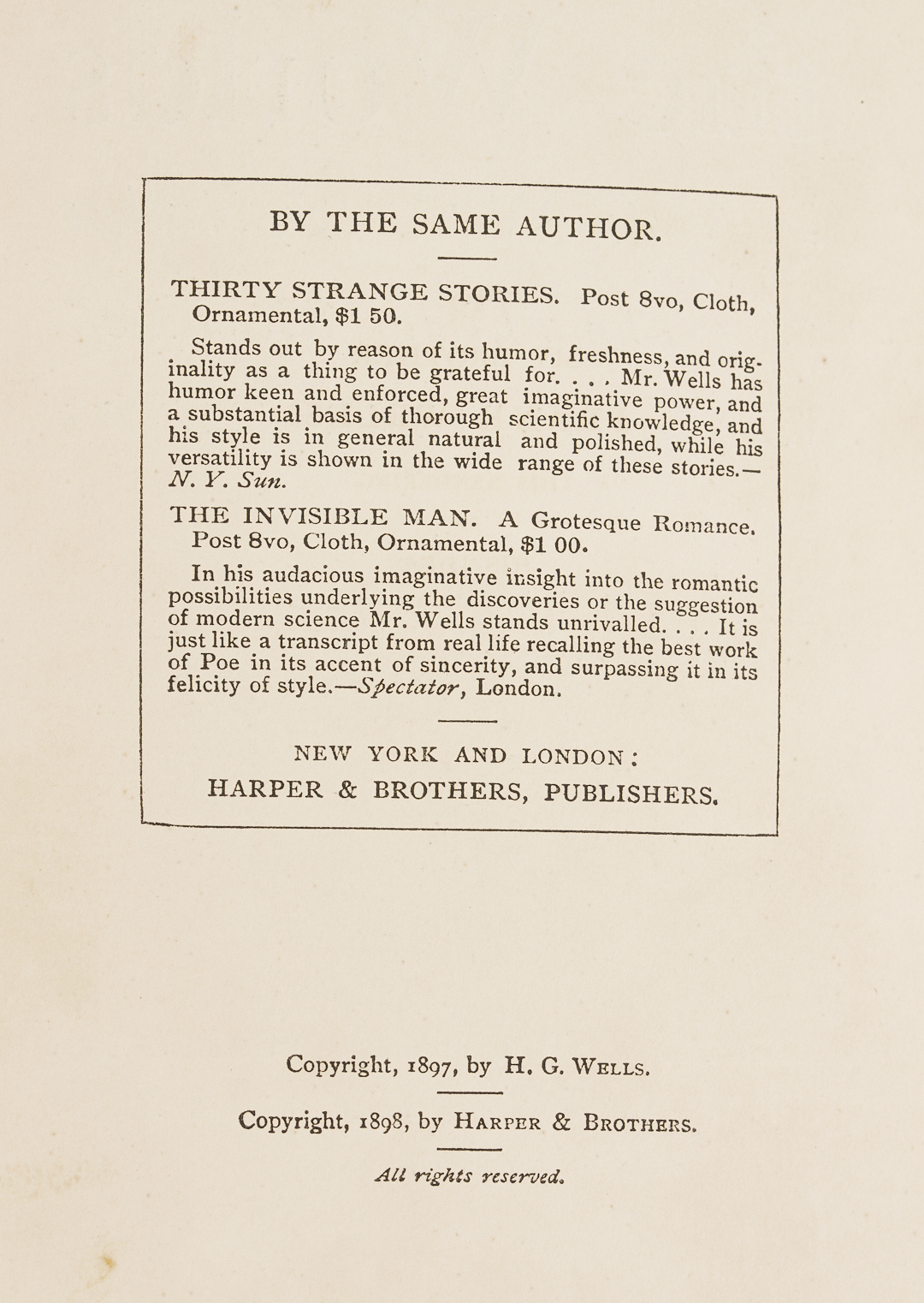 THE WAR OF THE WORLDS, by H.G. Wells. New York and London: Harper Brothers, 1898. First American Edition, Octavo, 291pp, hardbound in teal cloth decorated with a green floral design, gilt stamped title and author on cover and spine. 7 1/2 in H x 5 1/2 in W.