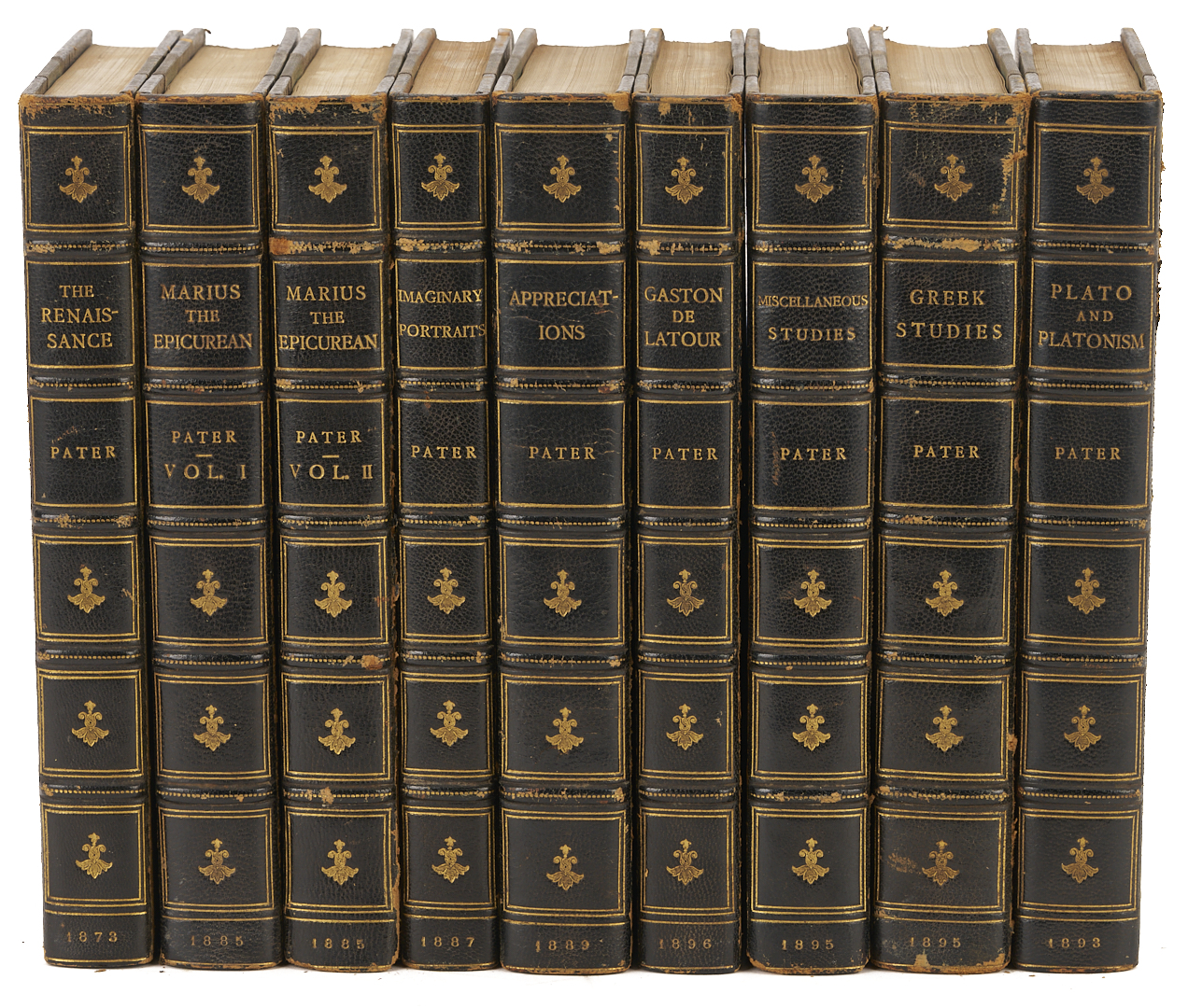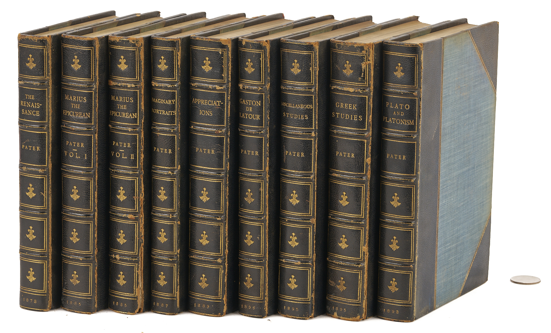 Nine (9) books by Walter Pater (1839-1894), first editions, uniformly bound by Riviere & Son in dark blue half leather and complementary blue cloth, with gold tooled titles, accents, 5 raised bands, and dates of publication; top edges gilt, 12mo. 8 1/4 in x 5 1/2 in. Bookplate of Lillian Stokes Gillespie in each.