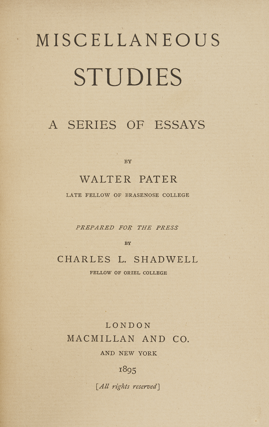 MISCELLANEOUS STUDIES: A SERIES OF ESSAYS. London: Macmillan & Co., 1895. 259pp. Ten essays on literature and art, all previously published in periodicals, compiled by Shadwell.