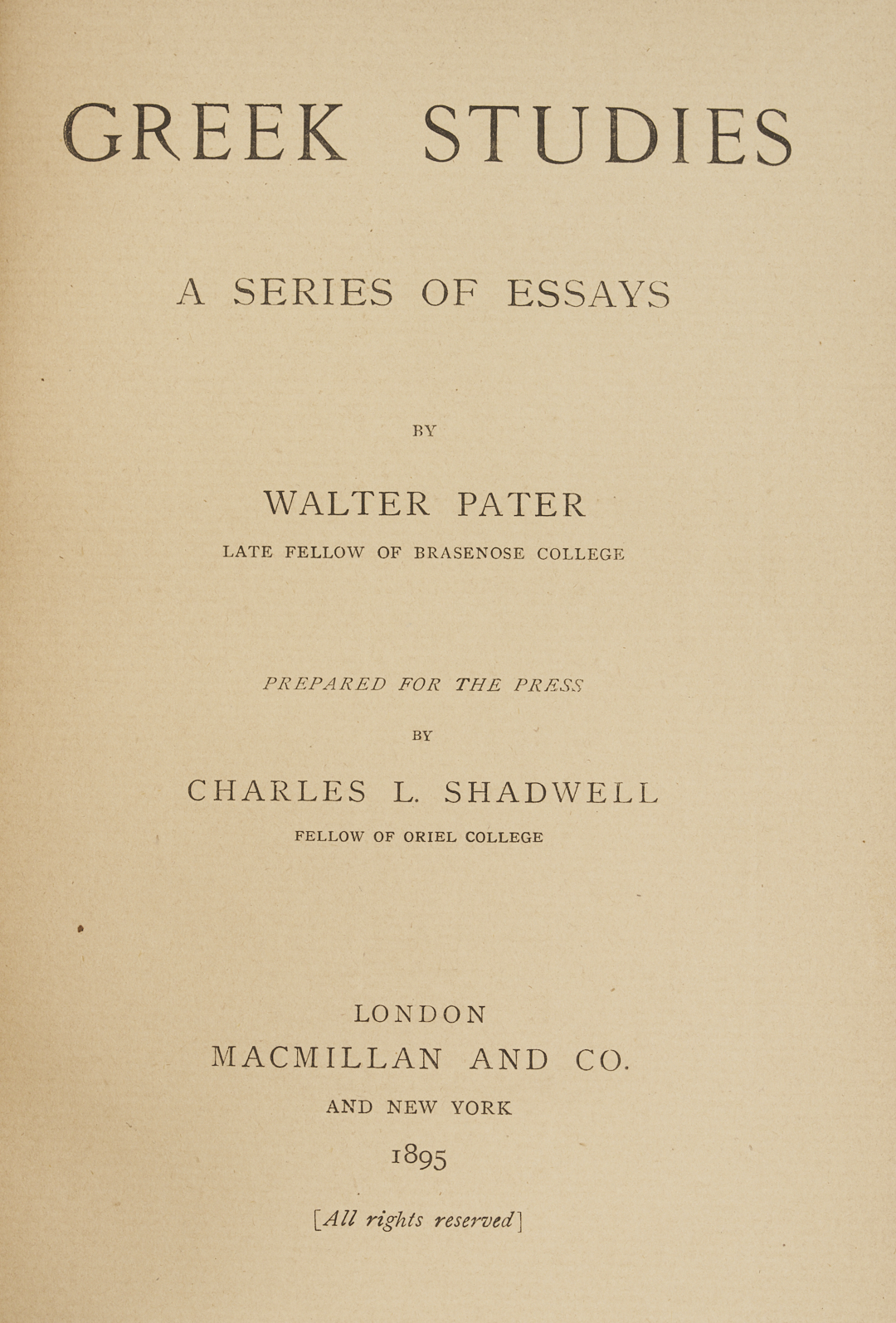 GREEK STUDIES. A SERIES OF ESSAYS. London: Macmillan & Co., 1895. 315pp. Compiled by Charles L. Shadwell, his literary executor, friend and fellow at Oriel College.