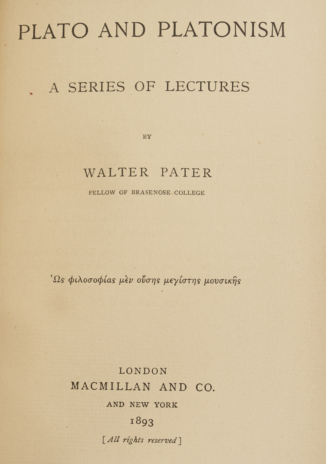 PLATO AND PLATONISM: A SERIES OF LECTURES. London: Macmillan & Co., 1893. 259pp. Ten lectures on Plato by Walter Pater, delivered to his students in philosophy at Oxford