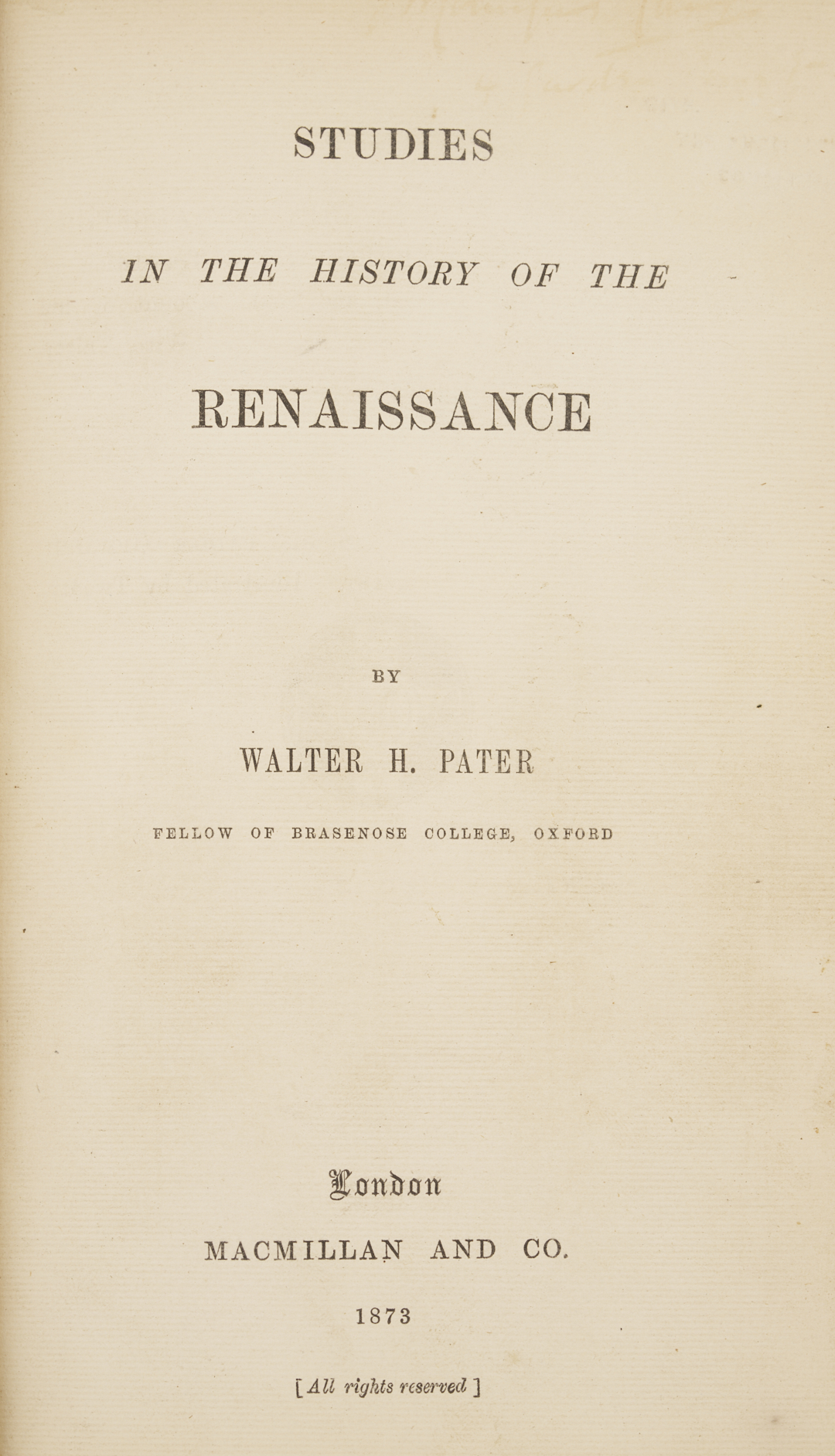 Titles Include: STUDIES IN THE HISTORY OF THE RENAISSANCE. London: Macmillan & Co., 1873. 213pp, author’s first published work, with his series of essays on Renaissance art.