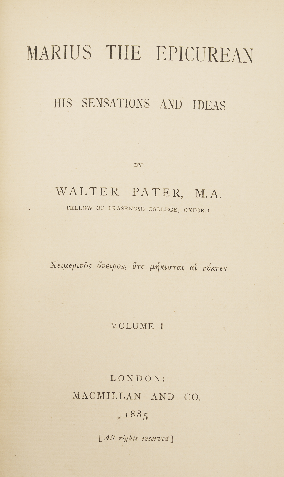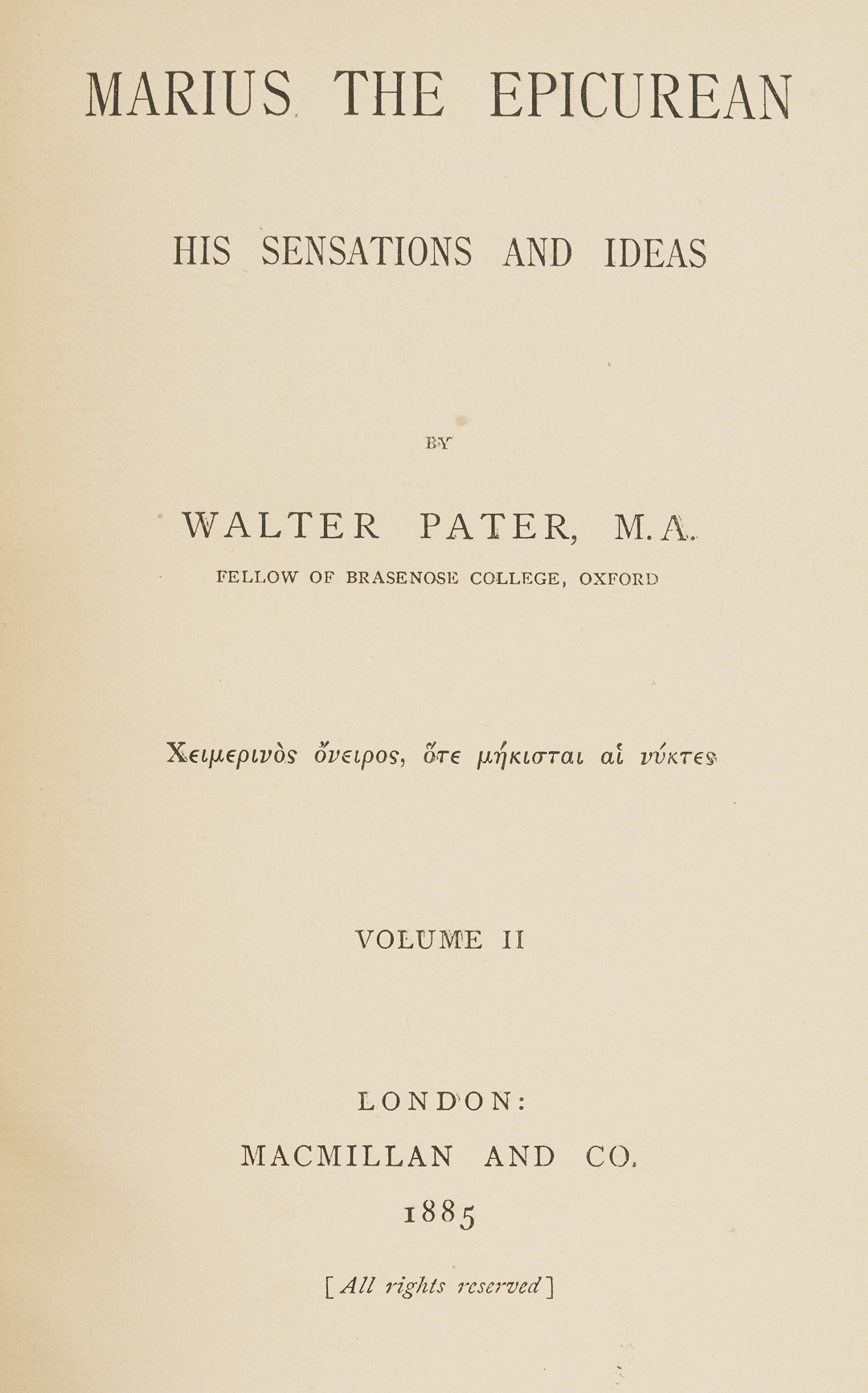 MARIUS THE EPICUREAN: HIS SENSATIONS AND IDEAS. London: Macmillan & Co., 1885. 2 volumes, 260 and 246pp. Pater’s most notable work, the book was immediately embraced by the British public, prompting a second edition being printed within months of the first.