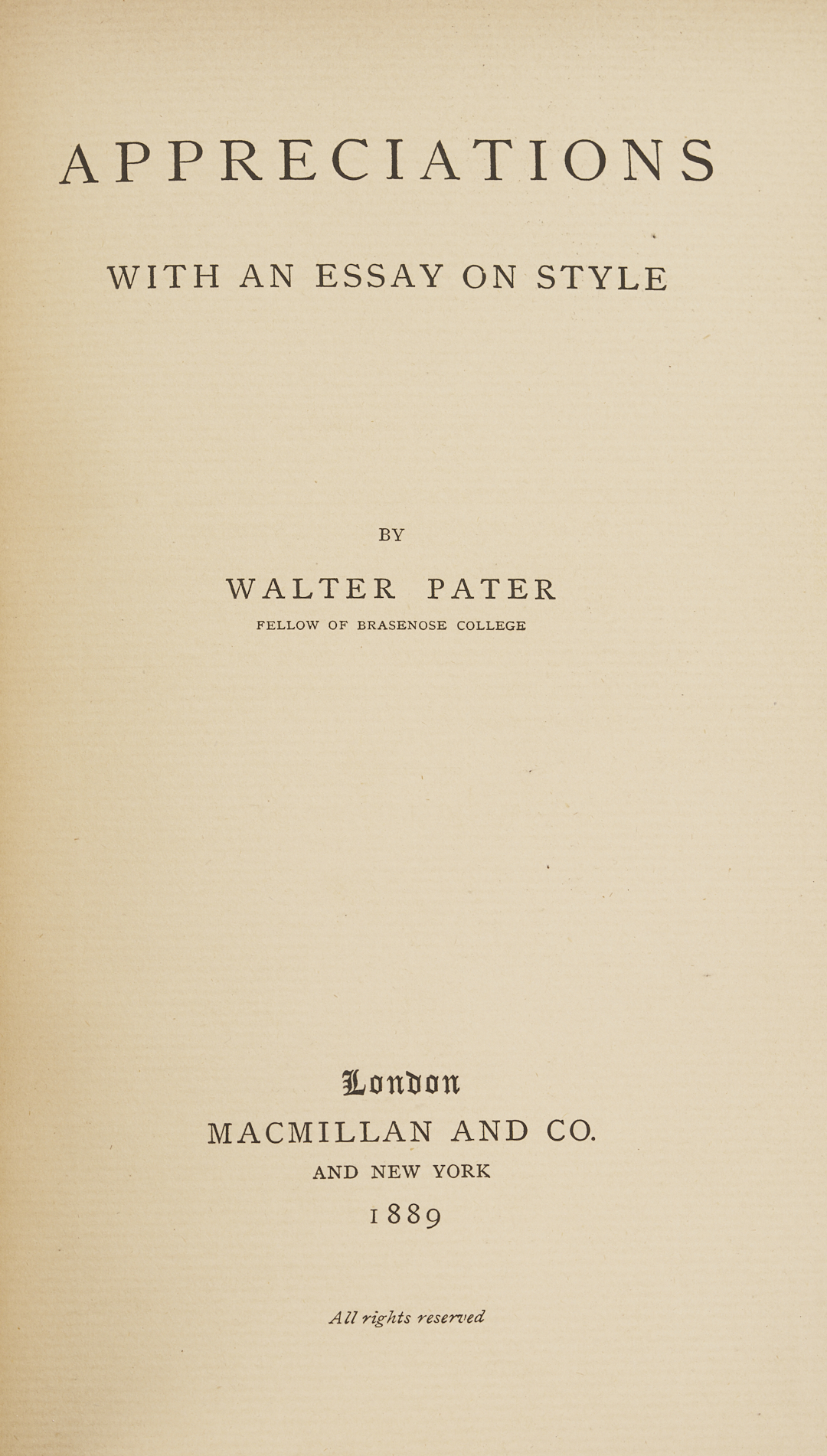 APPRECIATIONS WITH AN ESSAY ON STYLE. London: Macmillan & Co., 1889. 264pp. Ten essays on English writers and literature.