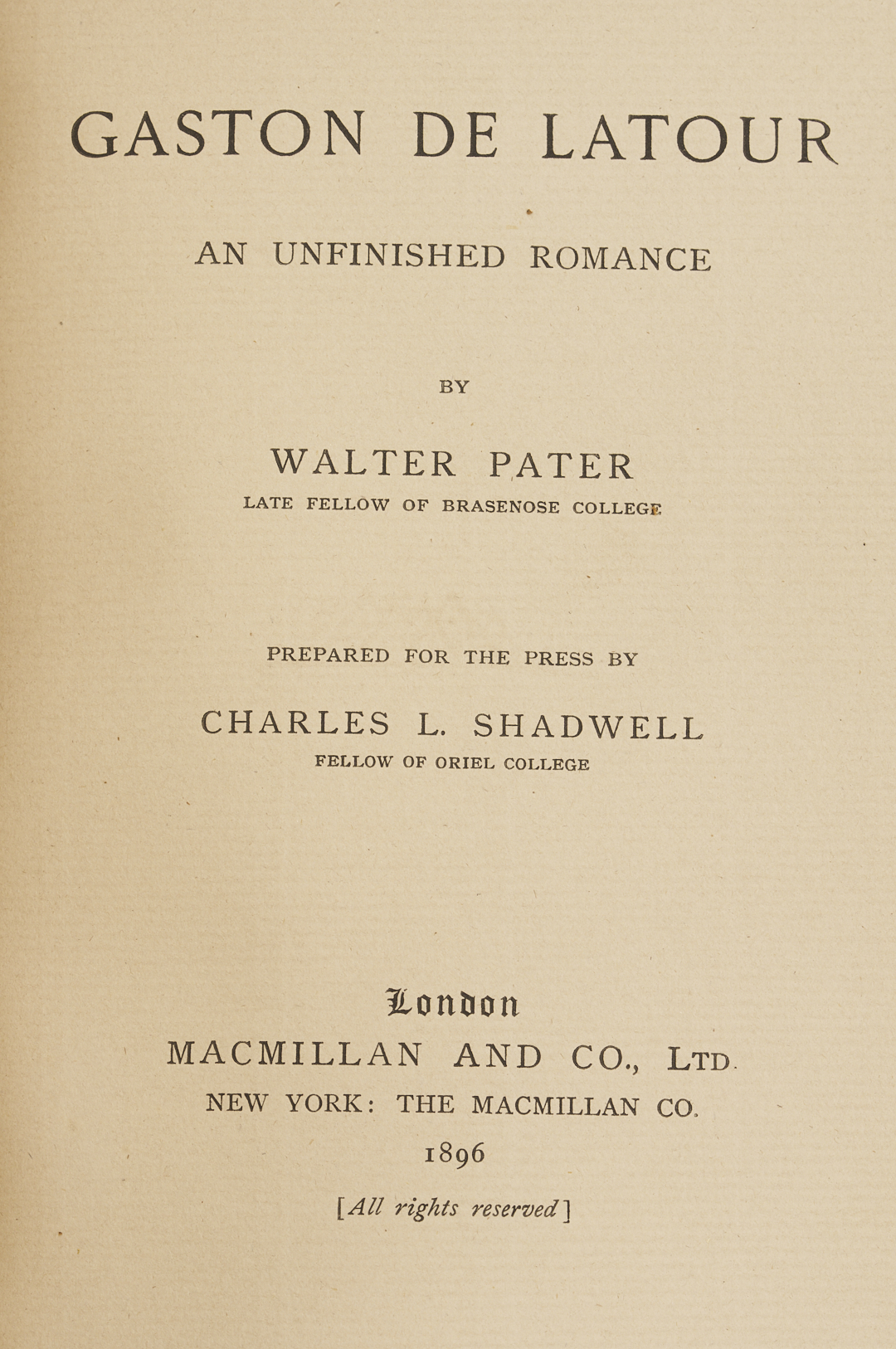 GASTON DE LATOUR AN UNFINISHED ROMANCE. London: Macmillan & Co., 1896. 200pp. Prepared for the press by Charles L. Shadwell.