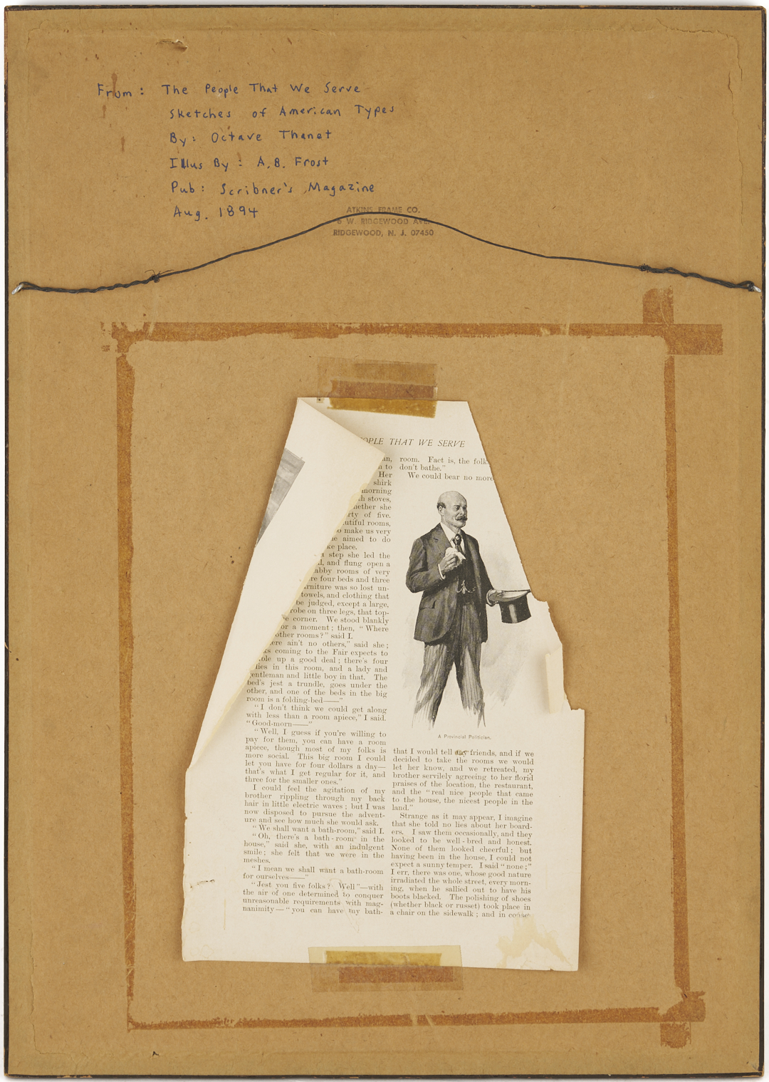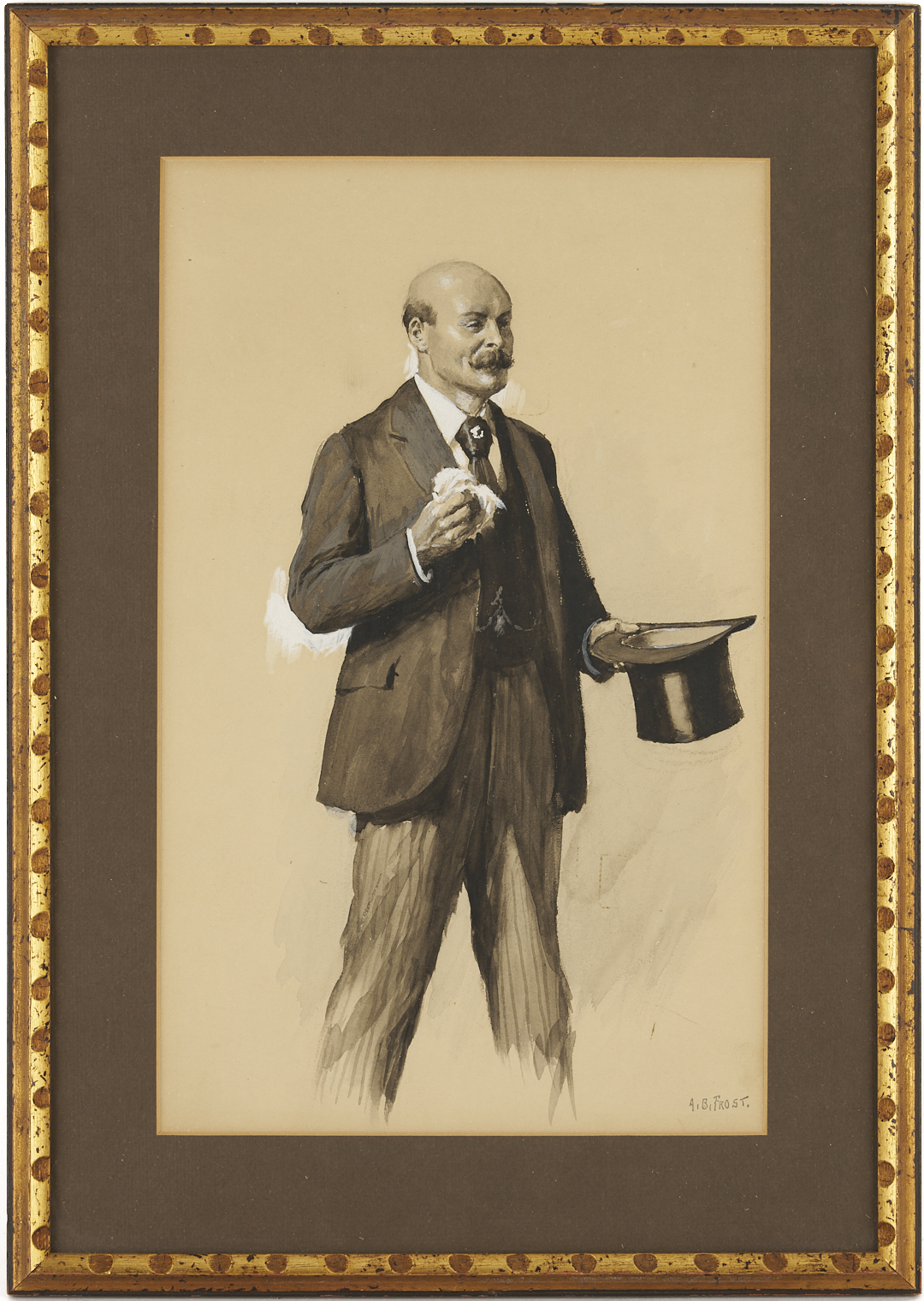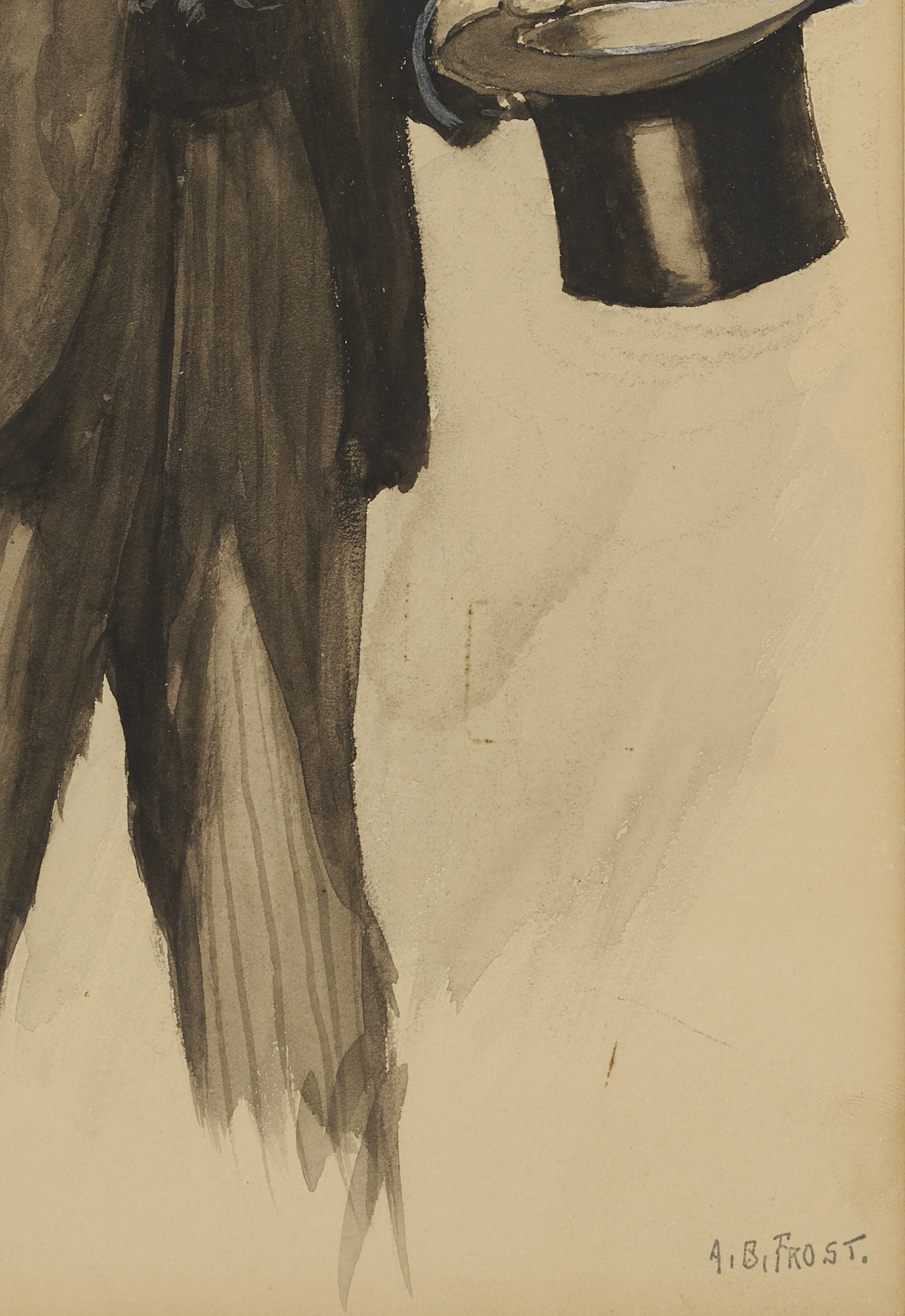 Arthur Burdett Frost (Pennsylvania/California, 1851-1928) watercolor and gouache on board illustration, “A Provincial Politician,” 1894. Published to accompany Octave Thanet’s article “The People That We Serve, Sketches of American Types,” Scribner’s Magazine XVI, no. 2, (Aug. 1894). A man with a mustache wears a suit and holds a tophat in his left hand. Signed in pencil, lower right. Loose magazine page with illustration taped to backing. Housed under glass in a painted and giltwood frame. Sight: 13 3/8 in. H x 8 3/8 in. W. Frame: 18 in. H x 12 3/4 in. W. Also includes the compilation book Scribner’s Magazine, Published Monthly With Illustrations, Volume XVI July – December (New York: Charles Scribner’s Sons, 1894), with article and printed illustration. 7 in. x 9 3/4 in. x 1 3/4 in.