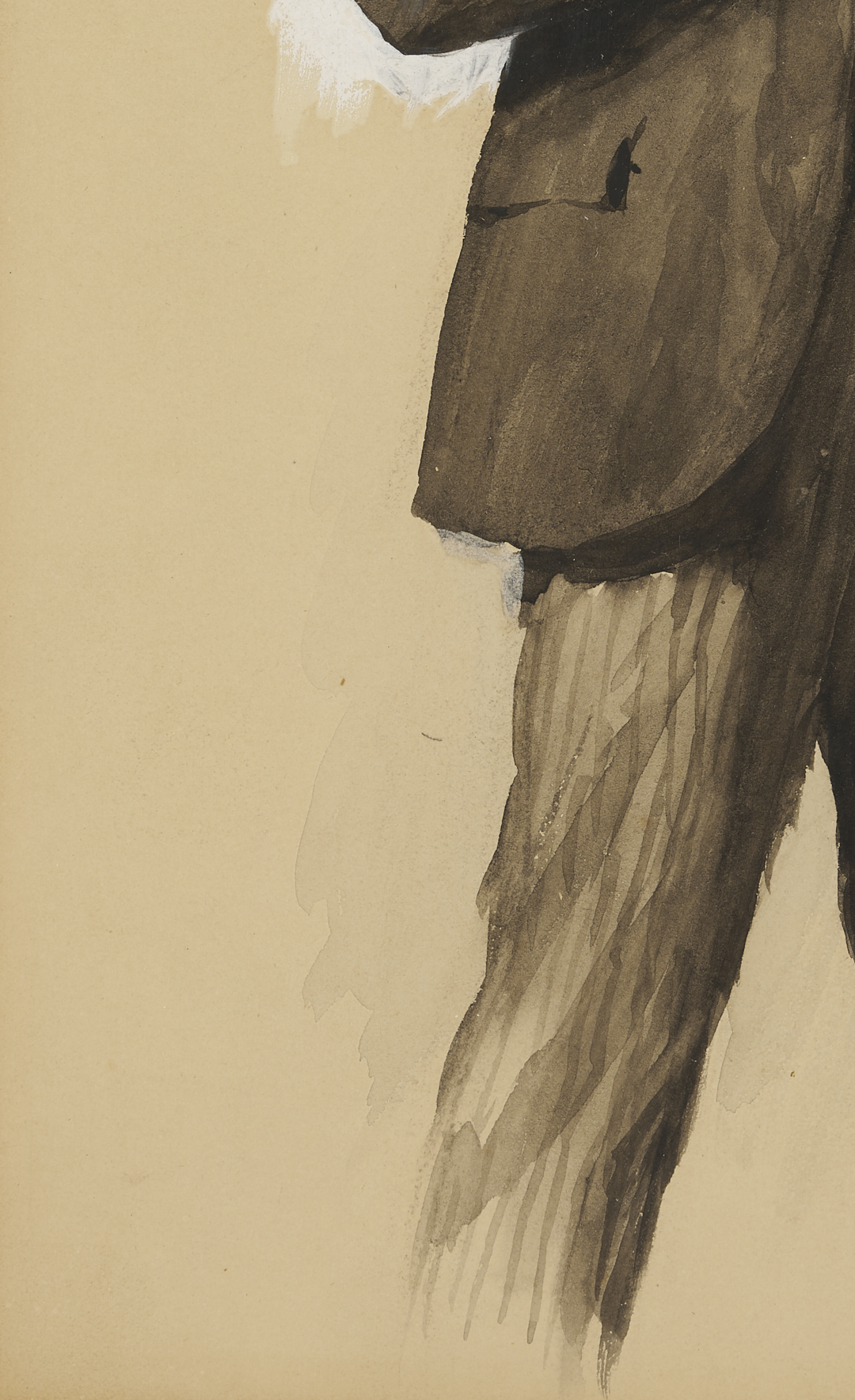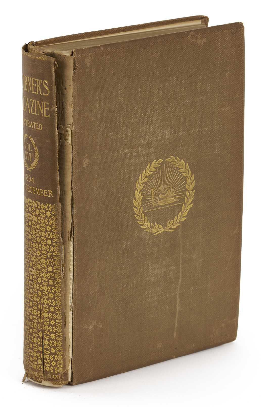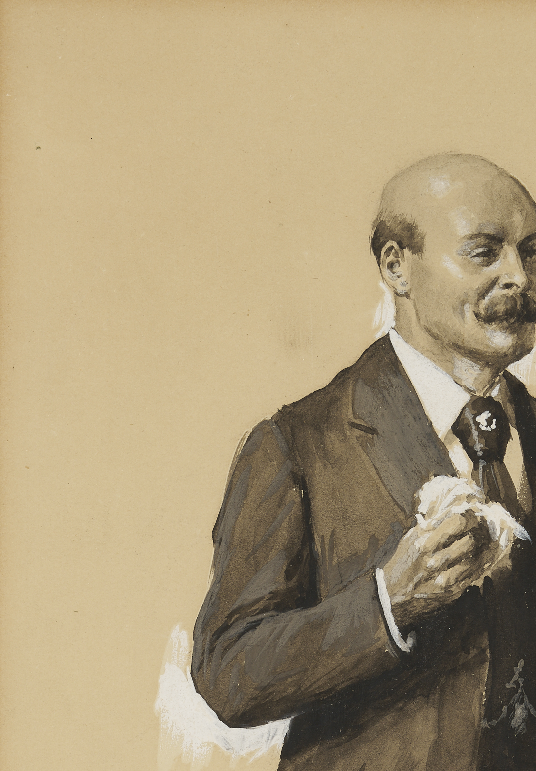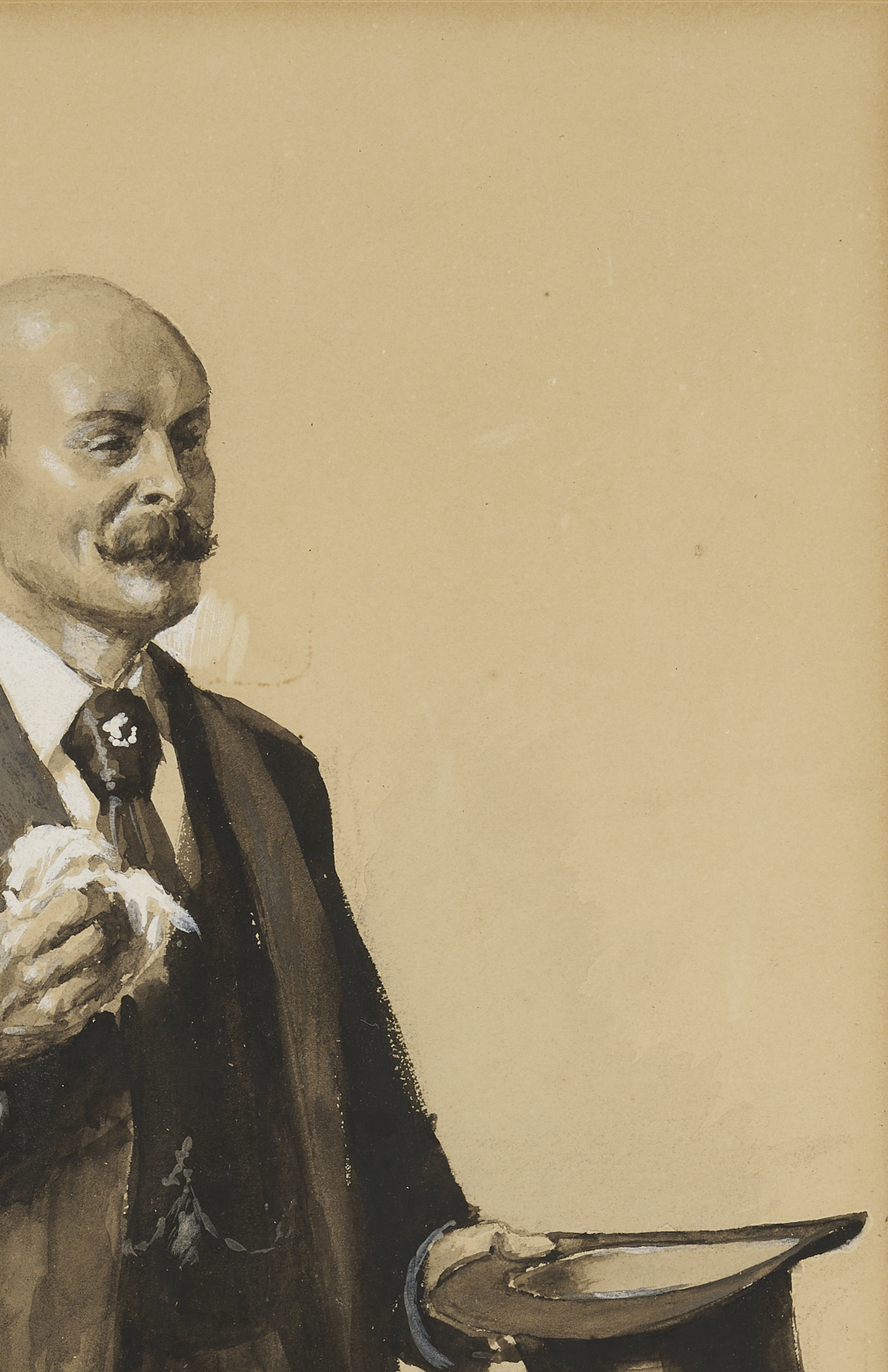 Arthur Burdett Frost (Pennsylvania/California, 1851-1928) watercolor and gouache on board illustration, “A Provincial Politician,” 1894. Published to accompany Octave Thanet’s article “The People That We Serve, Sketches of American Types,” Scribner’s Magazine XVI, no. 2, (Aug. 1894). A man with a mustache wears a suit and holds a tophat in his left hand. Signed in pencil, lower right. Loose magazine page with illustration taped to backing. Housed under glass in a painted and giltwood frame. Sight: 13 3/8 in. H x 8 3/8 in. W. Frame: 18 in. H x 12 3/4 in. W. Also includes the compilation book Scribner’s Magazine, Published Monthly With Illustrations, Volume XVI July – December (New York: Charles Scribner’s Sons, 1894), with article and printed illustration. 7 in. x 9 3/4 in. x 1 3/4 in.