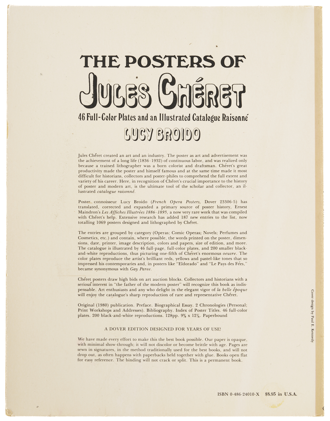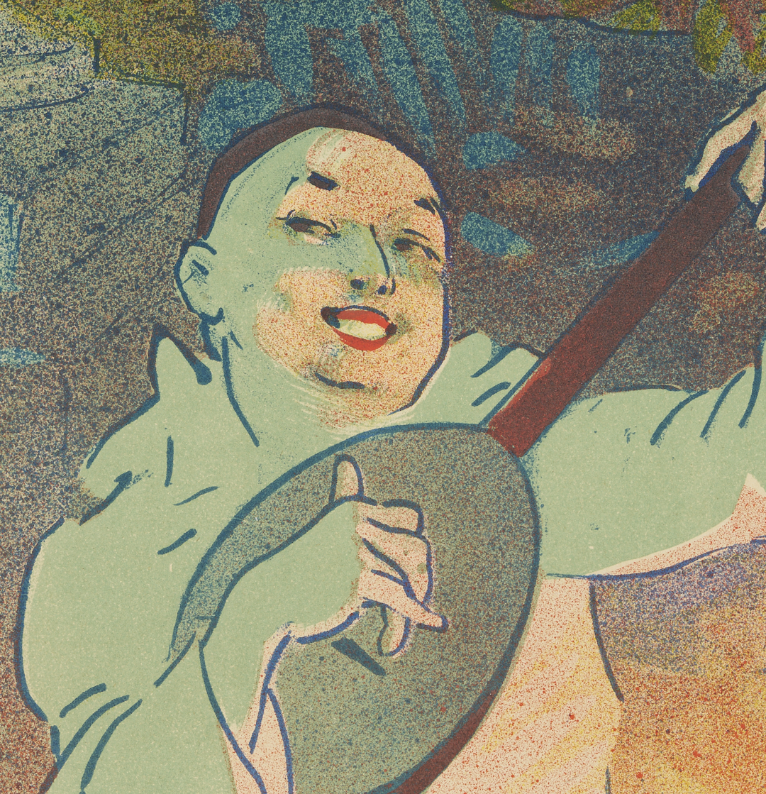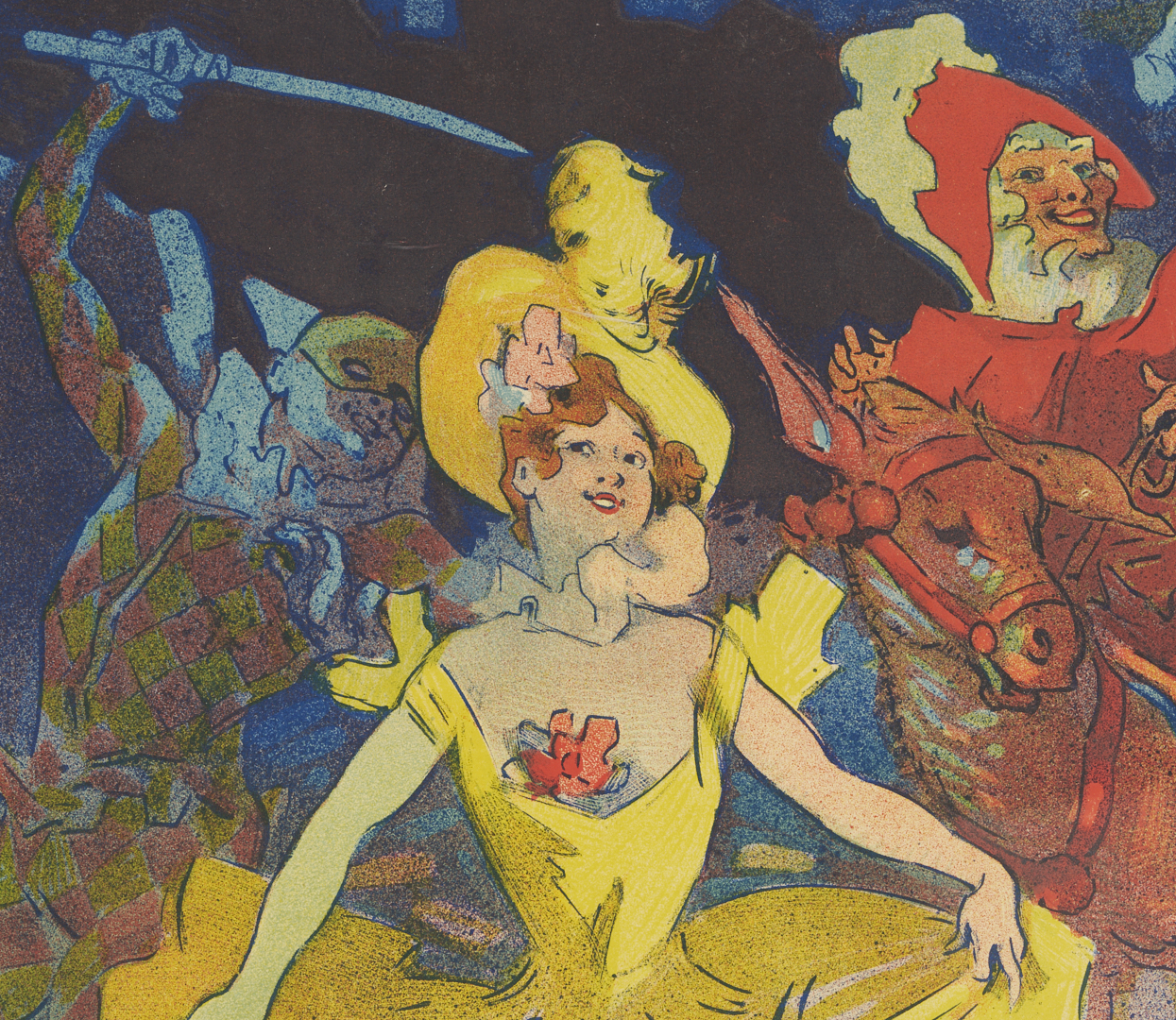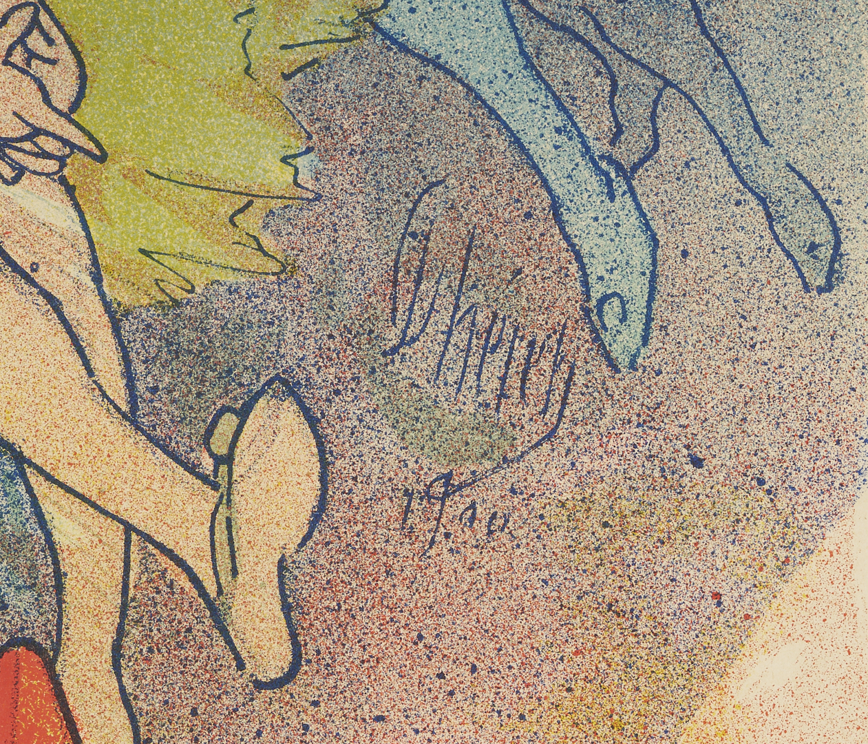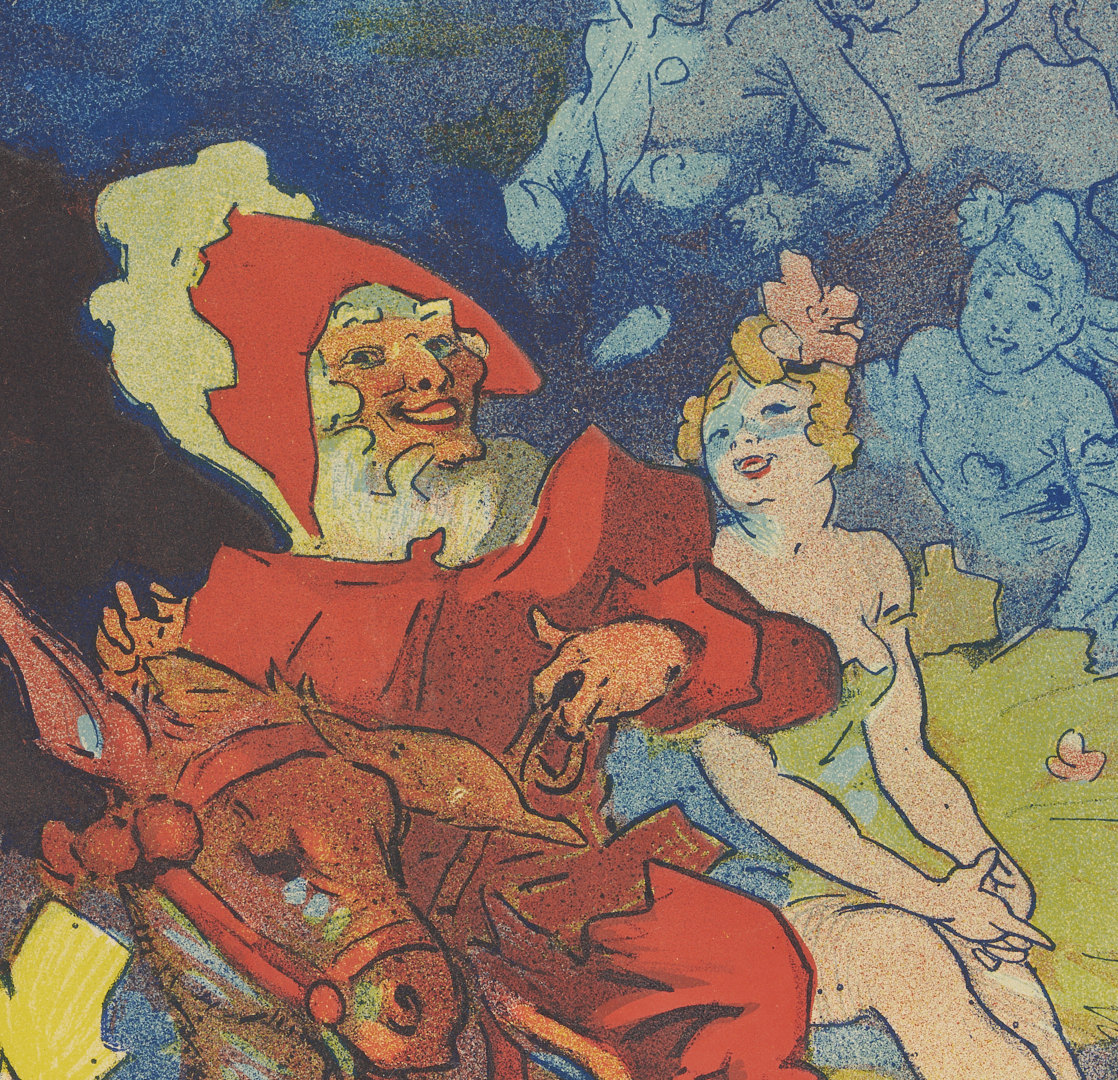 Jules Cheret (France, 1836-1932) lithograph advertisement poster, “Musee Grevin / Theatre Les Fantoches de John Hewelt,” 1900. Created to advertise John Hewelt’s marionette show at the theater of the Musee Grevin. A proof impression before text. Signed and dated in the stone, center right. Printed by Imprimerie Chaix (Ateliers Cheret), Paris. Ref.: Broido 471. Unframed. Laid to canvas, rolled, and housed in a shipping tube. Lot also includes Lucy Broido’s Cheret catalog raisonne THE POSTERS OF JULES CHERET (New York: Dover, 1980). Sheet: 49 in. H x 35 in. W. Canvas : 51 1/4 in. H x 37 1/2 in. W. Tube: 40 1/2 in. L x 5 in. Dia. Book: 12 3/16 in. x 9 3/8 in. x 1/4 in. Note: This version is before lettering and may be especially early as most include publication information printed in margin at lower left.
