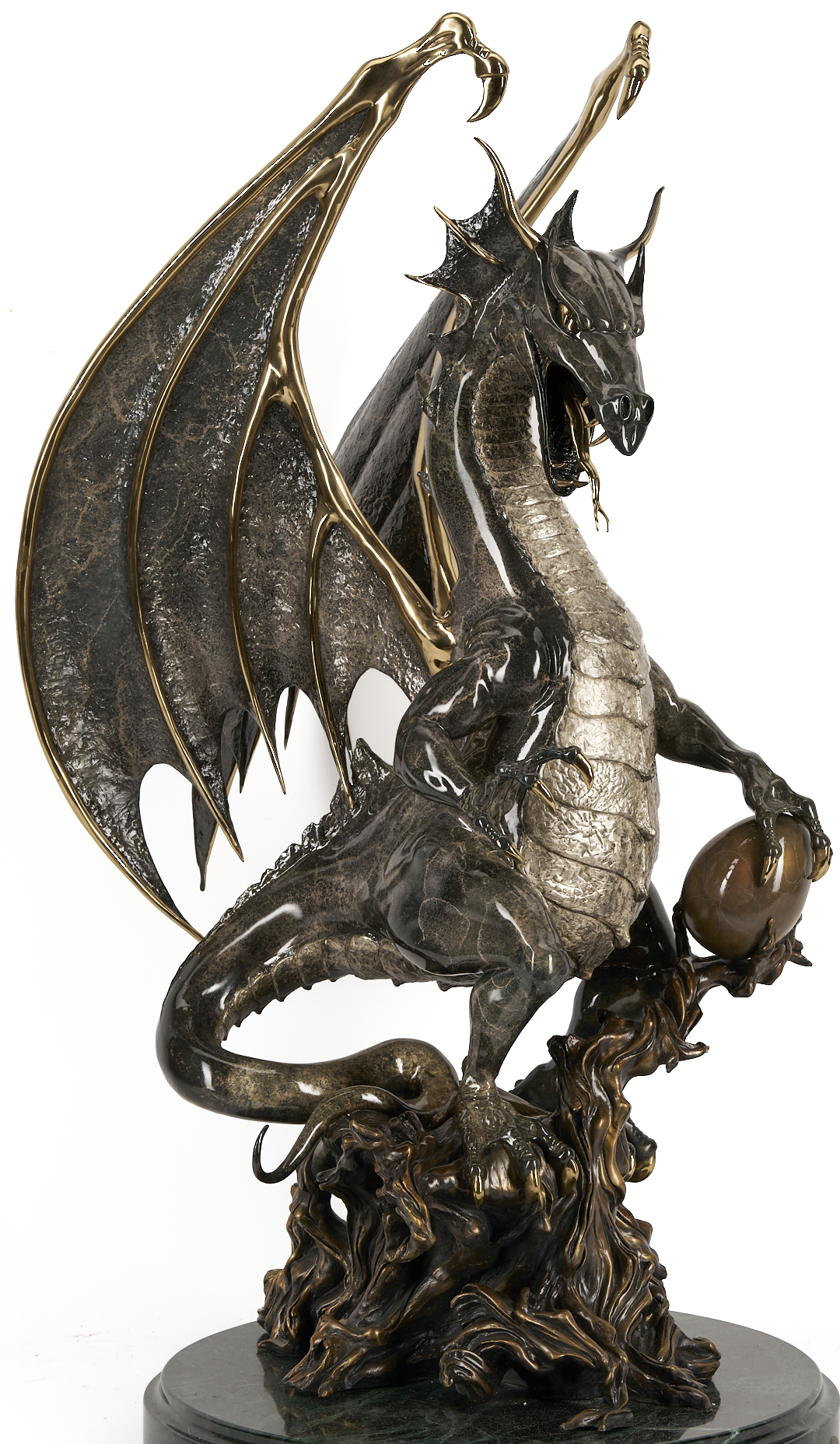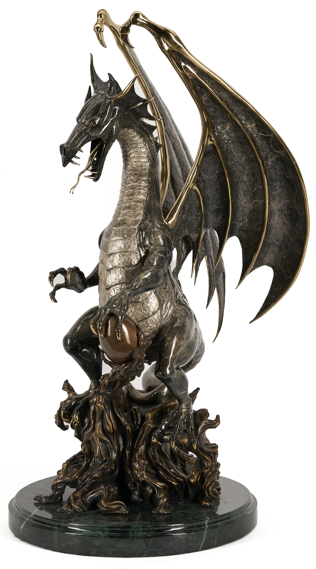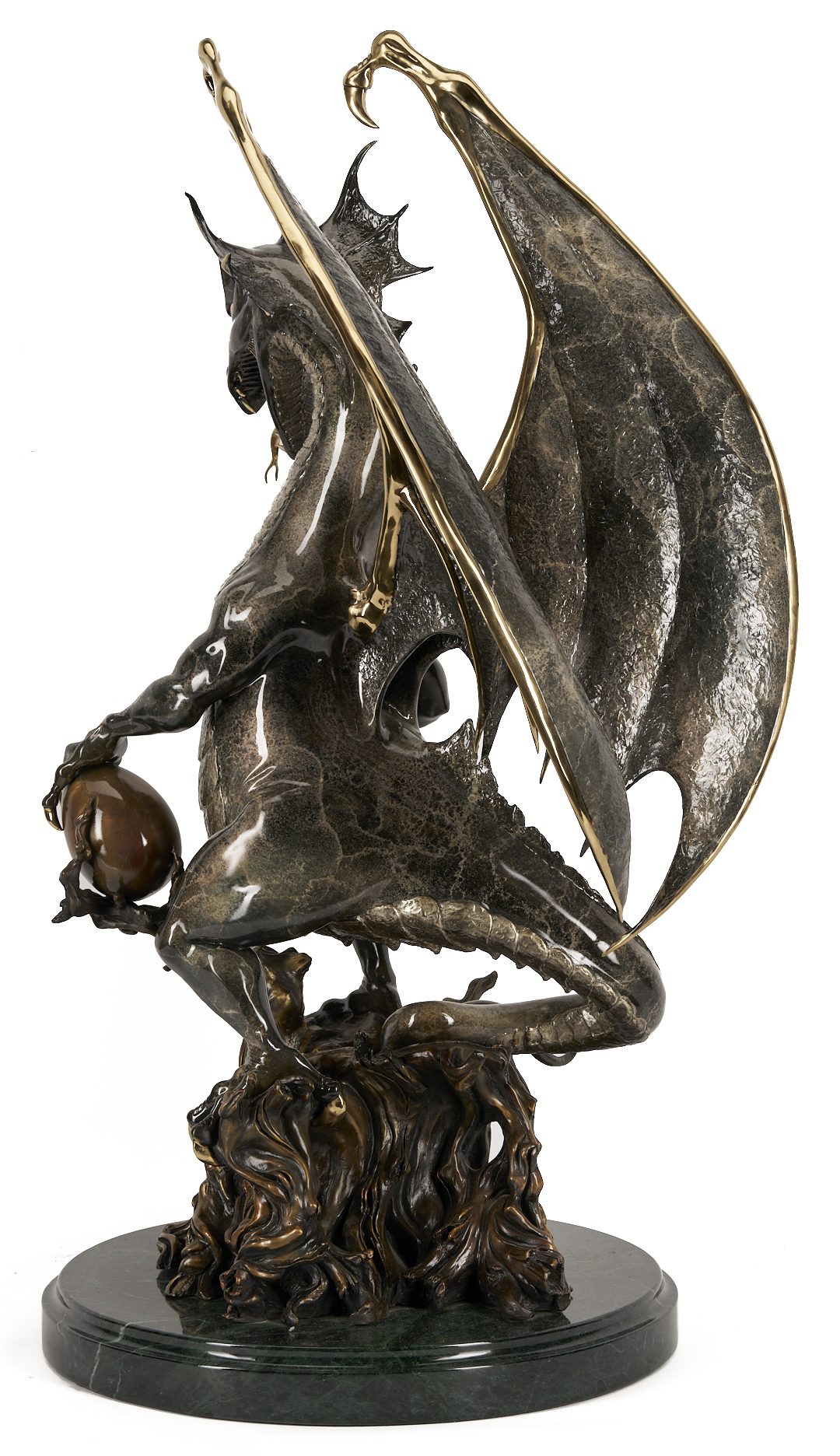 Bill Toma (American/California, 20th Century) limited edition patinated bronze sculpture titled “Guardian” that depicts a winged dragon protecting a golden egg atop a perch, mounted on a round green variegated marble base. Doubly-inscribed “Toma,” titled “Guardian,” numbered 16/30, and dated “88” on the base. 34 1/2 in. H (bronze only) x 18 in. W x 21 1/2 in. D. 36 1/2 in. total H. 1988.