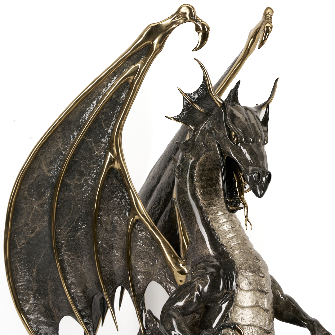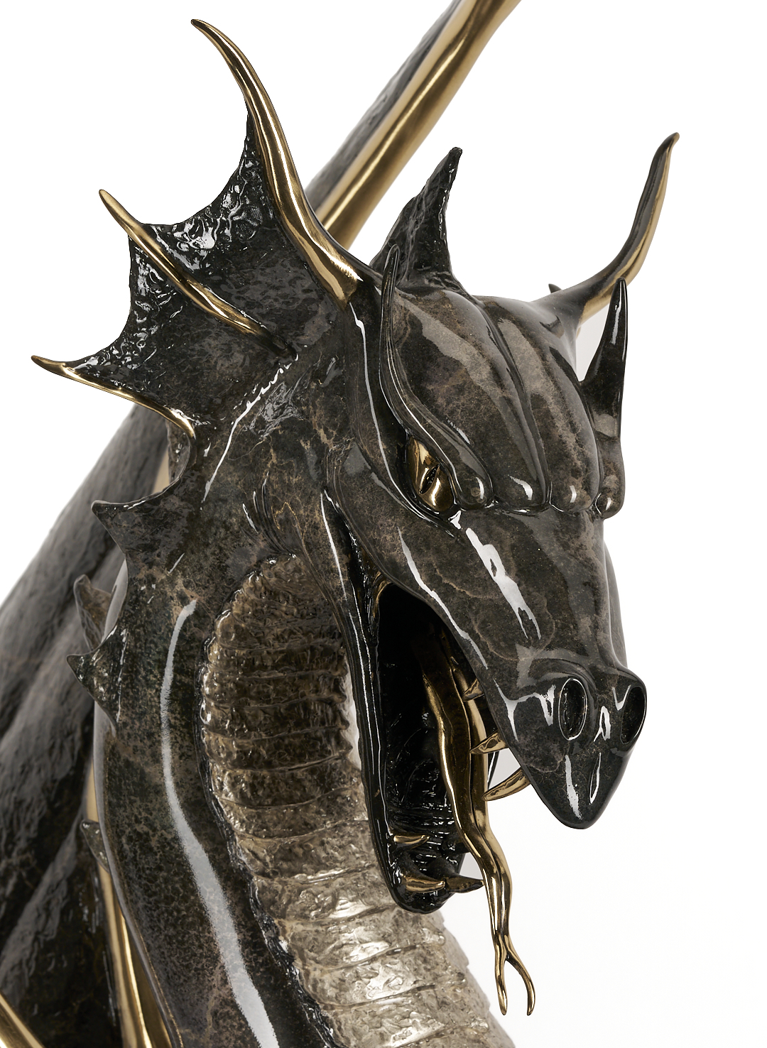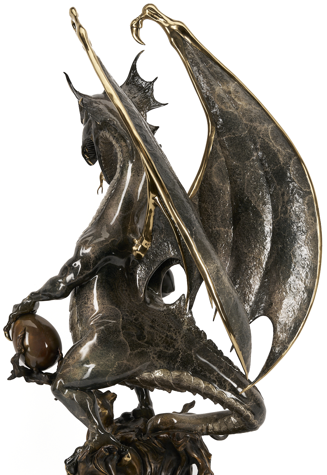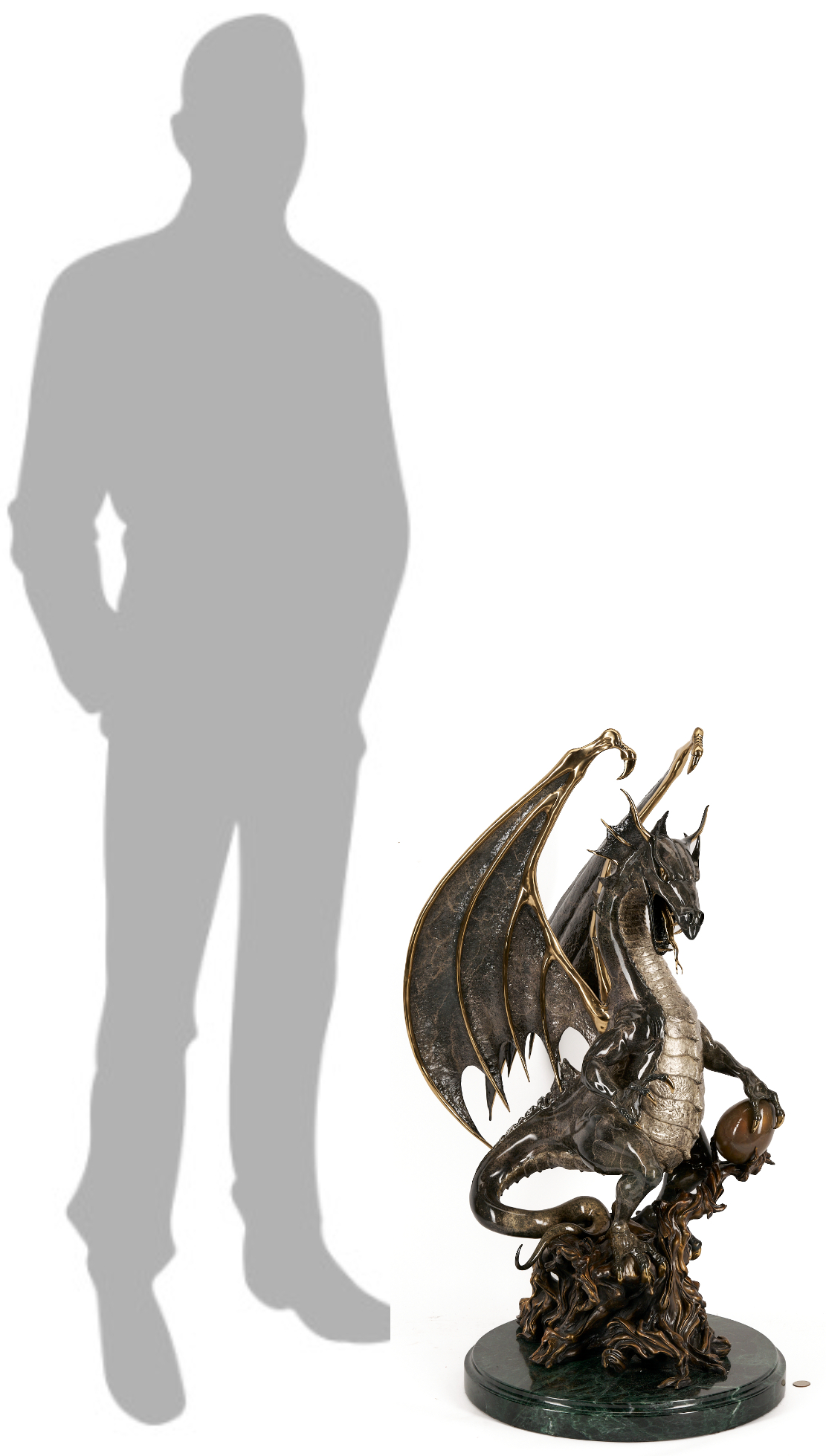 Bill Toma (American/California, 20th Century) limited edition patinated bronze sculpture titled “Guardian” that depicts a winged dragon protecting a golden egg atop a perch, mounted on a round green variegated marble base. Doubly-inscribed “Toma,” titled “Guardian,” numbered 16/30, and dated “88” on the base. 34 1/2 in. H (bronze only) x 18 in. W x 21 1/2 in. D. 36 1/2 in. total H. 1988.