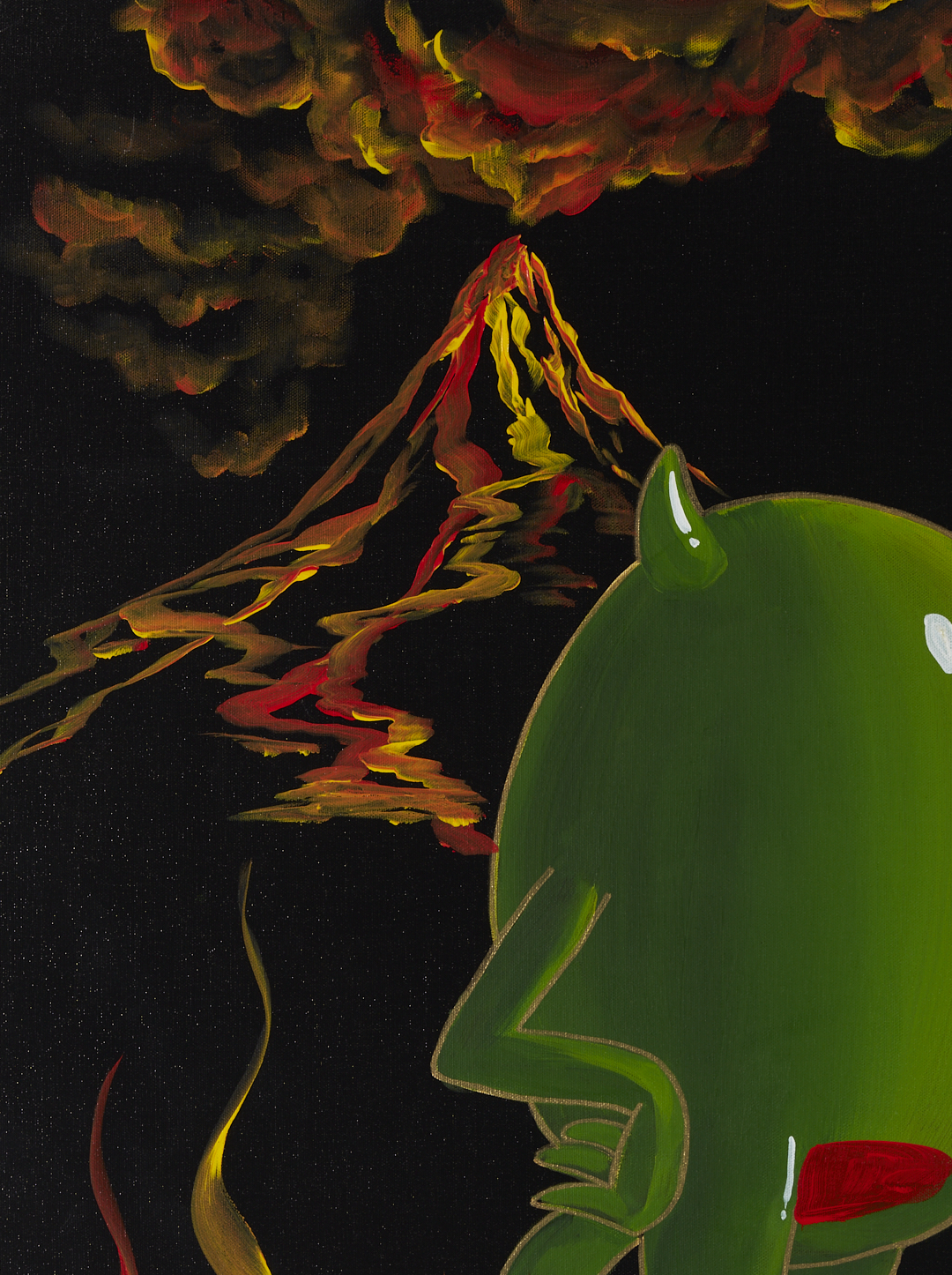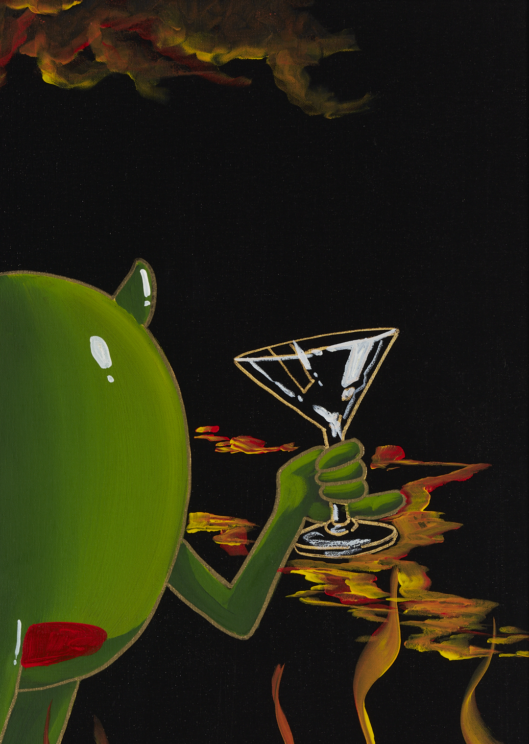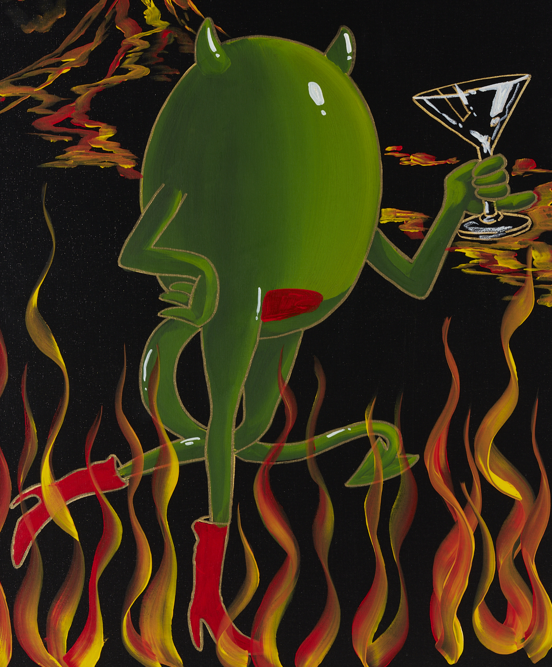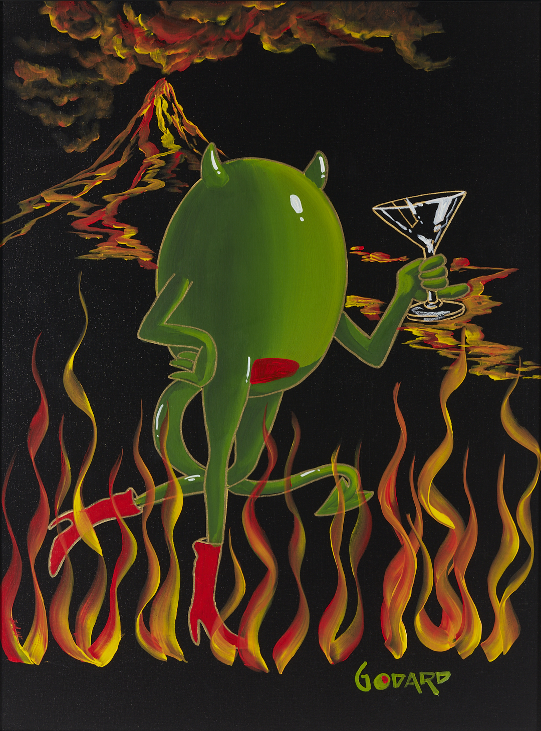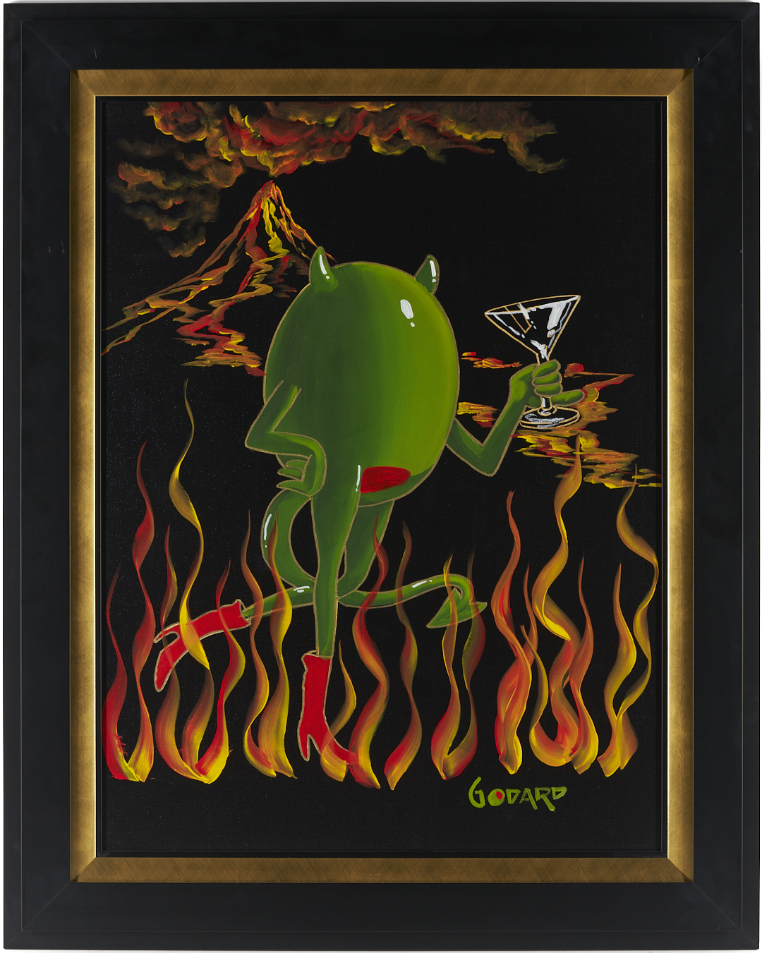 Michael Godard (American, b.1958) acrylic on canvas painting depicting an olive depicted as a devil with horns, holding a martini glass and surrounded by fire, with an erupting volcano in the fire, set against a rich black ground. Signed lower right and housed in a black and gilt wood frame. Sight: 39 5/8 in. H x 29 3/8 in. W. Framed: 50 in. H x 39 7/8 in. W.