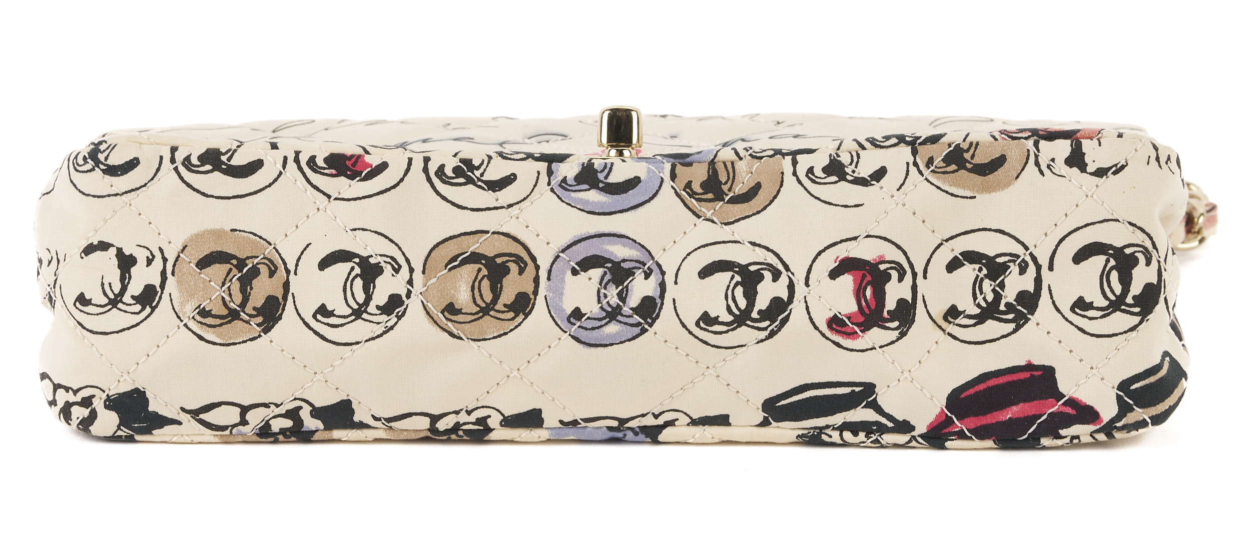 Chanel nylon quilted Rue Cambon Camellia printed mini flap bag, cream ground with multicolor print. fabric, threaded gold chainlink strap, a gold CC turn lock on the front, and a matching printed interior with zip and elastic pocket. Retains the Chanel authentication card, interior tag, and the original sales receipt. Additionally retains the dust bag.