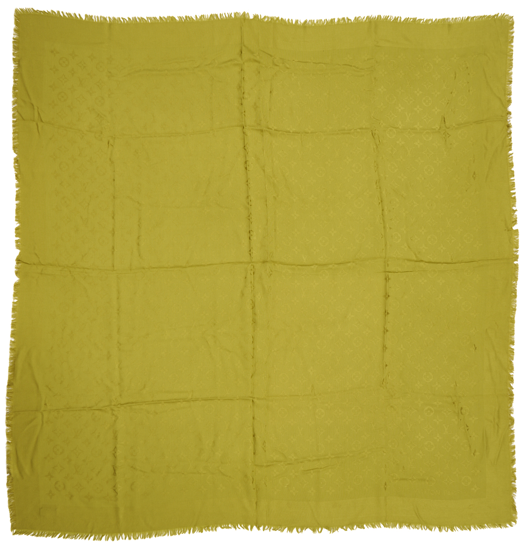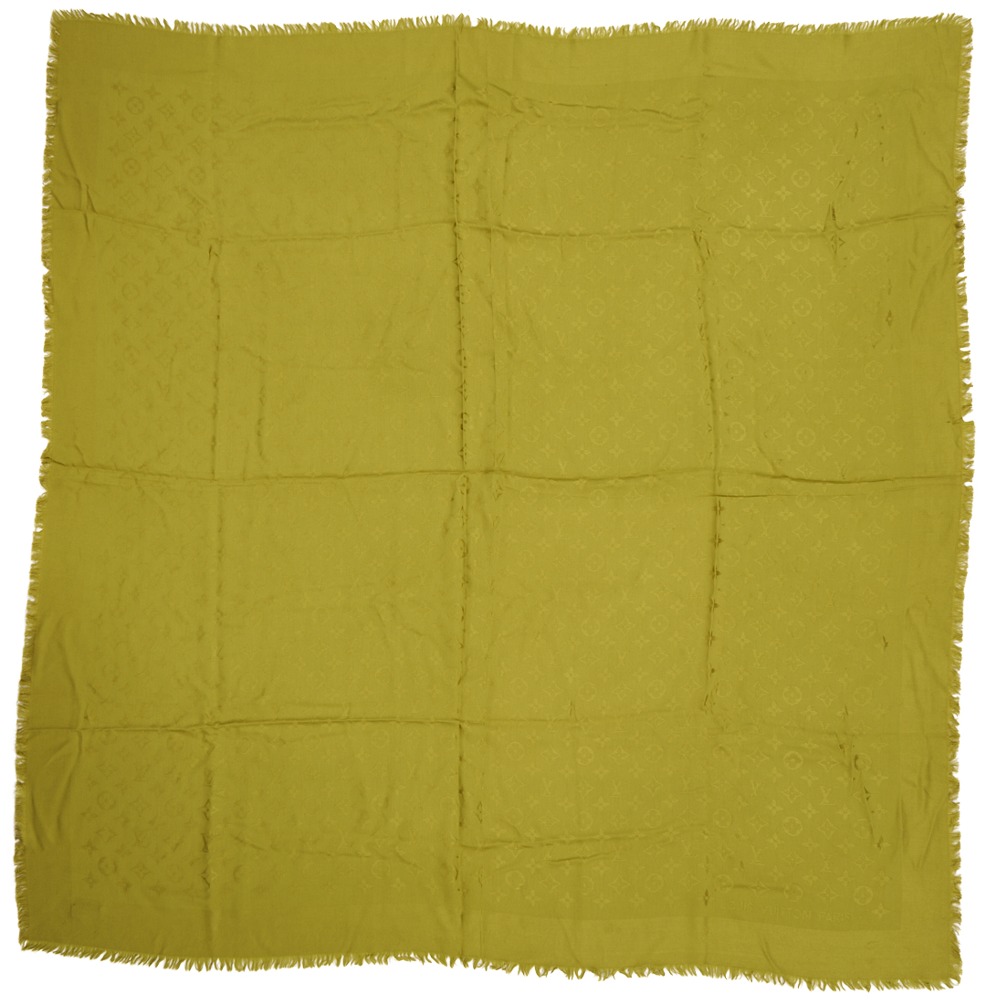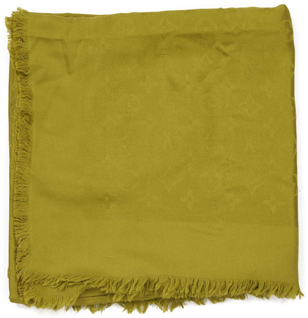 1st item: Orange and Beige Hermes Cashmere Stole. Reversible design patterned with the Hermès logo, featuring the signature horse and carriage motif to the lower edge. Finished with fringed ends. 72 in. L x 25 in. W. 2nd item: Green monochromatic silk and wool logo Louis Vuitton shawl, patterned throughout with the Louis Vuitton logo, bordered approximately 3 in. wide, and finished with fringed edges. 66 in. L x 34 in. W. 3rd item: Silver monochromatic Louis Vuitton silk and wool logo shawl, patterned throughout with the Louis Vuitton logo, bordered approximately 3 in. wide, and finished with fringed edges. 66 in. L x 34 in. W. Two boxes associated with the designer.