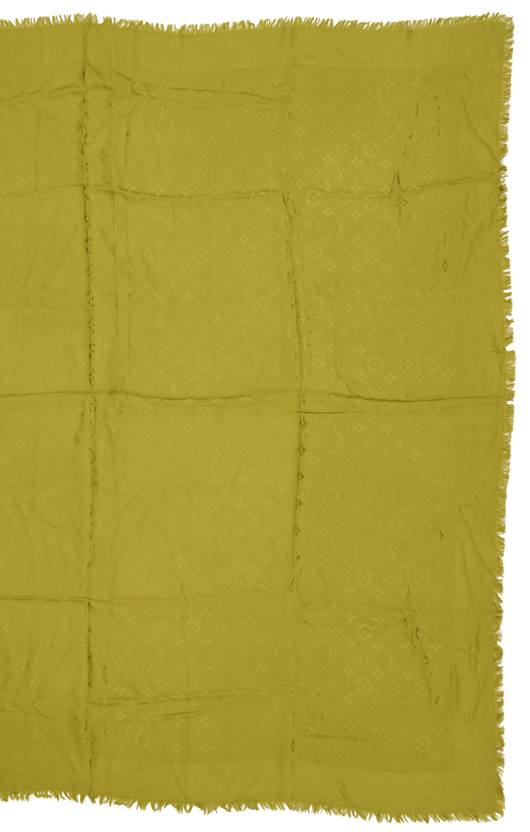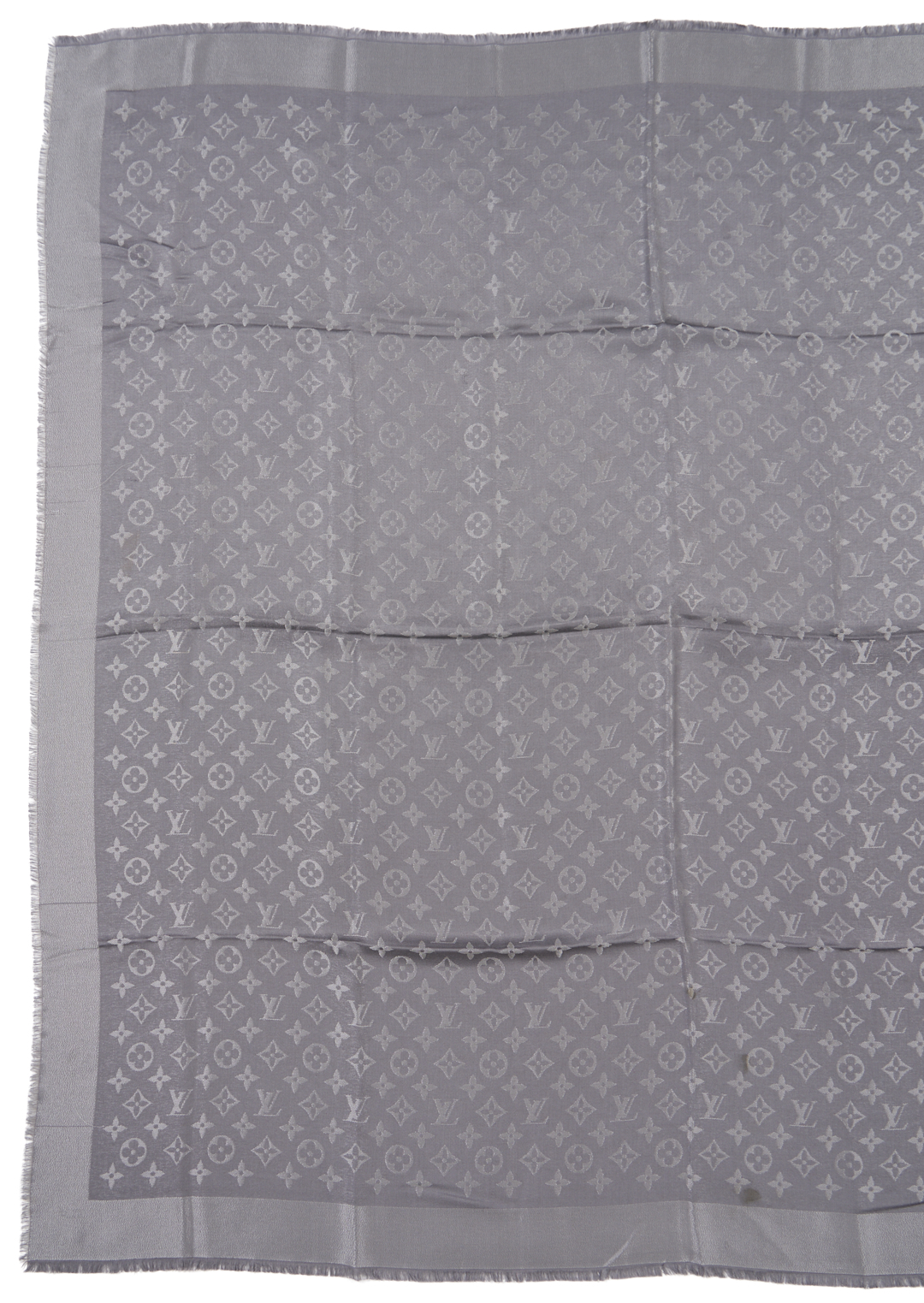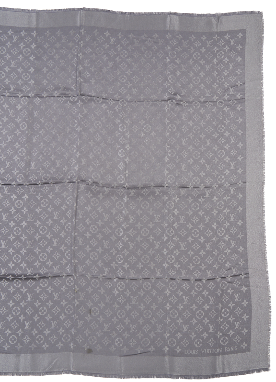 CONDITION: Hermes has a black mark near the carriage approx 1/4 in.; dry cleaning is recommended. Light fraying is visible along the ends. Louis Vuitton shawls are in very good condition.