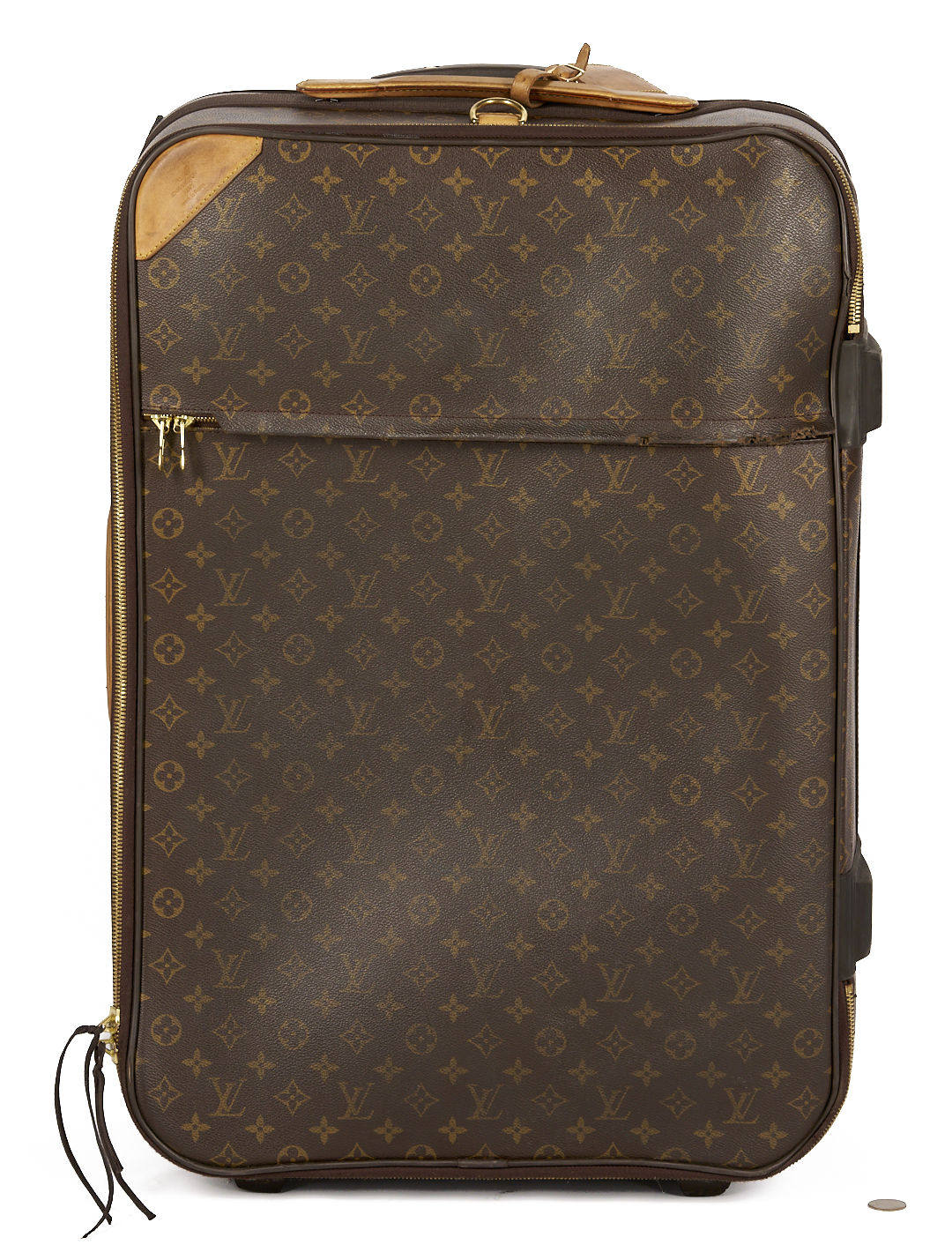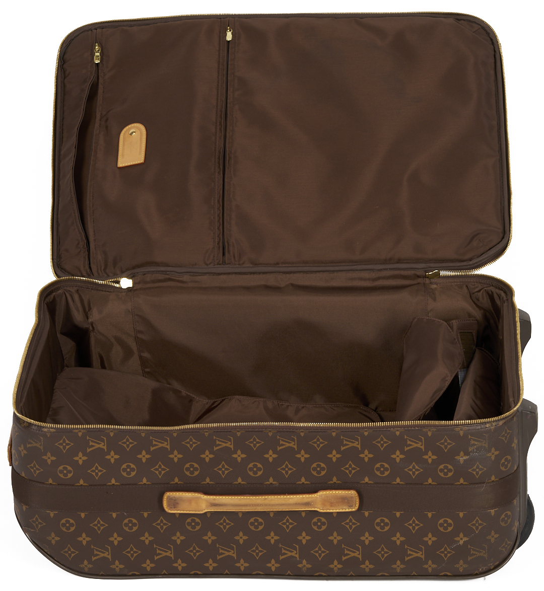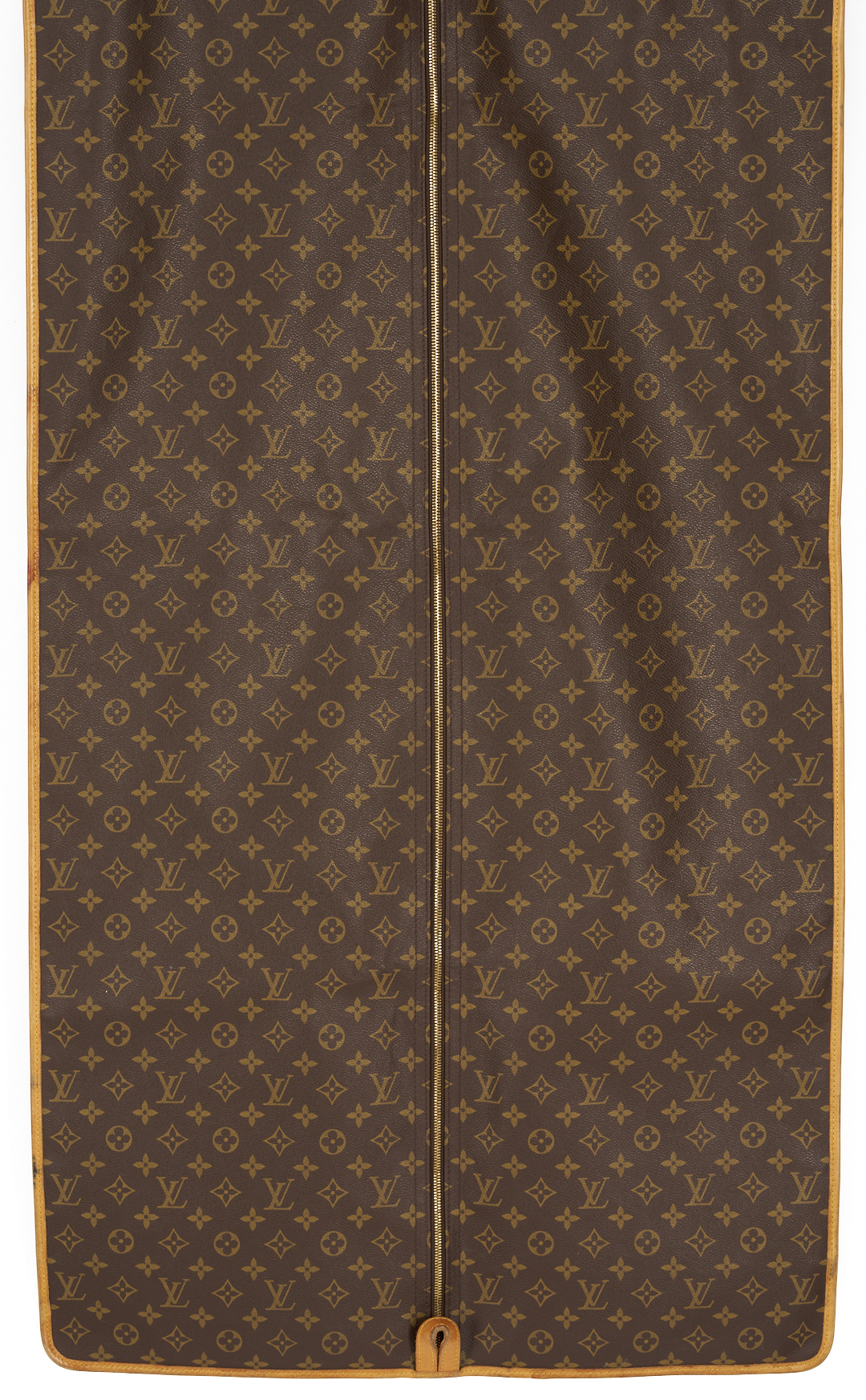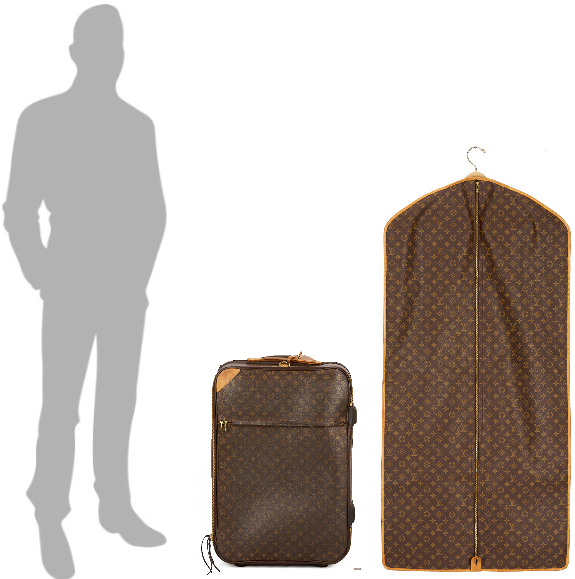 1st item: Vintage Louis Vuitton Pegase 70 roller suitcase, monogram pattern coated canvas with leather trim, retractable handle, zippered closure, and rolling wheels. Retains the original LV tags. 26 in. L x 18 1/2 in. W x 9 in. D. 2nd item: Vintage Louis Vuitton garment bag, monogram pattern coated canvas with leather trim. 49 1/2 in. H x 24 in. W.