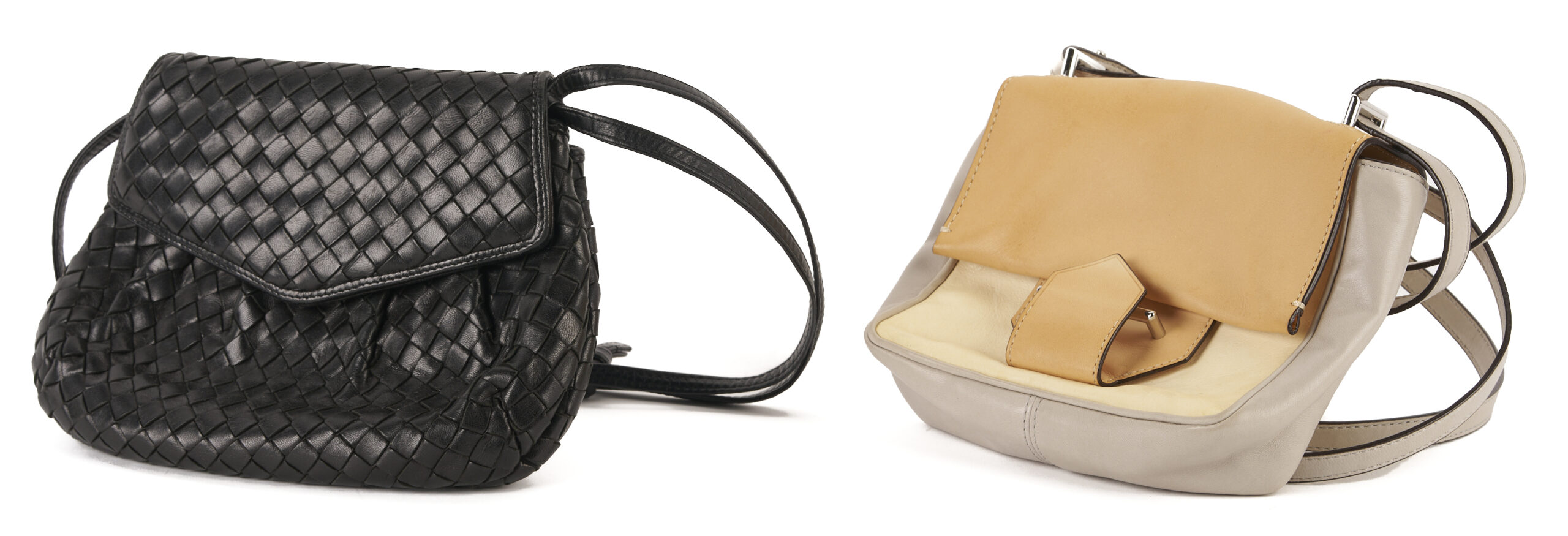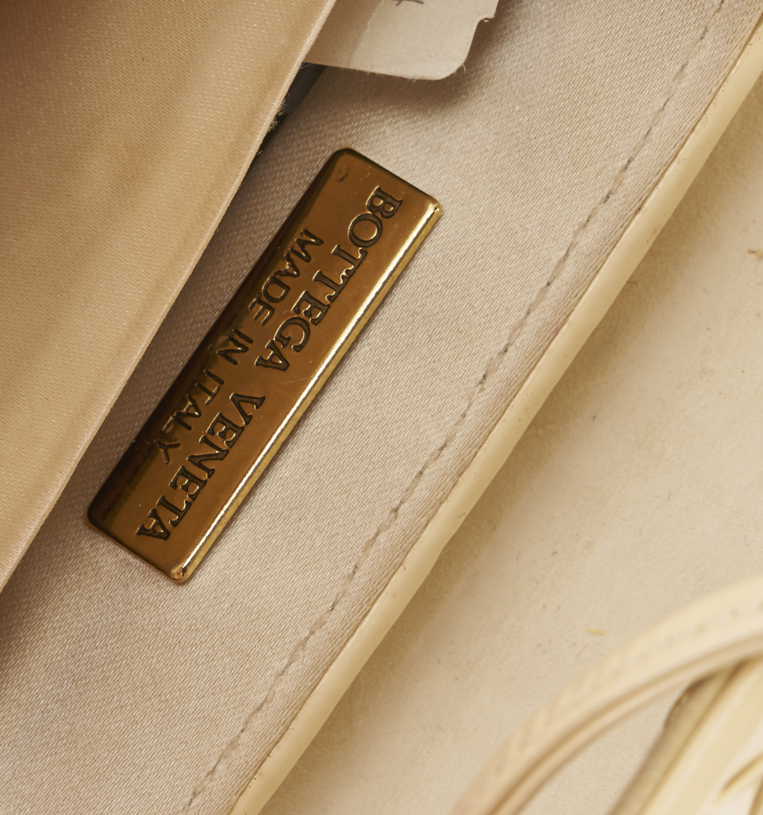 Four (4) Bottega Veneta Intrecciato Napa leather items, including a lime green Regent tote, a black purse with an adjustable strap and flap closure, a cream crossbody bag, and a small navy and green cross-body purse, all with Bottega Veneta metal tags or embossed logo, three with the original dust covers. Together with a black intrecciato leather tote, unmarked but in the style of Bottega Veneta, and a leather colorblock cross-body bag by Reed Krakoff with the original dust bag. Ranging in size from 4 1/4 in. H x 6 in. W to 13 in. H x 14 1/2 in. W.