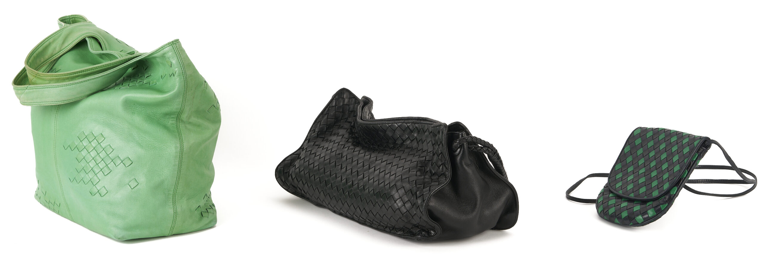 CONDITION: Lime green Regent tote with moderate use wear and minor staining, most noticeable on the handles and base. Remaining Bottega Veneta bags in good condition with light wear. Black unmarked bag with moderate wear and Reed Krakoff bag with moderate wear.