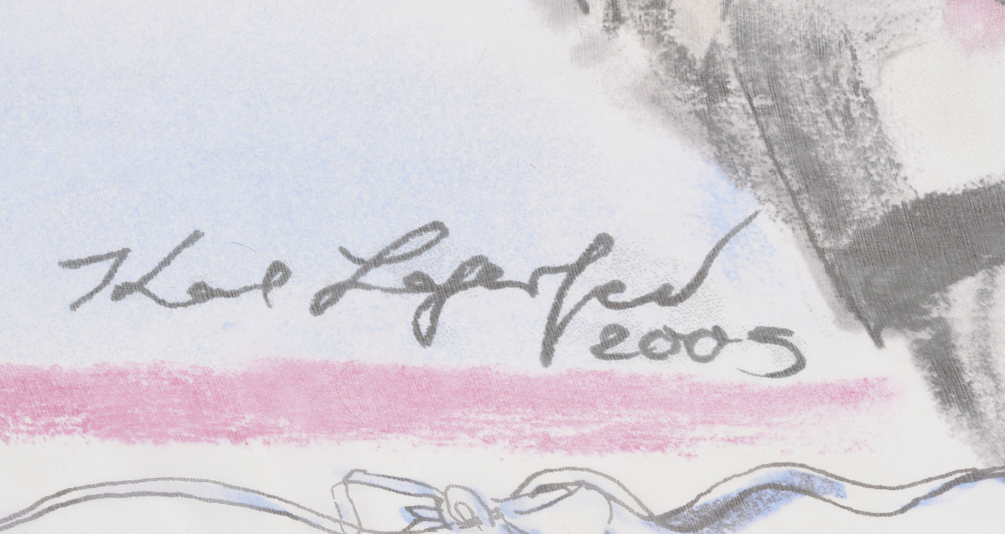 Two (2) Chanel silk scarves, including one (1) in a colorful graphic style depicting the Eiffel Tower, lucky clover, bow, and number “5” on a pale pink ground with a blue border featuring the repeating Chanel logo. Accompanied by the original box and purchase receipt. 35 in. L x 34 in. W. One (1) Chanel scarf depicting Coco Chanel in a hat, with a blue bow border, signed Karl Lagerfeld 2005 in the lower left corner, labeled Chanel in the corners. 33 in. L x 33 in. W.