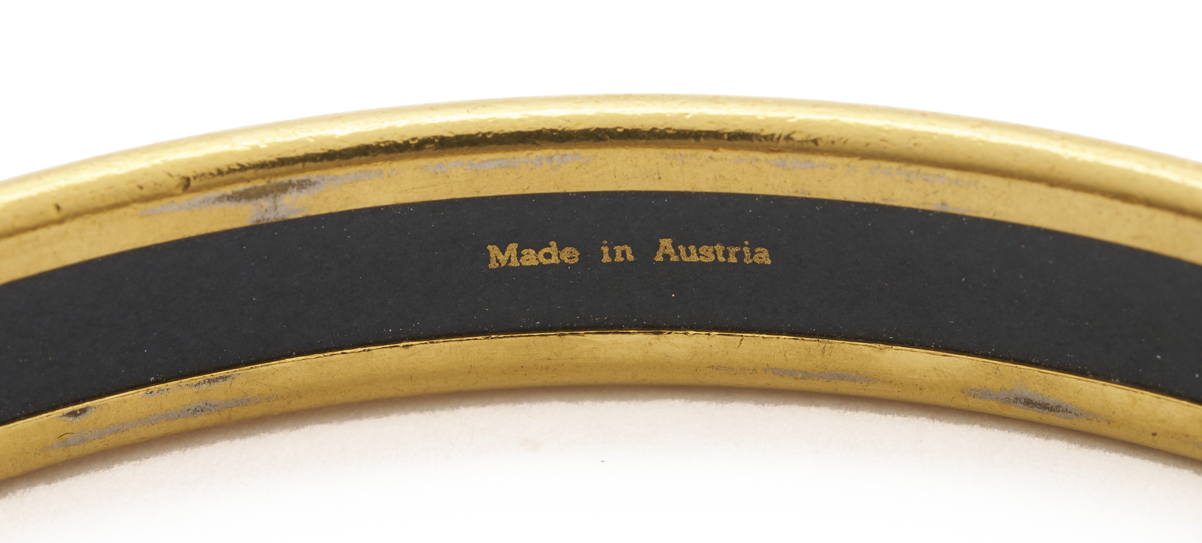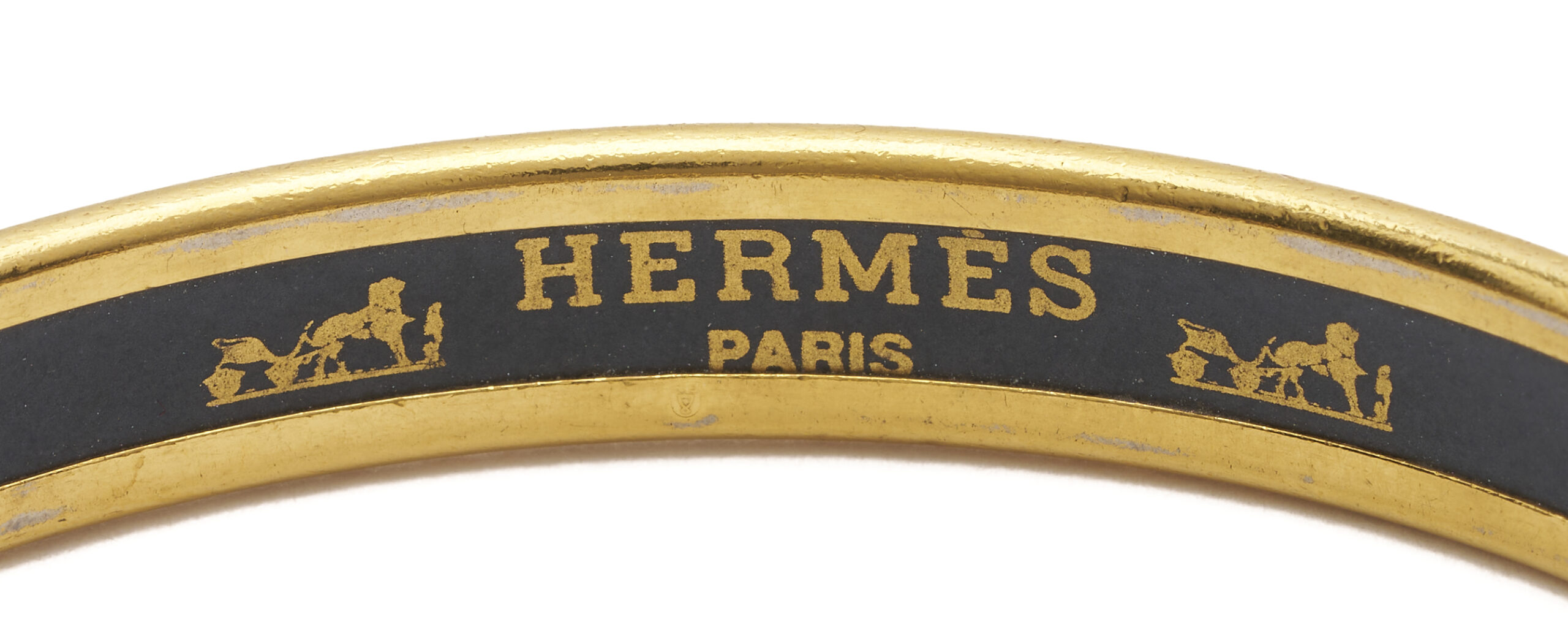 Two Hermes thin enameled bangle bracelets, including one blue belt buckle motif marked “Hermes Paris, Made in France” and one multicolor bracelet marked “Hermes Paris, Made in Austria”. 2 5/8 in. circumference and 2 3/8 in. circumference.