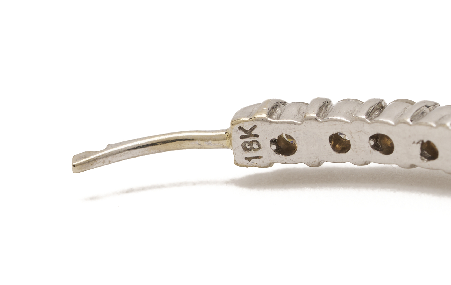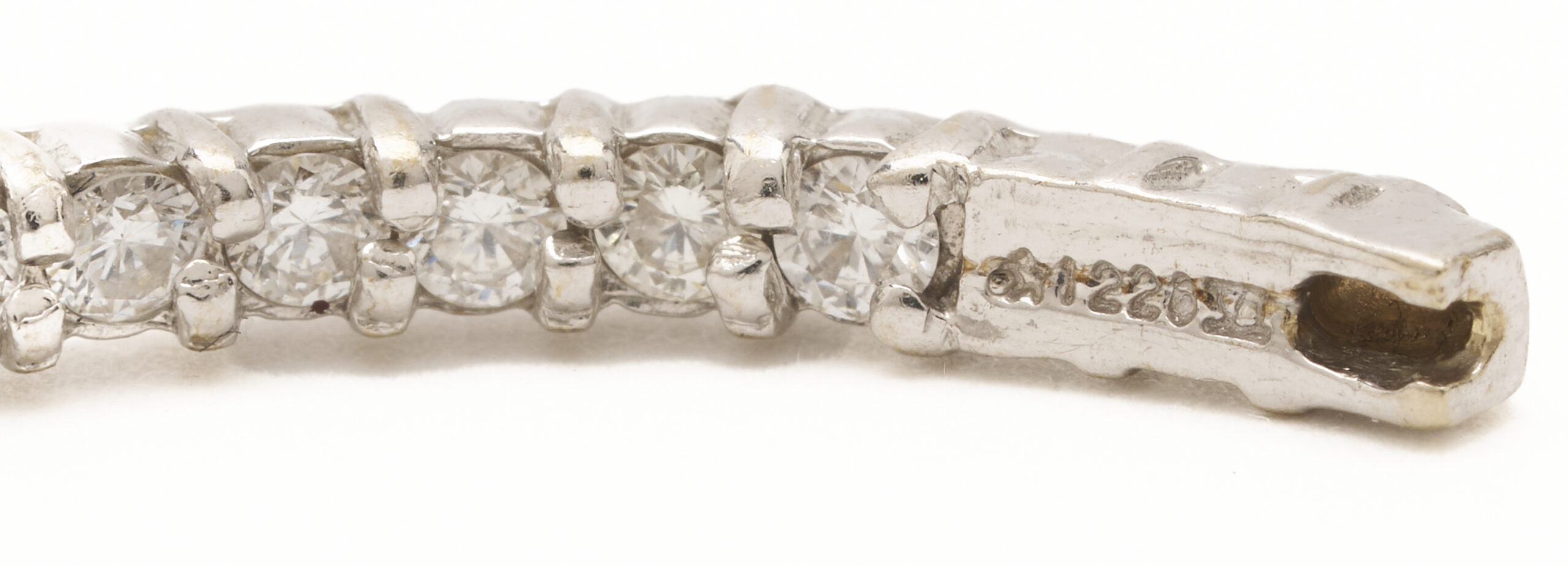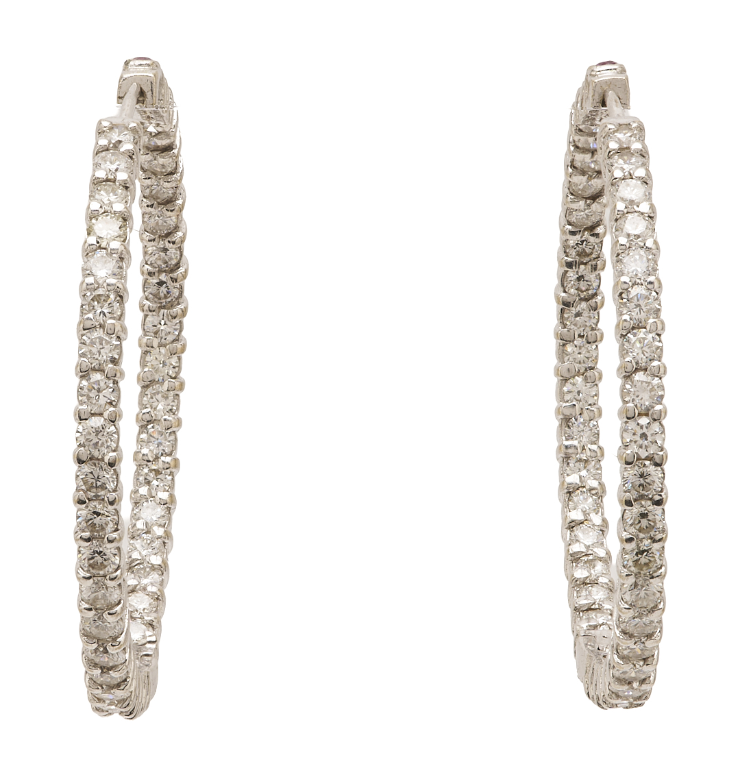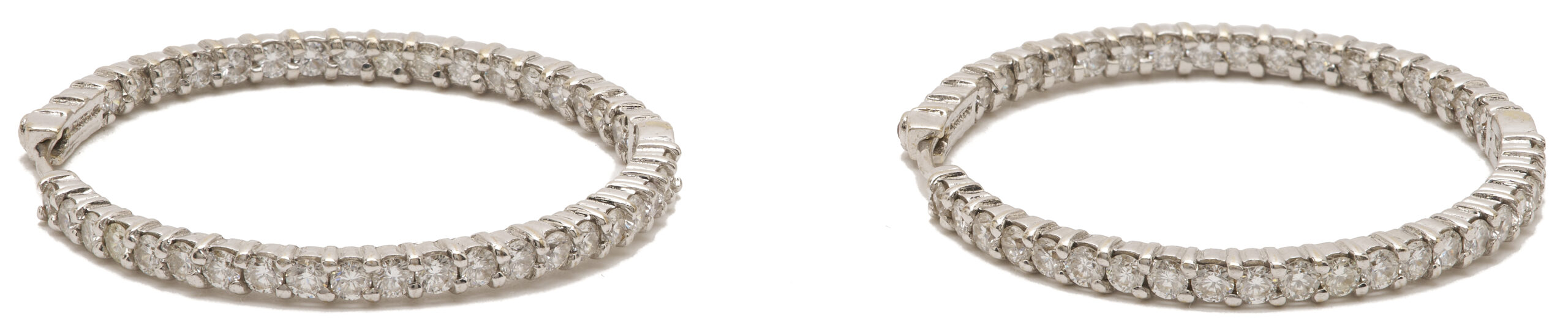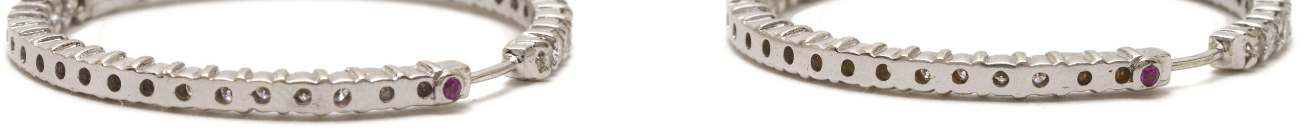 Ladies’ 18K white gold designer hoop earrings by Roberto Coin featuring seventy-six (76) round brilliant diamonds, approximately 4.56 carats together, Clarity-VS1, Color-G and two (2) natural rubies. The earrings are marked “18K star 1226 VI”. And XRF test 18K gold. The earrings are 1 3/8 in. x 1 3/8 in. and have a gross weight of 14.26 grams.
